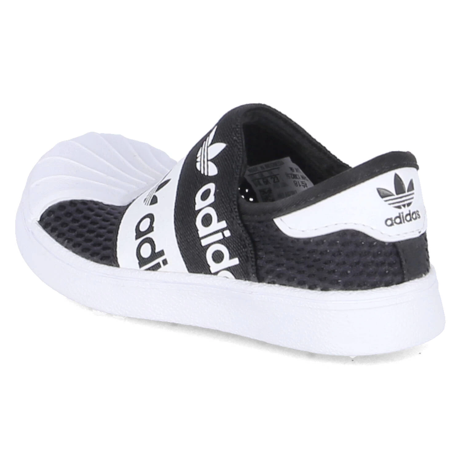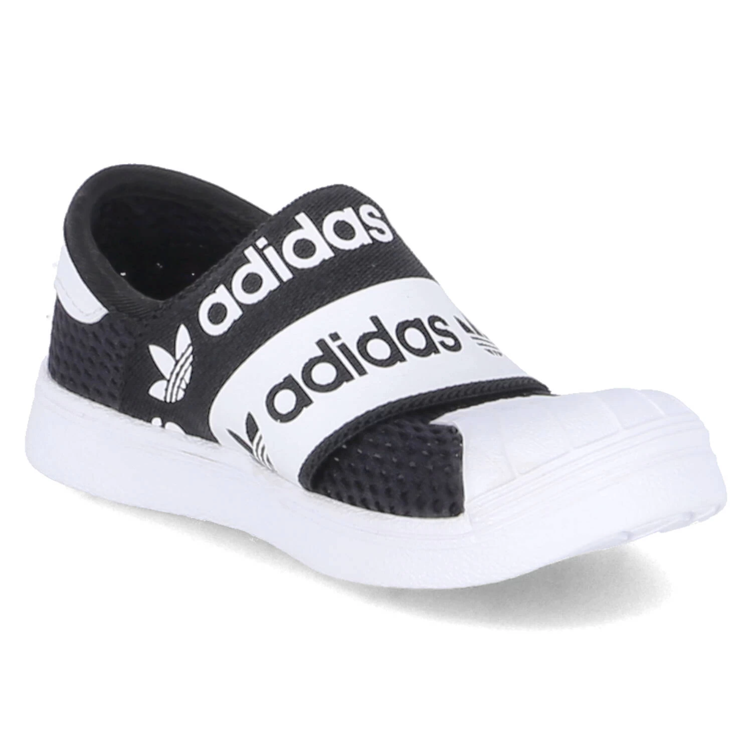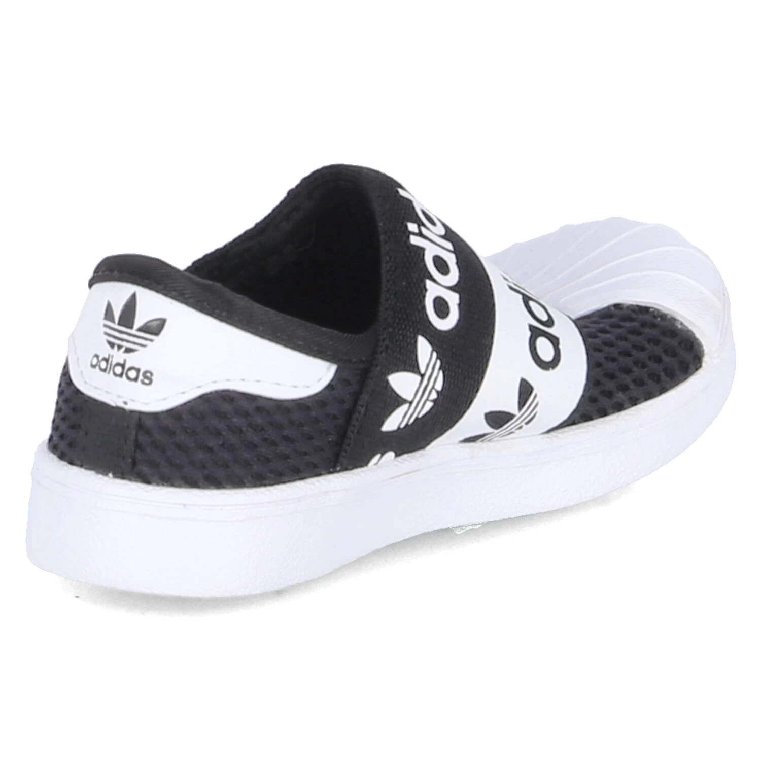 Adidas Kinder Low Sneaker/ Slipper SUPERSTAR SM R 360 Schwarz Textil-Synthetik-Mix – breites Elastikband mit Markenschriftzug über dem Spann – Obermaterial aus Mesh – gepolsterter Einstieg – verstärkter Fersen- und Zehenbereich – herausnehmbare, gepolsterte „Ortholite“-Decksohle – flexible, rutschhemmende Laufsohle