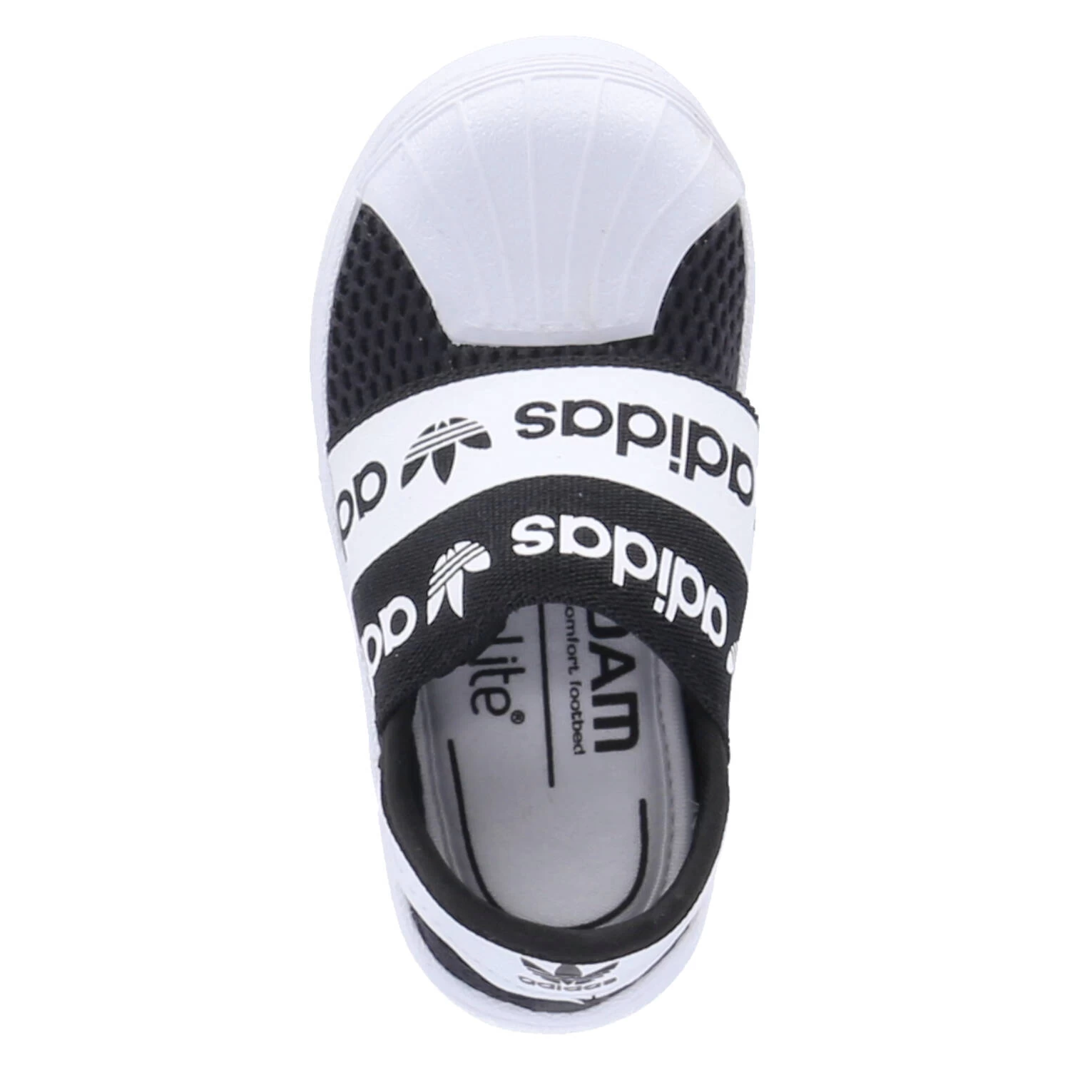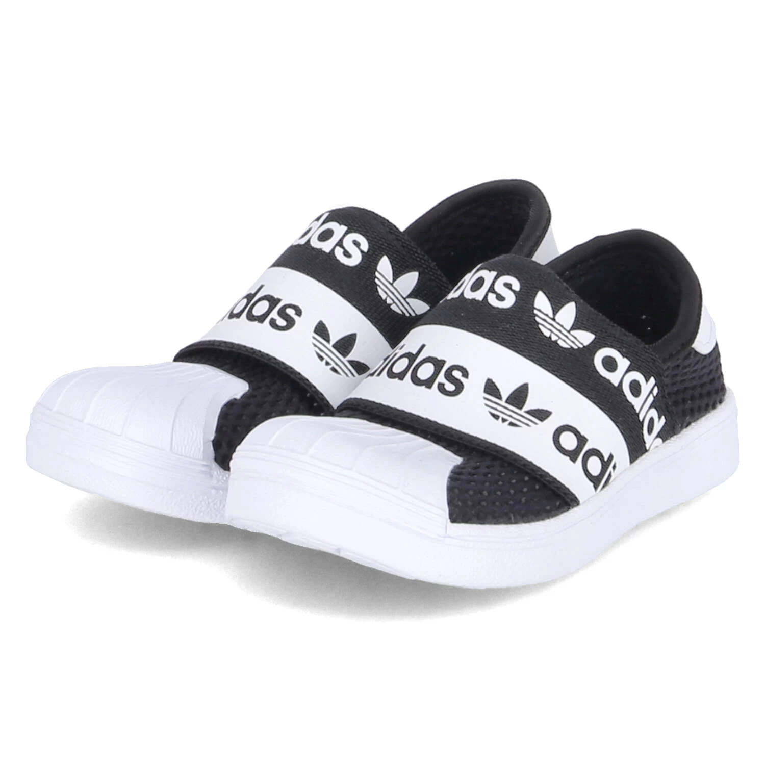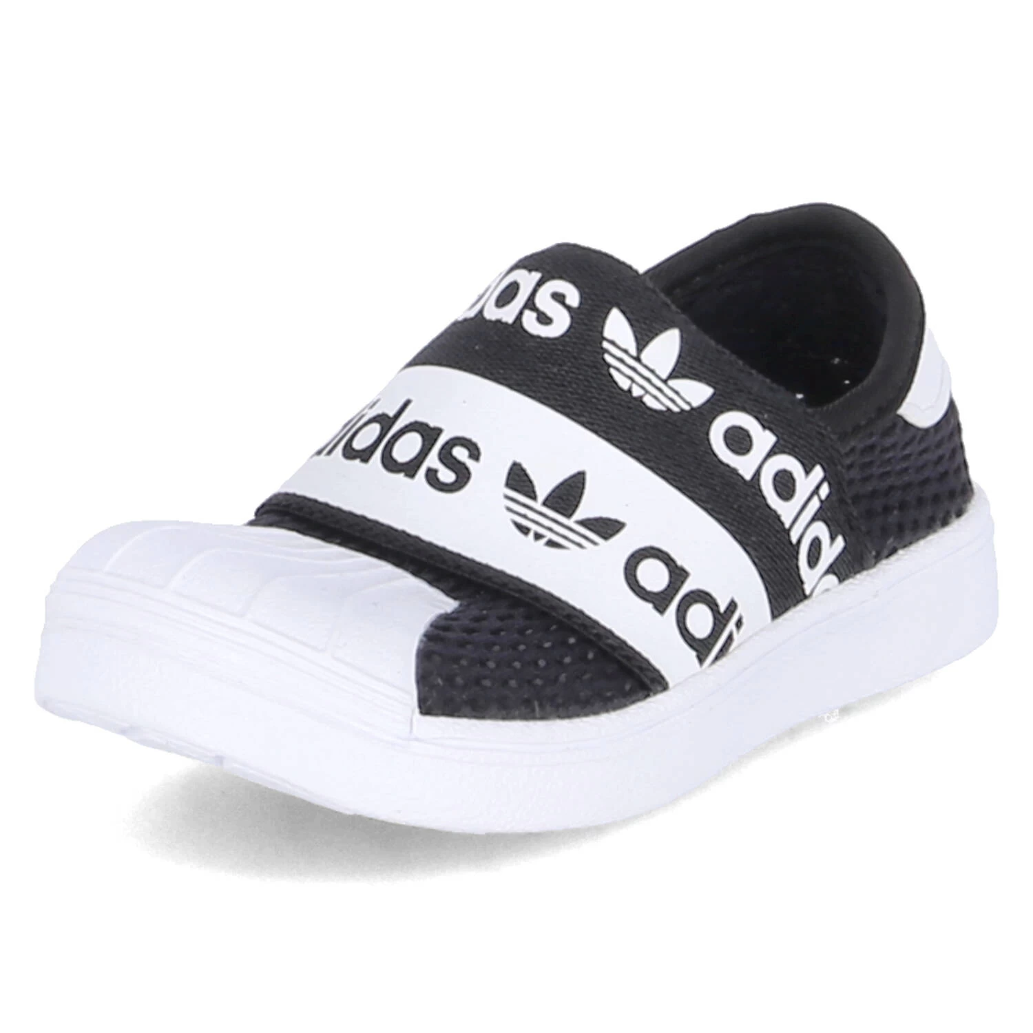 Adidas Kinder Low Sneaker/ Slipper SUPERSTAR SM R 360 Schwarz Textil-Synthetik-Mix – breites Elastikband mit Markenschriftzug über dem Spann – Obermaterial aus Mesh – gepolsterter Einstieg – verstärkter Fersen- und Zehenbereich – herausnehmbare, gepolsterte „Ortholite“-Decksohle – flexible, rutschhemmende Laufsohle
