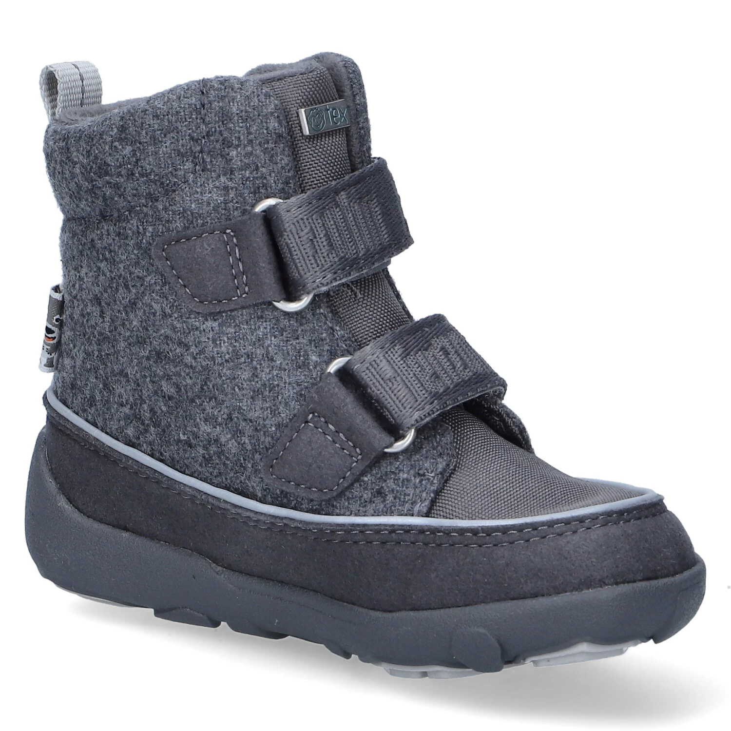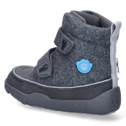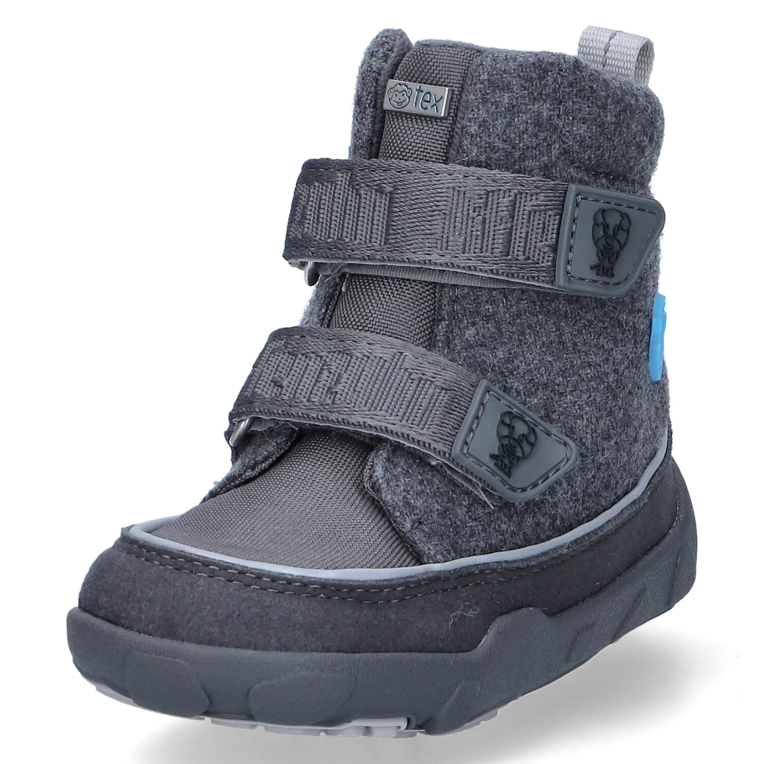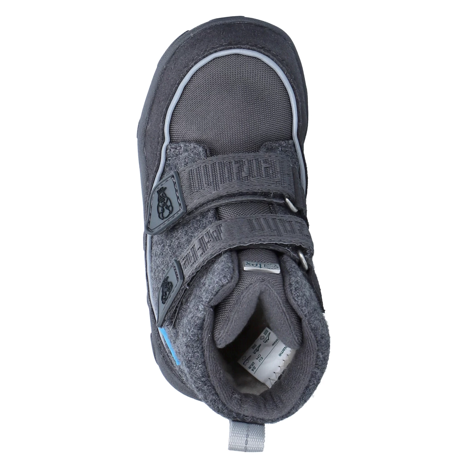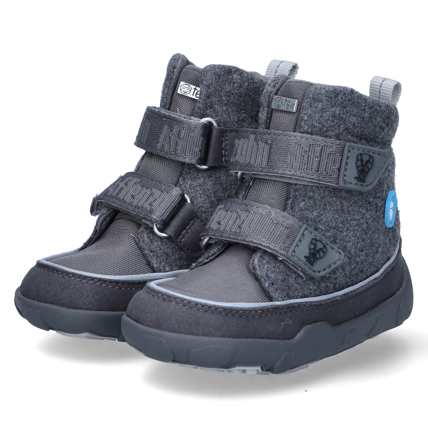 Affenzahn Kinder Stiefeletten/ Winterstiefeletten HUND Grau Textil-Synthetik-Mix – TexMembran (wasserdicht, atmungsaktiv) – Klettverschluss – gepolsterter Einstieg – warmes Wollfutter – Zierstreifen und -nähte – verstärkter Zehen- und Fersenbereich – Anziehlasche – gepolsterte Decksohle – flexible, rutschhemmende Laufsohle