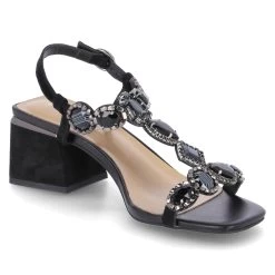 Alma en Pena Damen T-Steg-Sandaletten Schwarz Leder-Textil-Mix – vordere Riemen mit edlem Kunststeinbesatz – Knöchelriemen mit Dornverschluss – dezent gepolsterte Decksohle – Metallelemente in Titanoptik – rutschhemmende Laufsohle – stabiler Blockabsatz