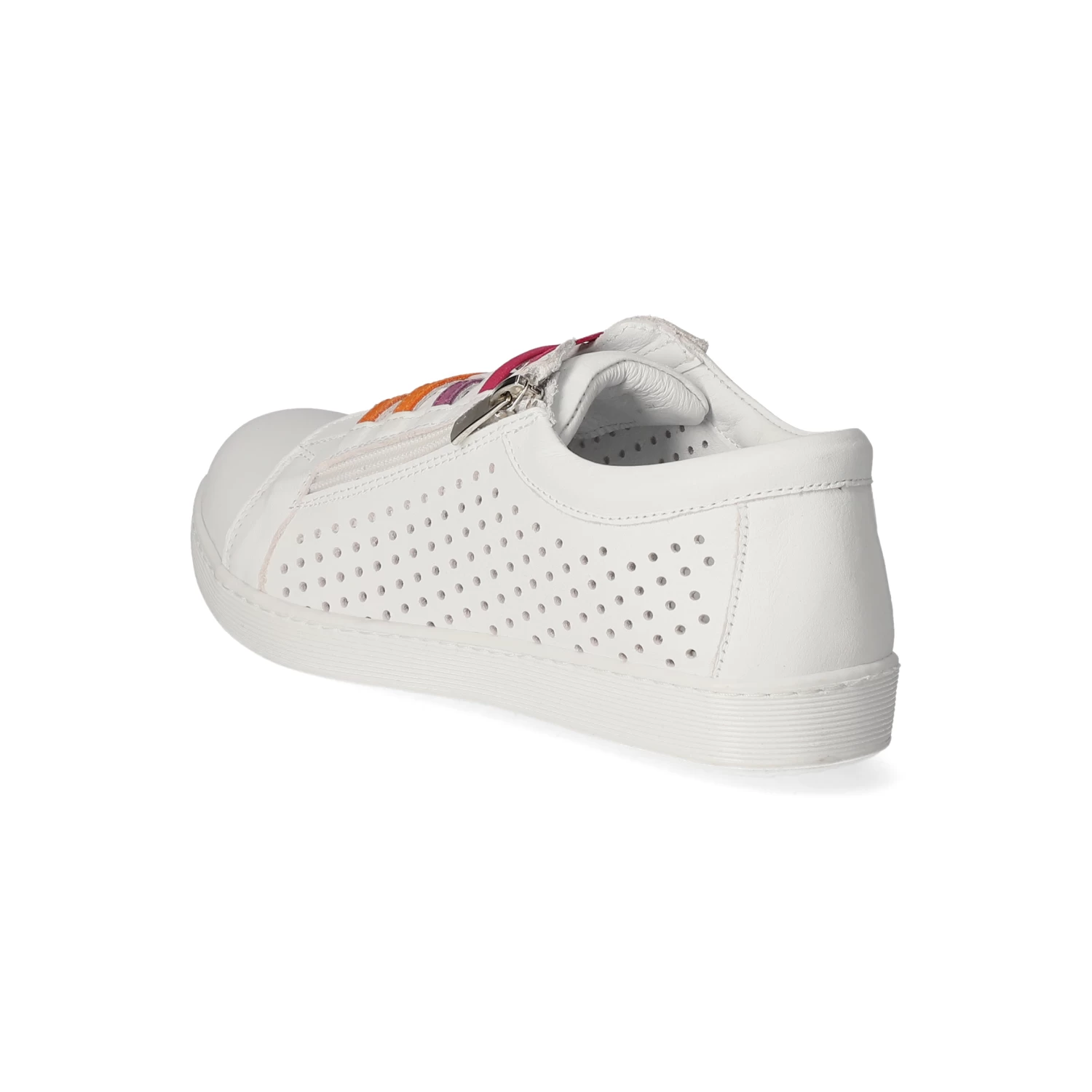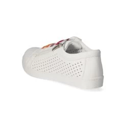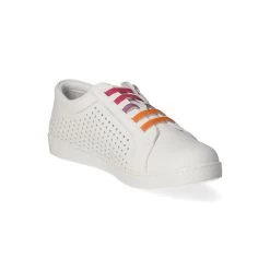 Andrea Conti Damen Low Sneaker WeiĂź Glattleder – Teile in modischer Lochung – bunte Elastikbänder ĂĽber dem Spann – ReiĂźverschluss – verstärkter Zehenbereich – angenehmes Lederfutter – gepolsterte Wechseldecksohle – flexible, rutschhemmende Laufsohle mit leichtem Profil
