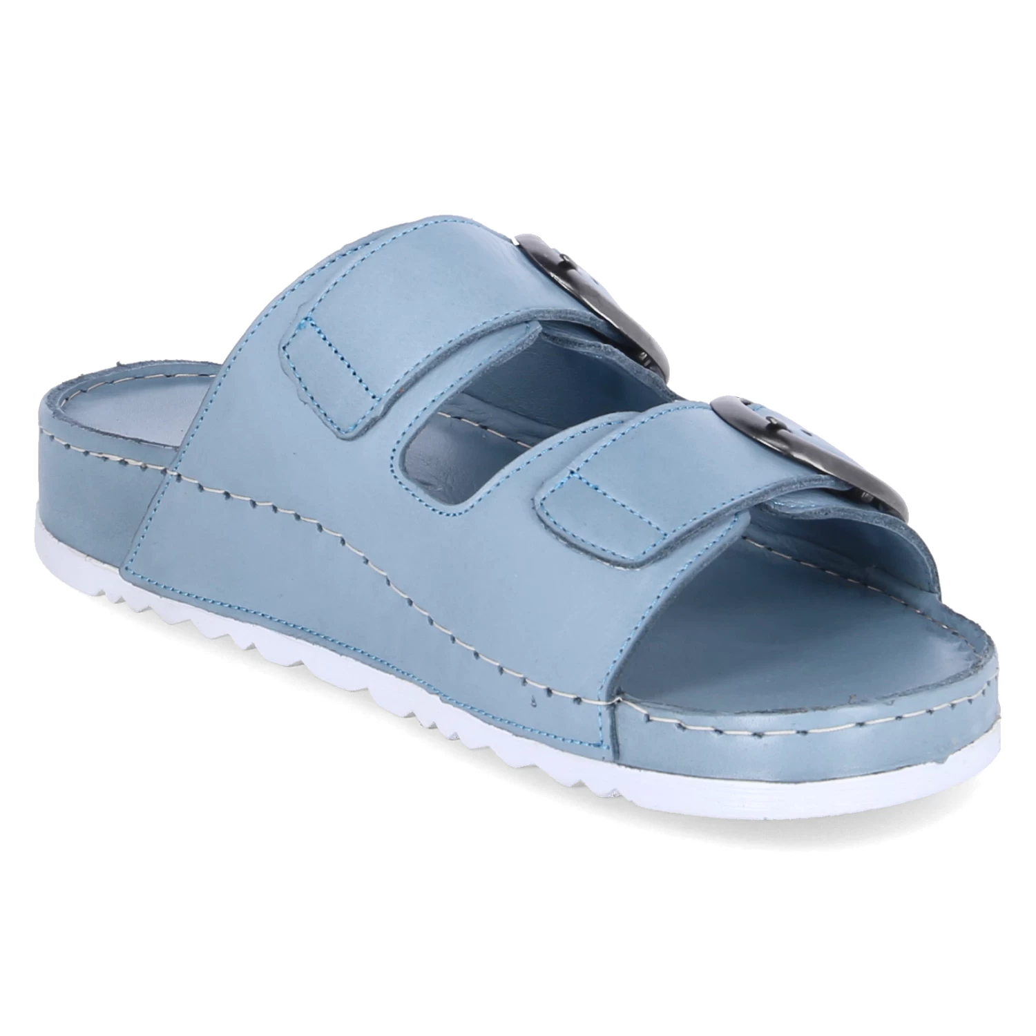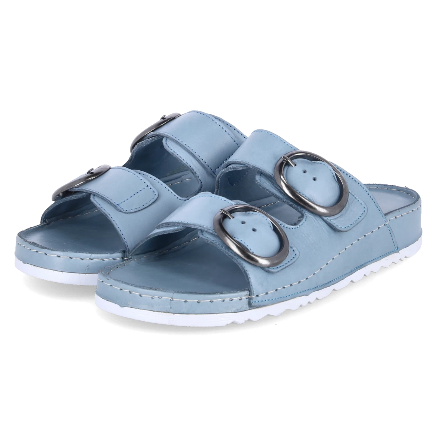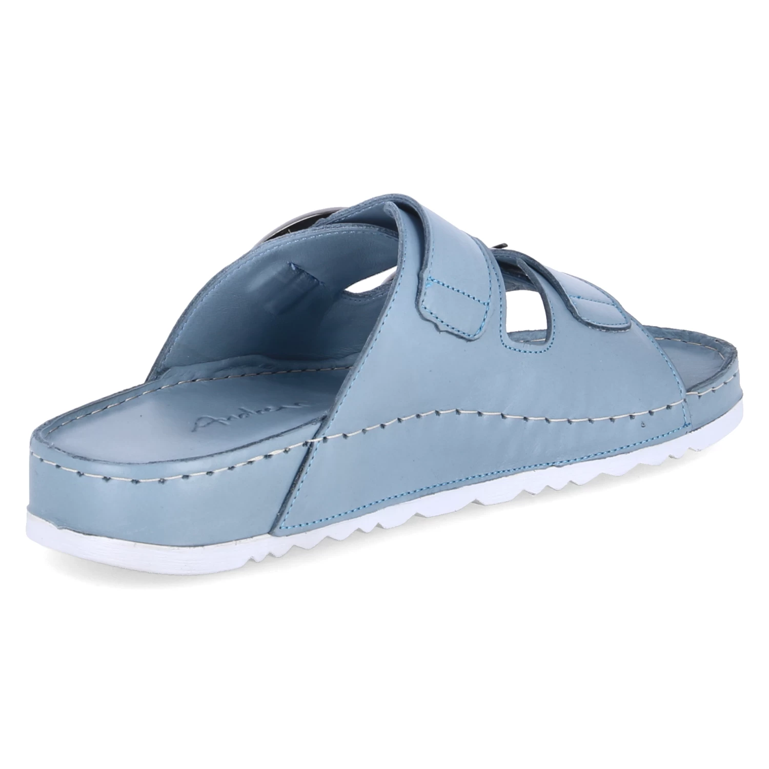 Andrea Conti Damen Pantoletten Blau Leder – zwei Schnallen mit Elastikeinsatz – vorgeformtes, gepolstertes FuĂźbett mit Lederbezug – flexible Laufsohle mit Profil – Ziernähte