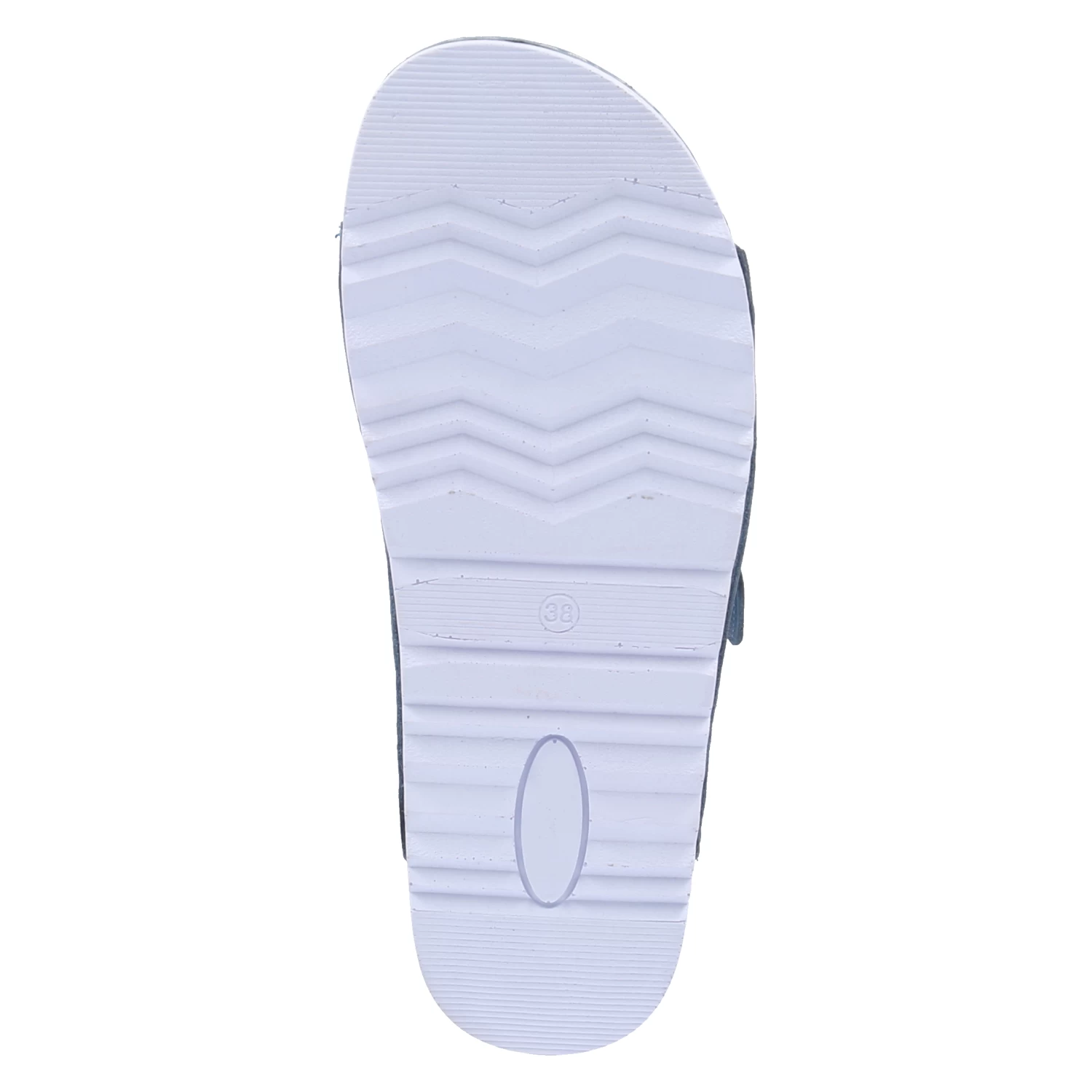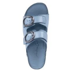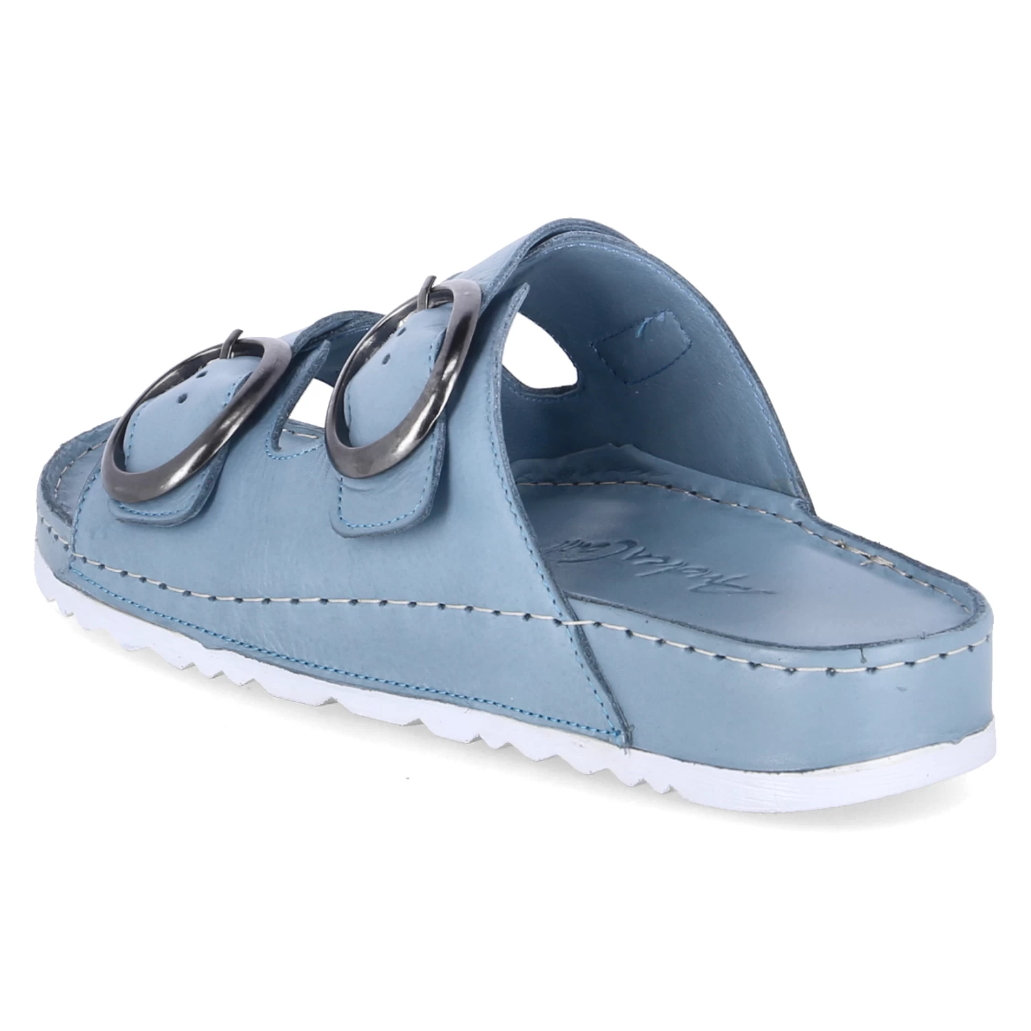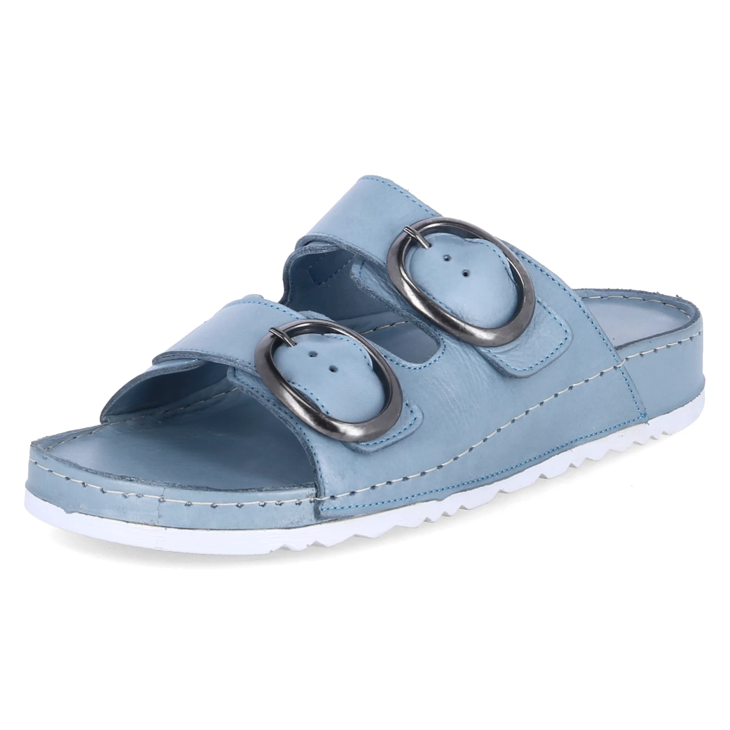 Andrea Conti Damen Pantoletten Blau Leder – zwei Schnallen mit Elastikeinsatz – vorgeformtes, gepolstertes FuĂźbett mit Lederbezug – flexible Laufsohle mit Profil – Ziernähte