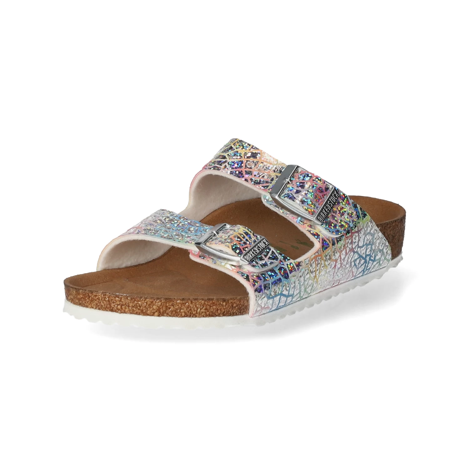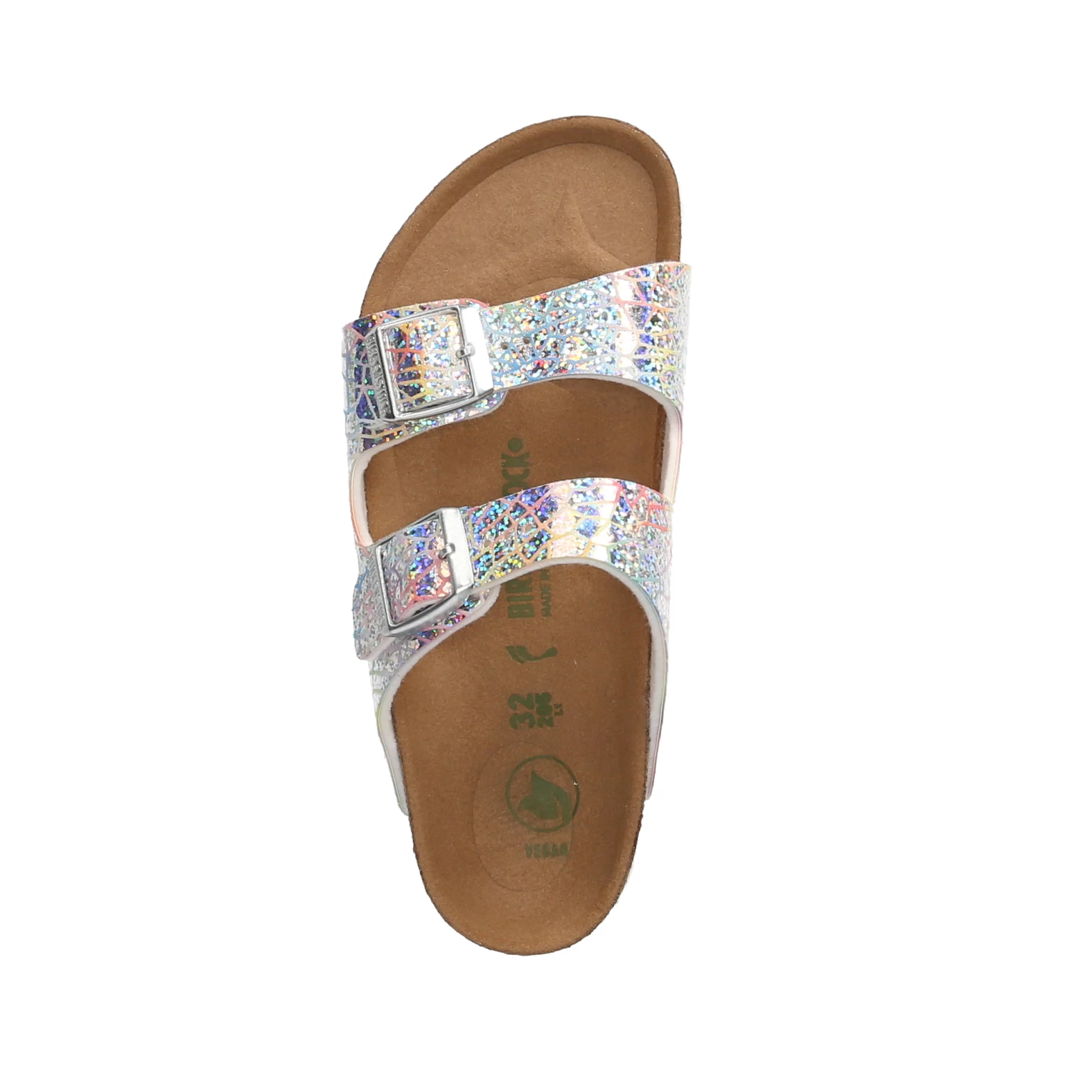 Birkenstock Mädchen Pantoletten ARIZONA Silber Synthetik – vegane Schuhe – buntes Muster – Riemen mit Schnalle und Dornverschluss – vorgeformtes TieffuĂźbett mit Decksohle – robuste, rutschhemmende Profilsohle