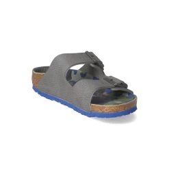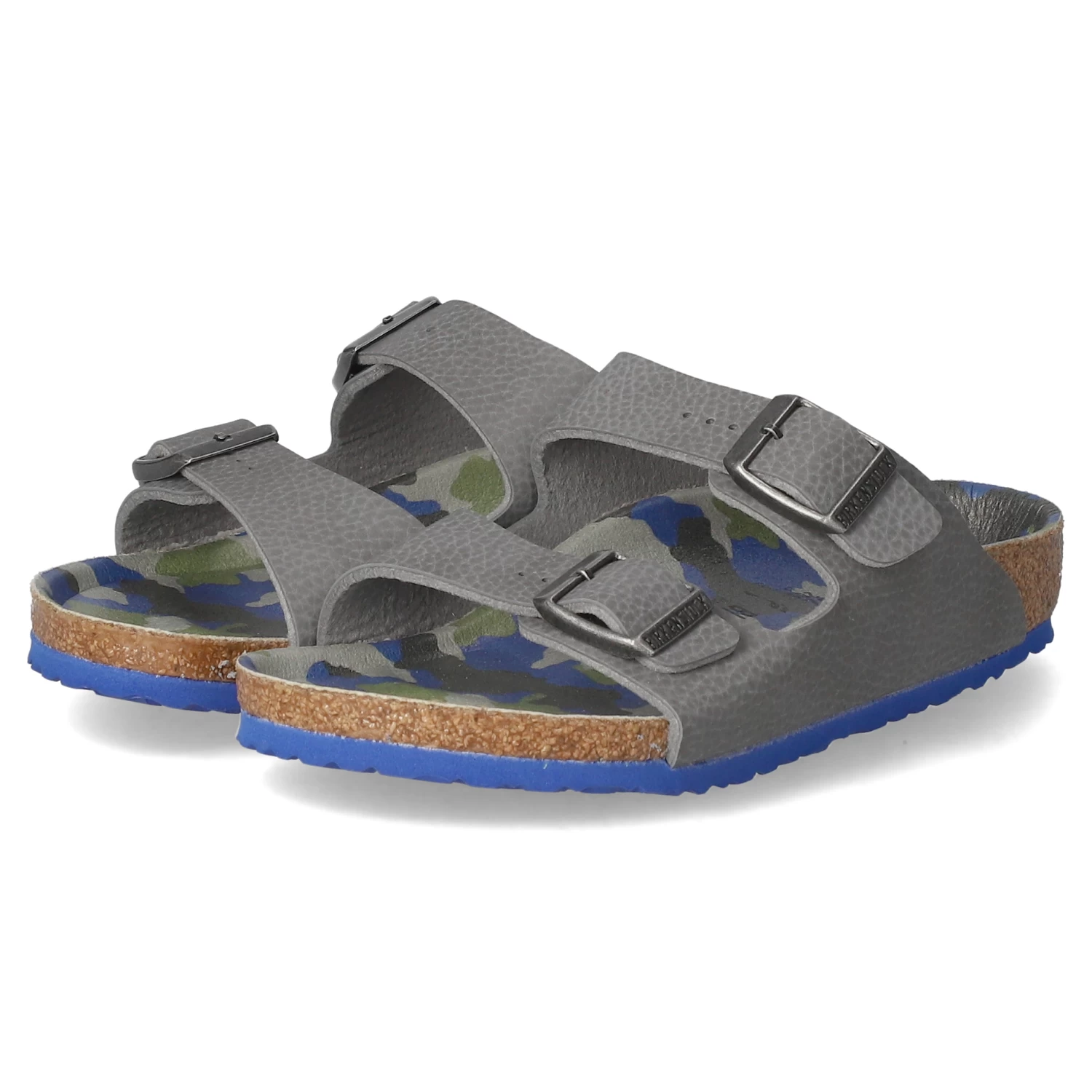 Birkenstock Jungen Pantoletten ARIZONA Grau Synthetik – Riemen mit Schnalle und Dornverschluss – vorgeformtes TieffuĂźbett mit Decksohle – robuste, rutschhemmende Profilsohle