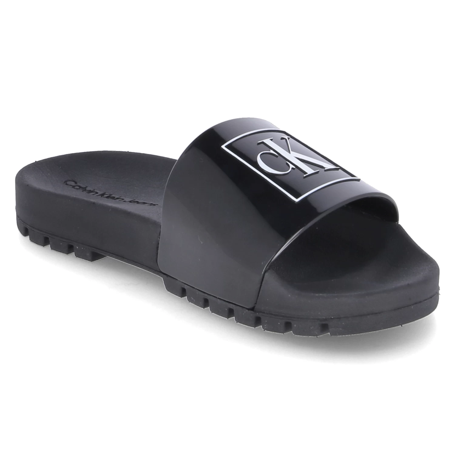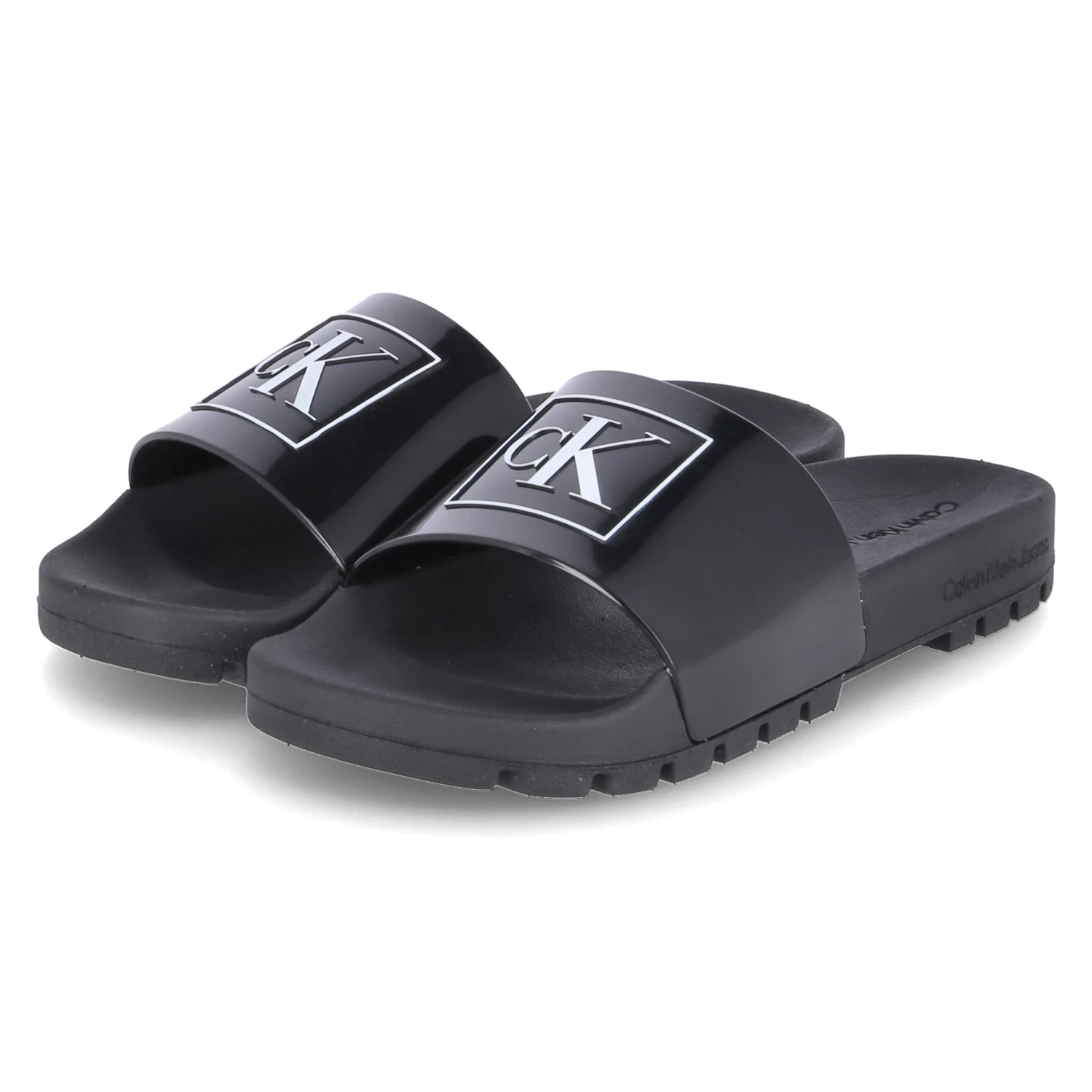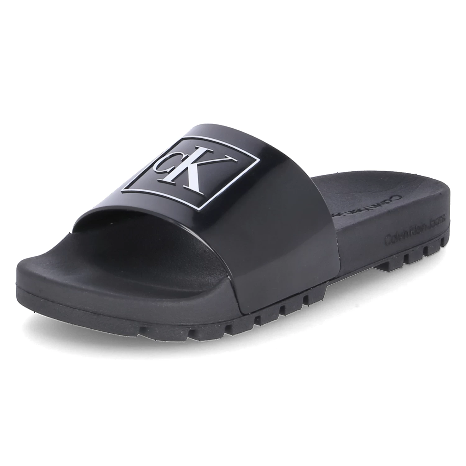 Calvin Klein Jeans Damen Pantoletten/ Badelatschen TRUCK SLIDE MONOGRAM RUBBER Schwarz Synthetik in Lack – CK-Print – vorgeformtes, weiches TieffuĂźbett – Profilsohle