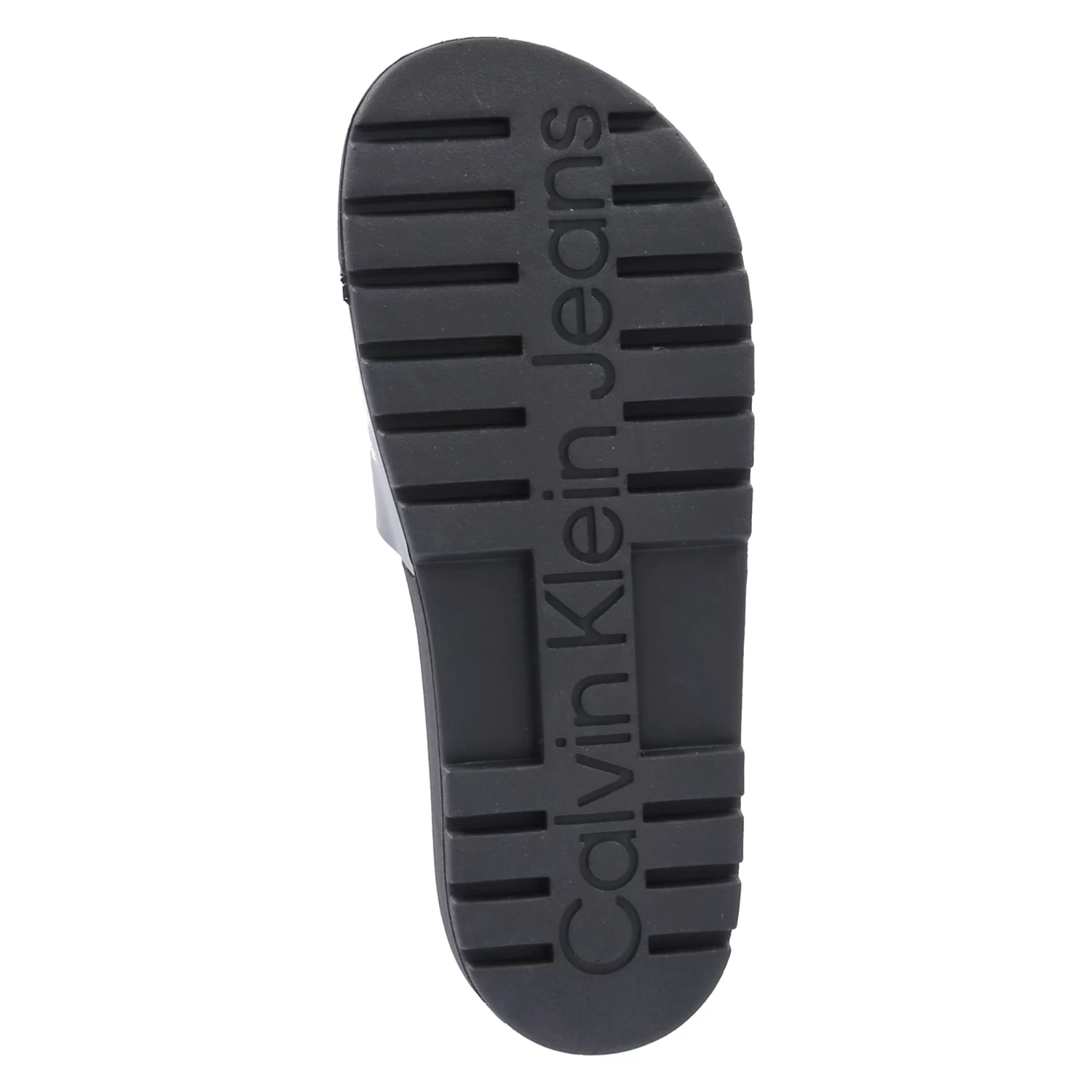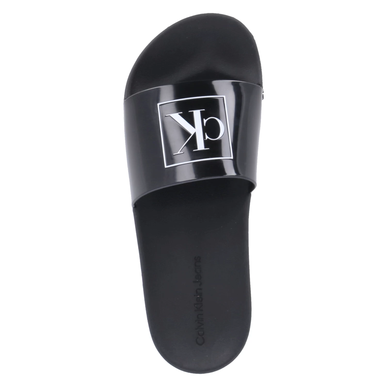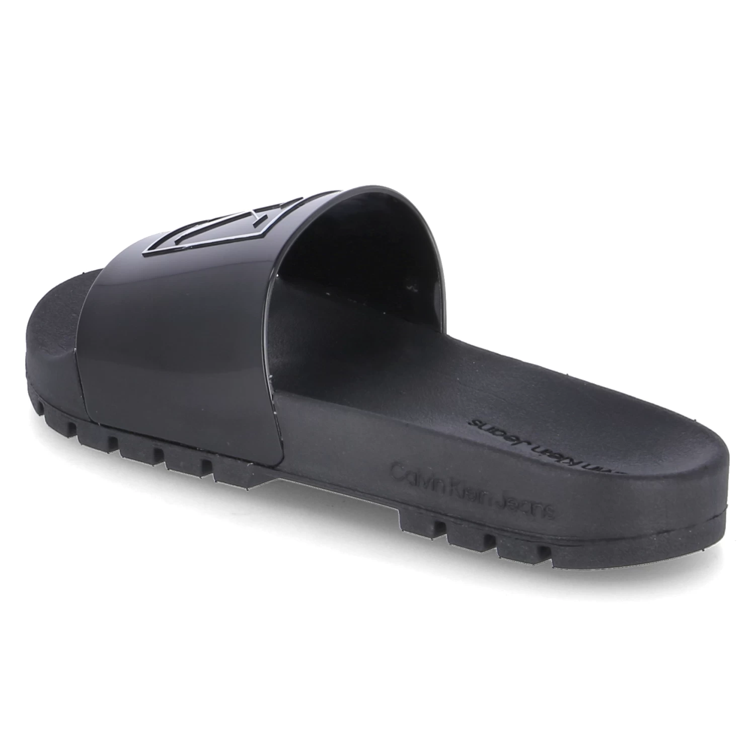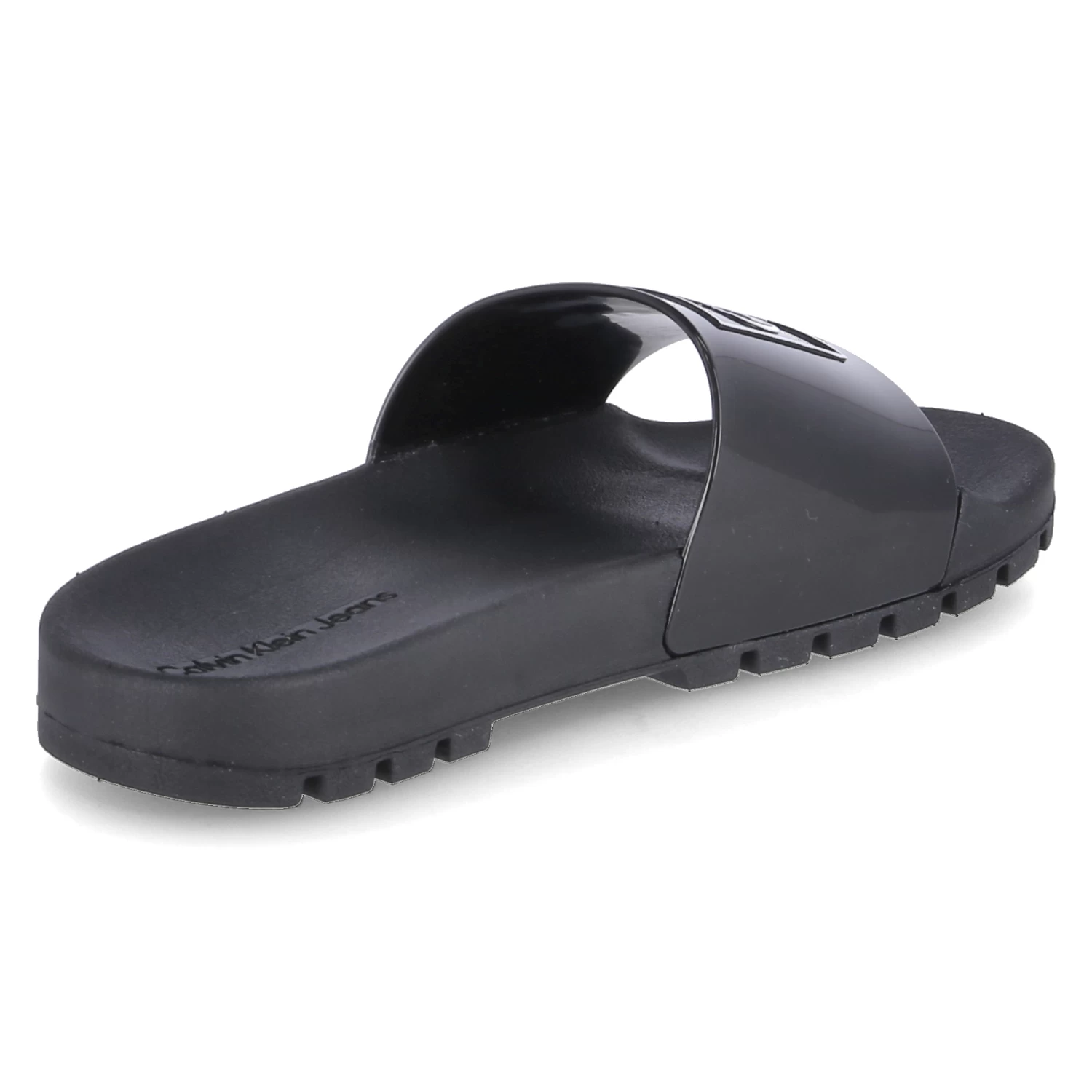 Calvin Klein Jeans Damen Pantoletten/ Badelatschen TRUCK SLIDE MONOGRAM RUBBER Schwarz Synthetik in Lack – CK-Print – vorgeformtes, weiches TieffuĂźbett – Profilsohle