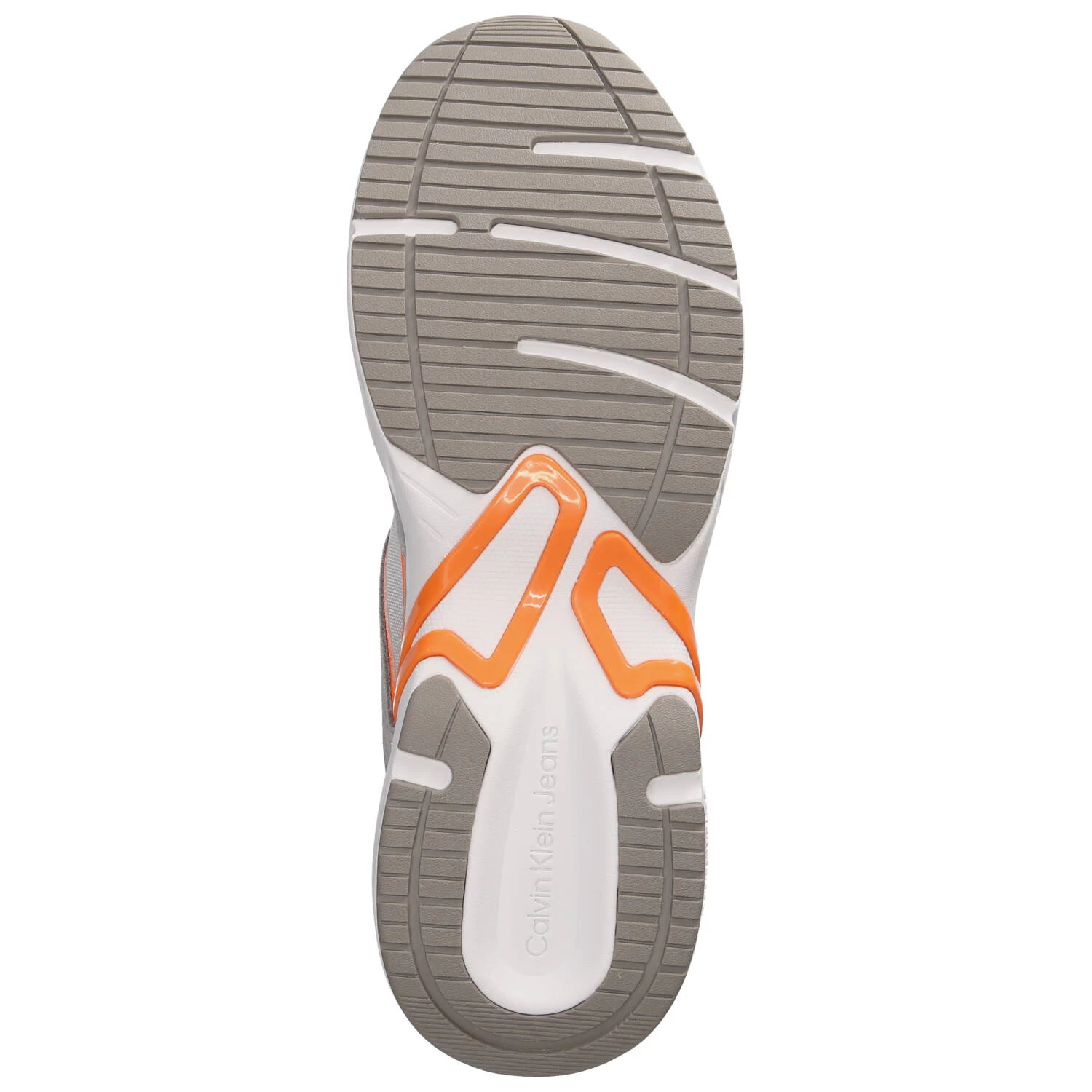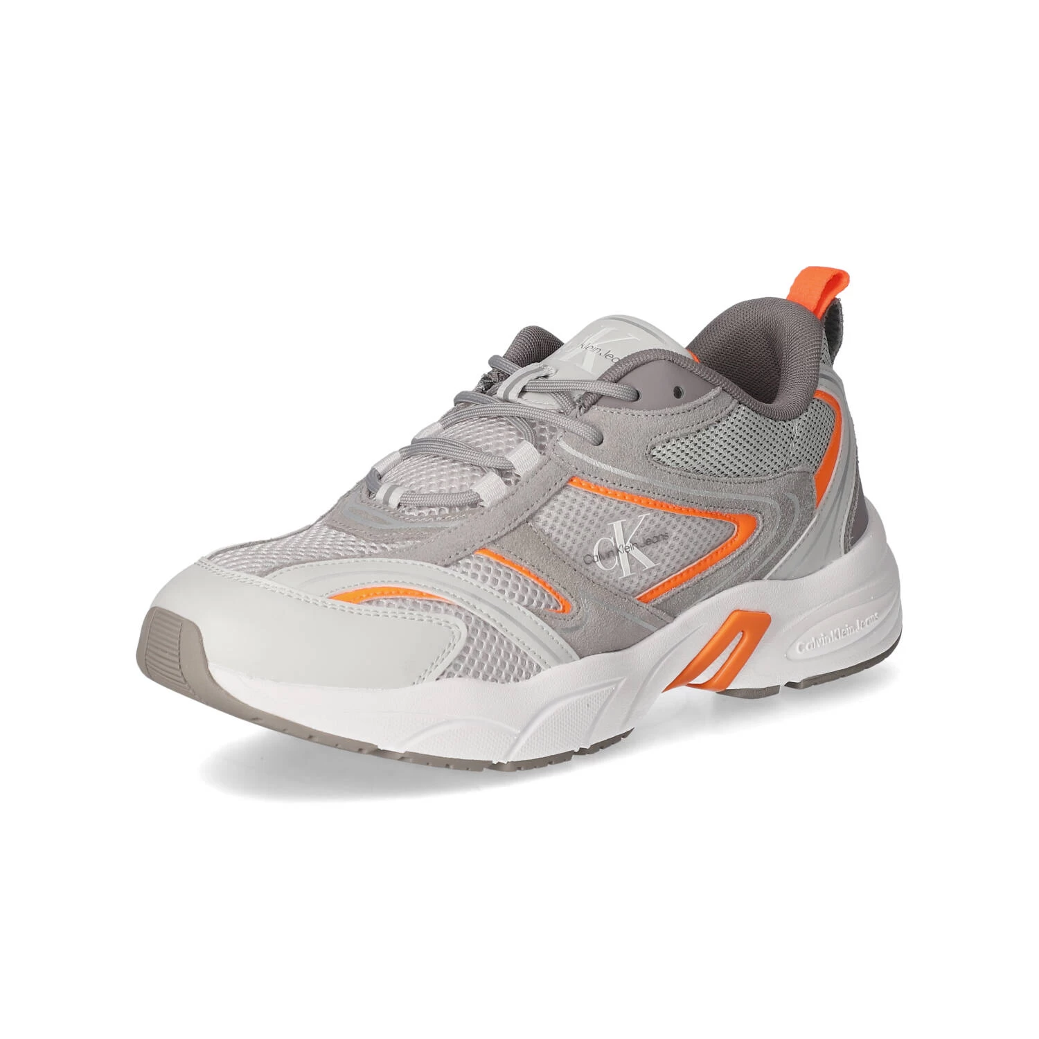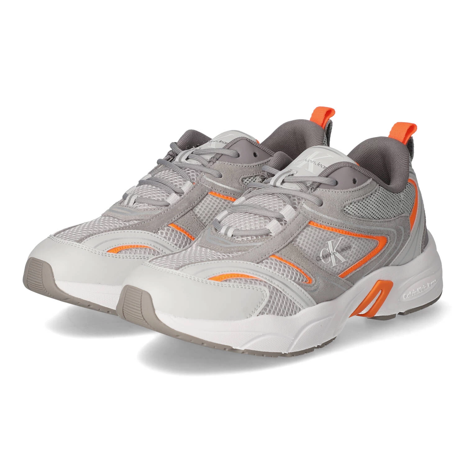 Calvin Klein Jeans Herren Low Sneaker Grau Leder-Textil-Mix – sportliches Design – orange Highlights – typische Markendetails – SchnĂĽrung – Anziehlasche – verstärkter Zehen- und Fersenbereich – gepolsterter Einstieg – leichtes Textilfutter – gepolsterte Decksohle – flexible, rutschhemmende Profilsohle