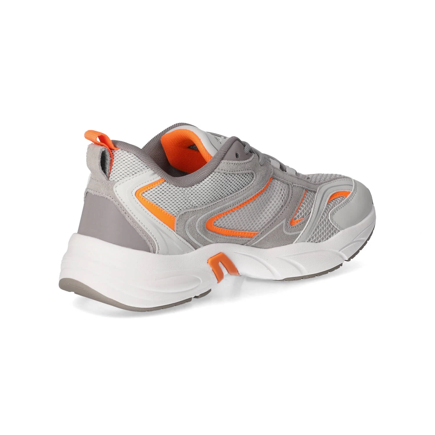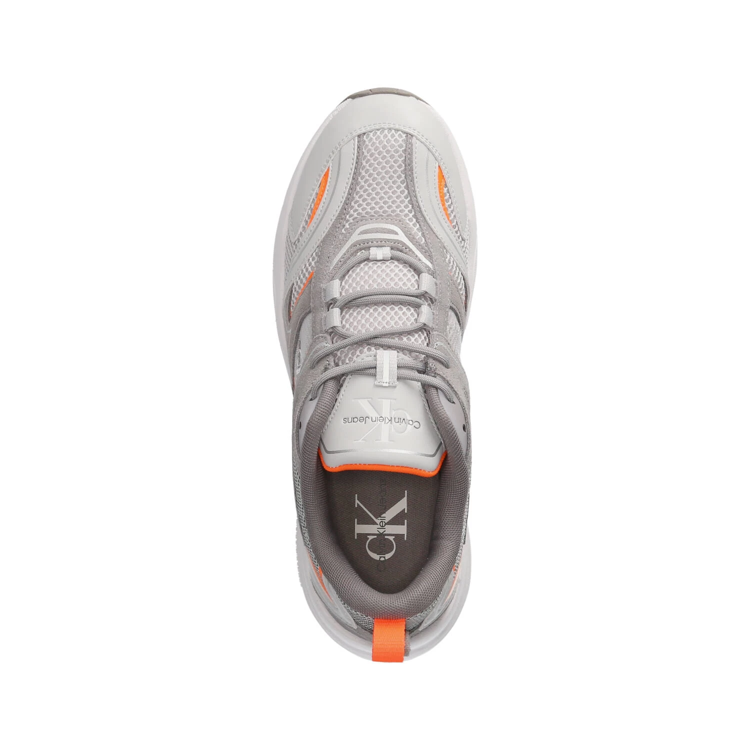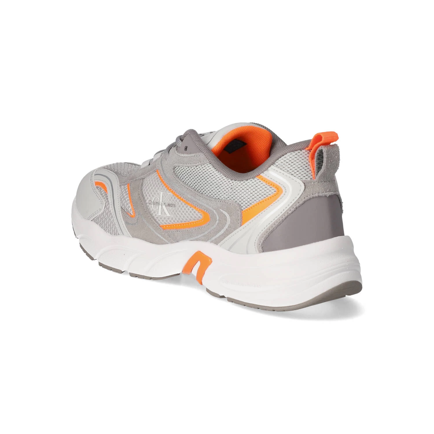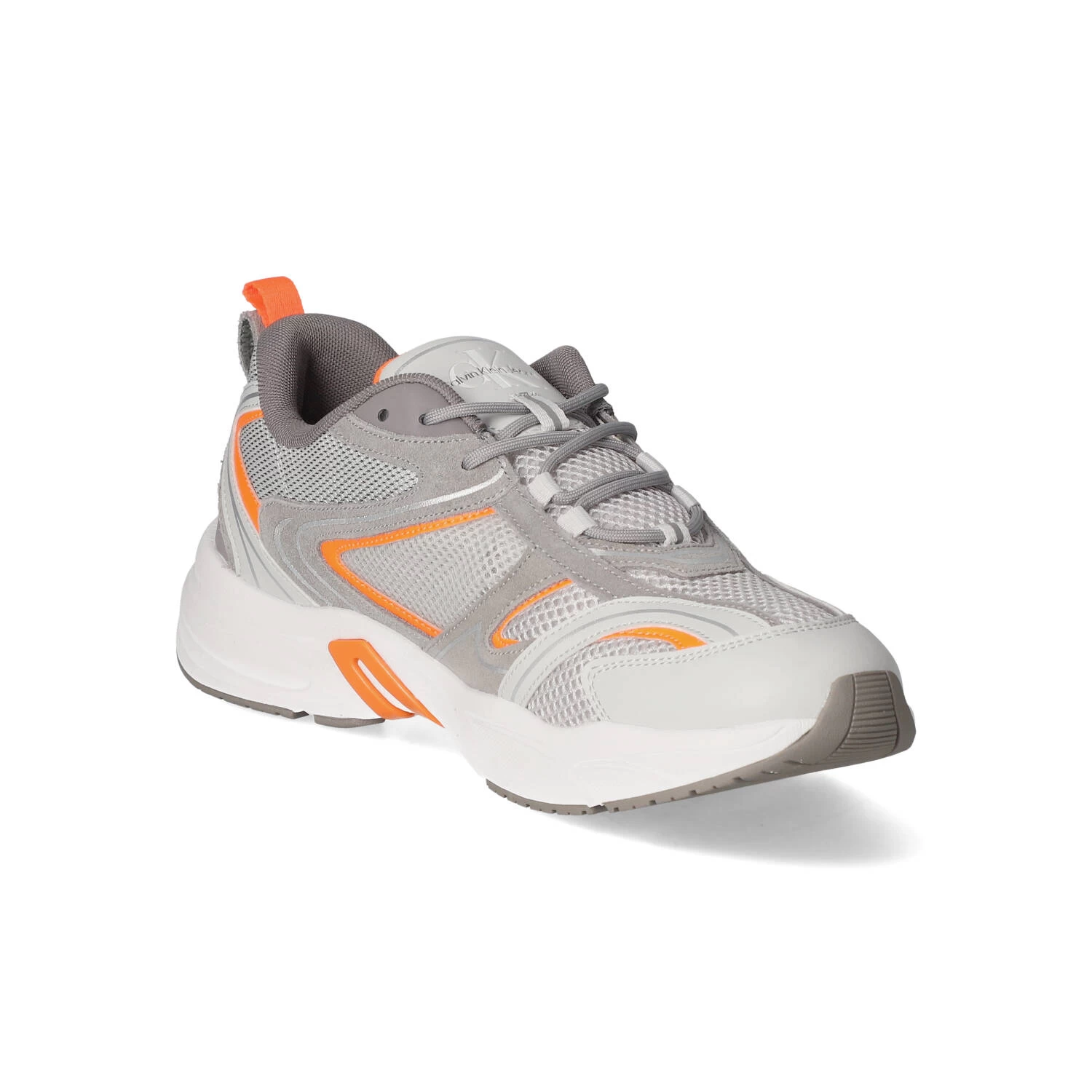 Calvin Klein Jeans Herren Low Sneaker Grau Leder-Textil-Mix – sportliches Design – orange Highlights – typische Markendetails – SchnĂĽrung – Anziehlasche – verstärkter Zehen- und Fersenbereich – gepolsterter Einstieg – leichtes Textilfutter – gepolsterte Decksohle – flexible, rutschhemmende Profilsohle