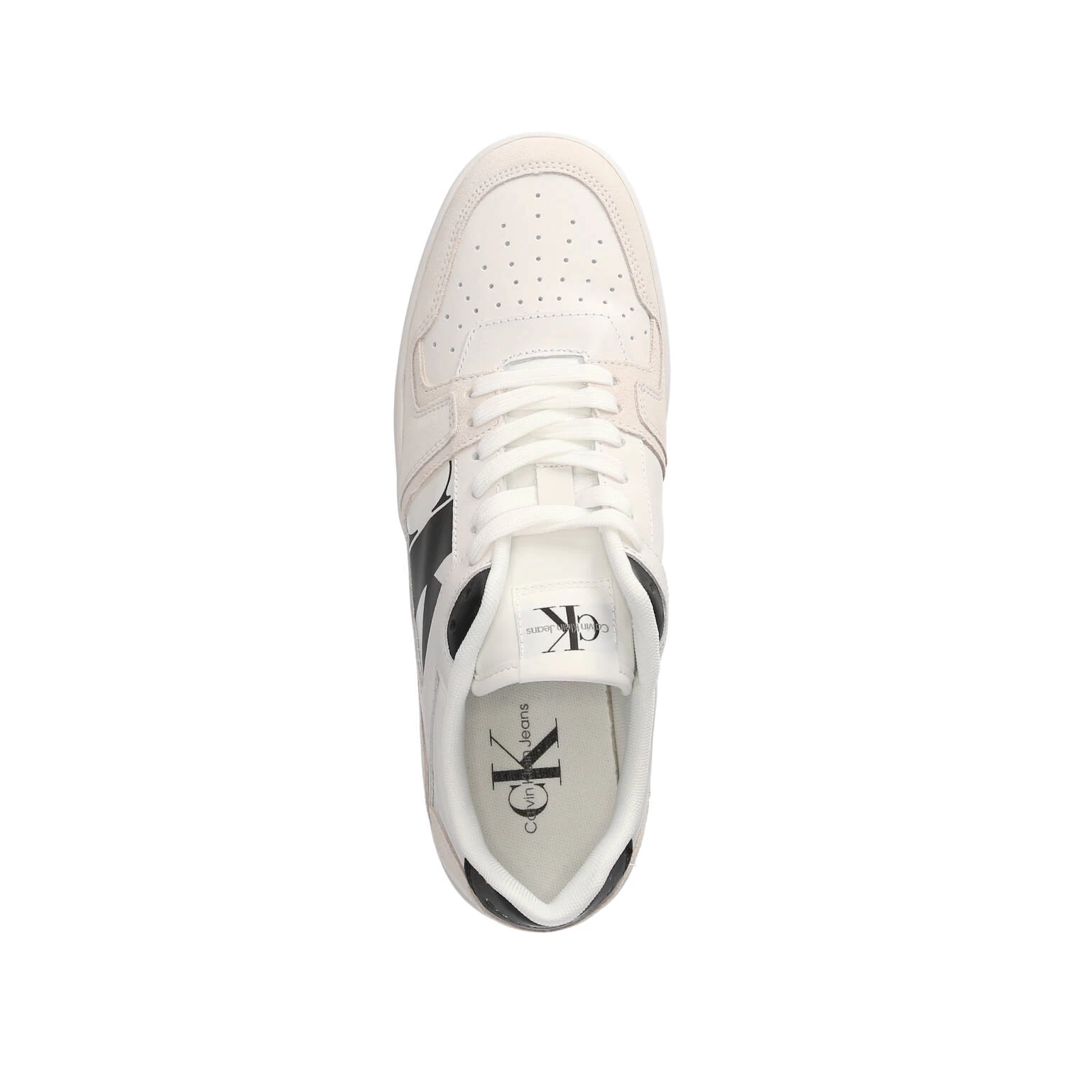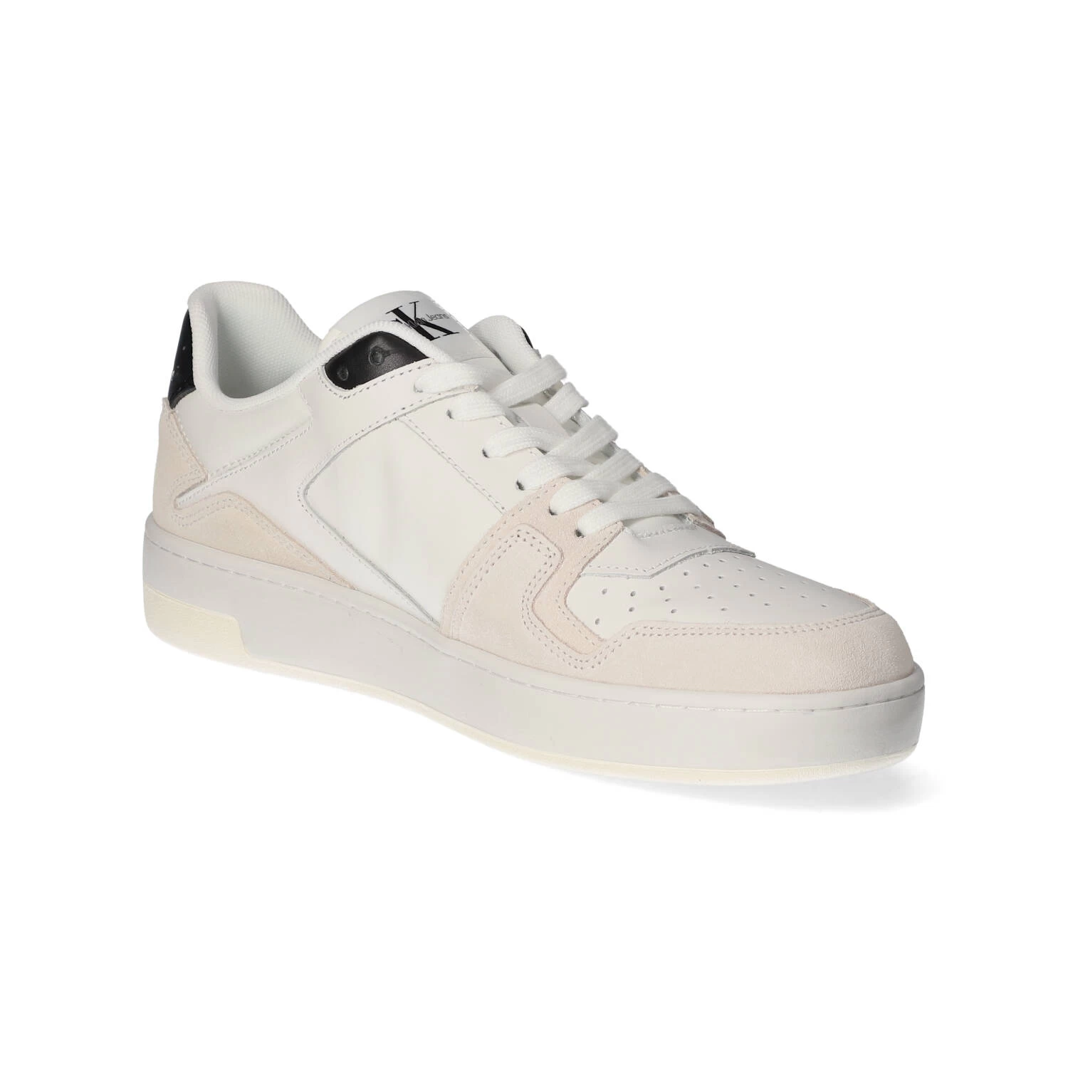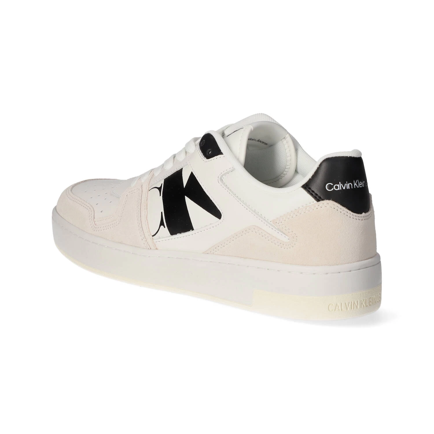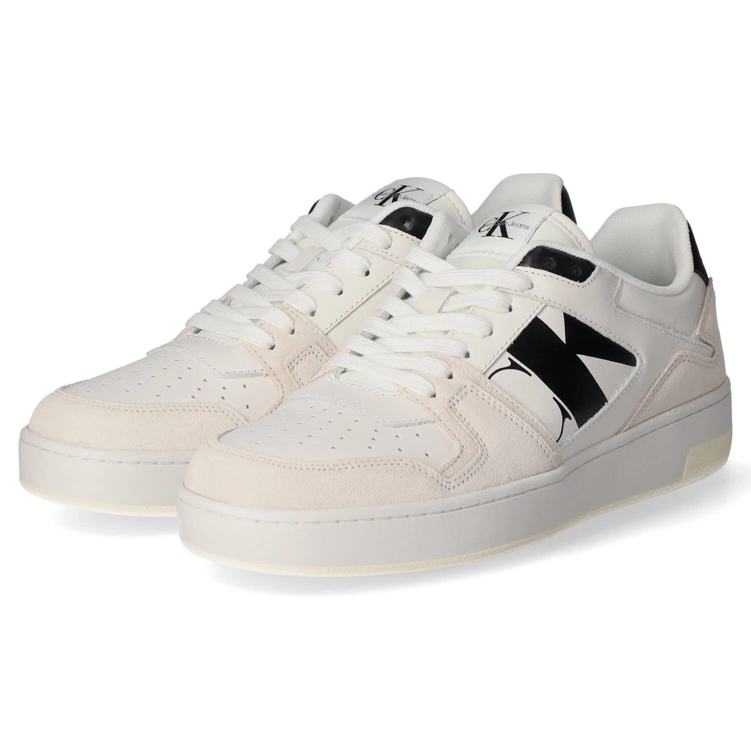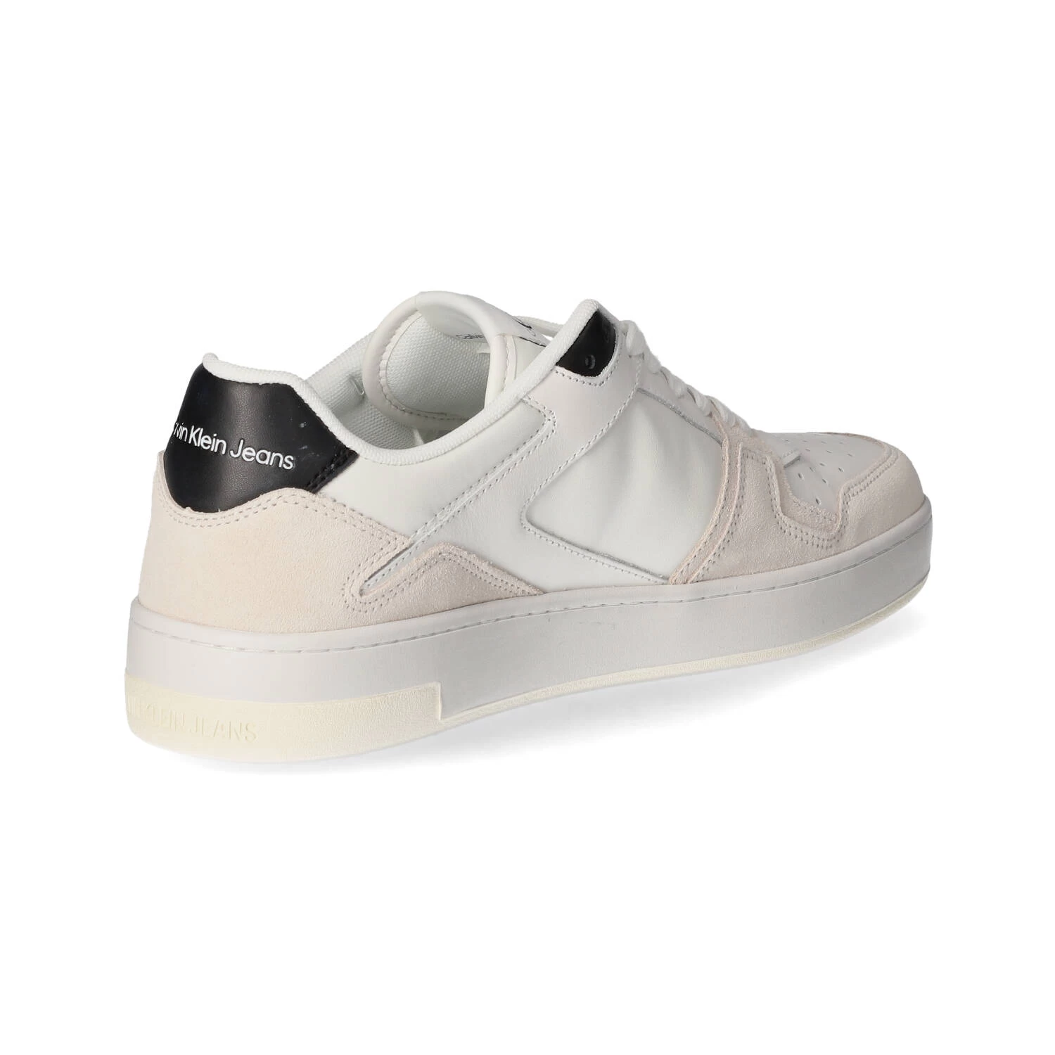 Calvin Klein Jeans Herren Low Sneaker WeiĂź Leder-Synthetik-Mix – sportliches Design – typische Markendetails – schwarze und beige Highlights – SchnĂĽrung – verstärkter Zehen- und Fersenbereich – gepolsterter Einstieg – leichtes Textilfutter – gepolsterte Decksohle – flexible, rutschhemmende Profilsohle