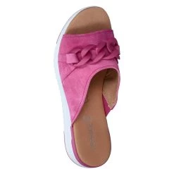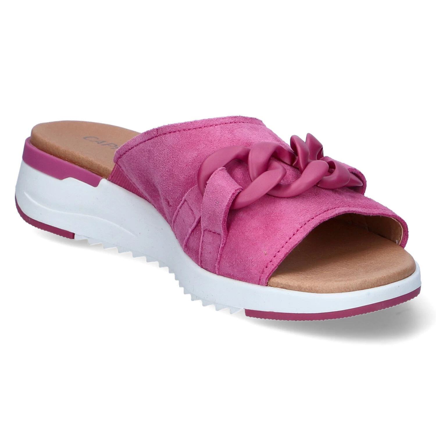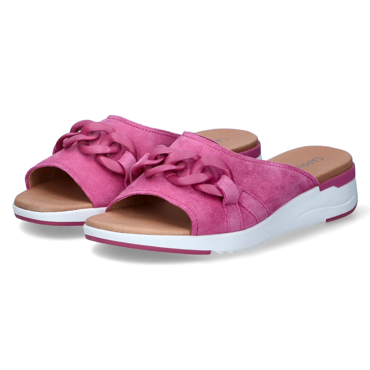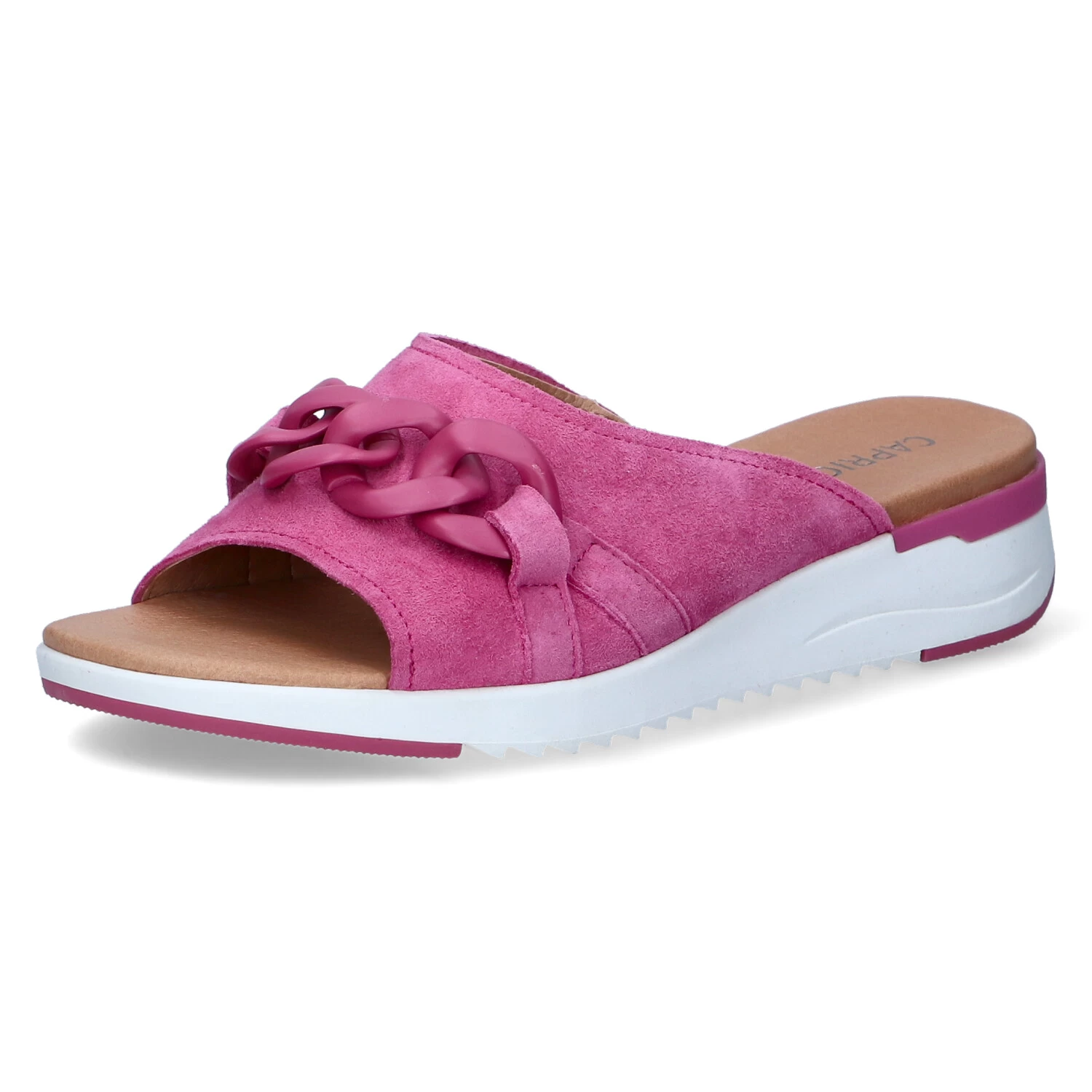 Caprice Damen Pantoletten Pink Rauleder – breiter Riemen mit Kettenelement ĂĽber dem Spann – Elastikeinsatz – leicht gepolsterte, vorgeformte Lederdecksohle – flexible, rutschhemmende Profilsohle