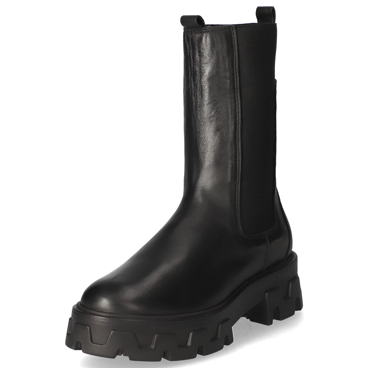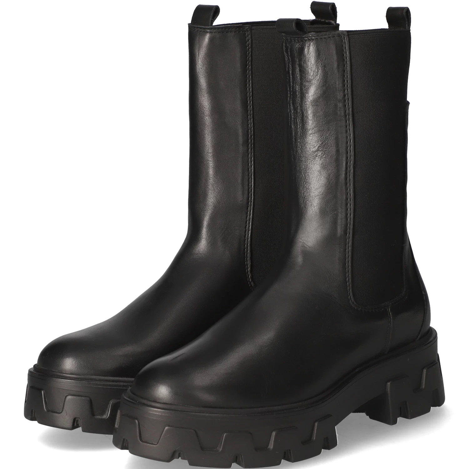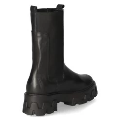 Empor Damen Chelsea Boots/ Stiefeletten Schwarz Glattleder – seitliche Elastikeinsätze am Schaft – modische Ziernähte – zwei Anziehlaschen – angenehmes Textilfutter – gepolsterte Decksohle – robuste, rutschhemmende Profilsohle – Plateau von ca. 3 cm