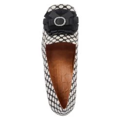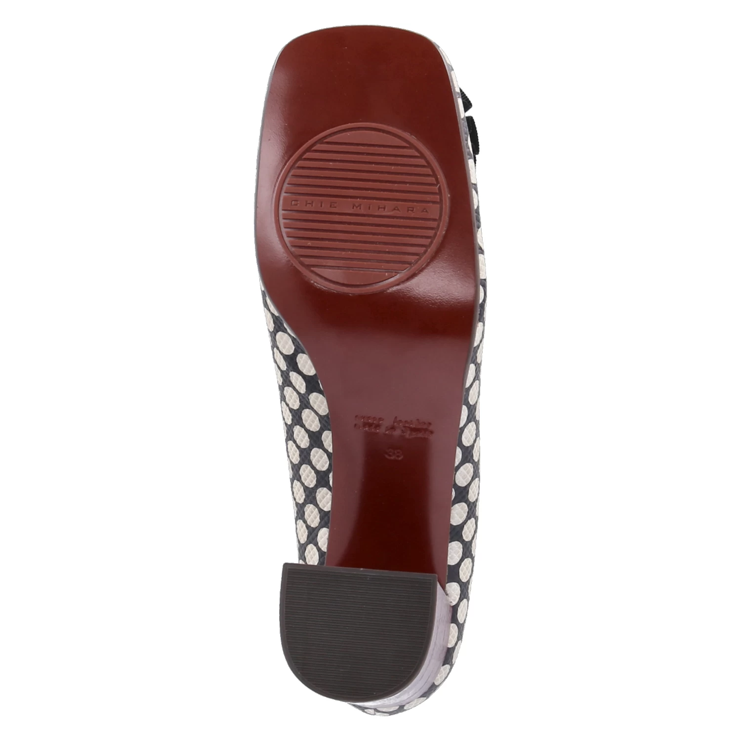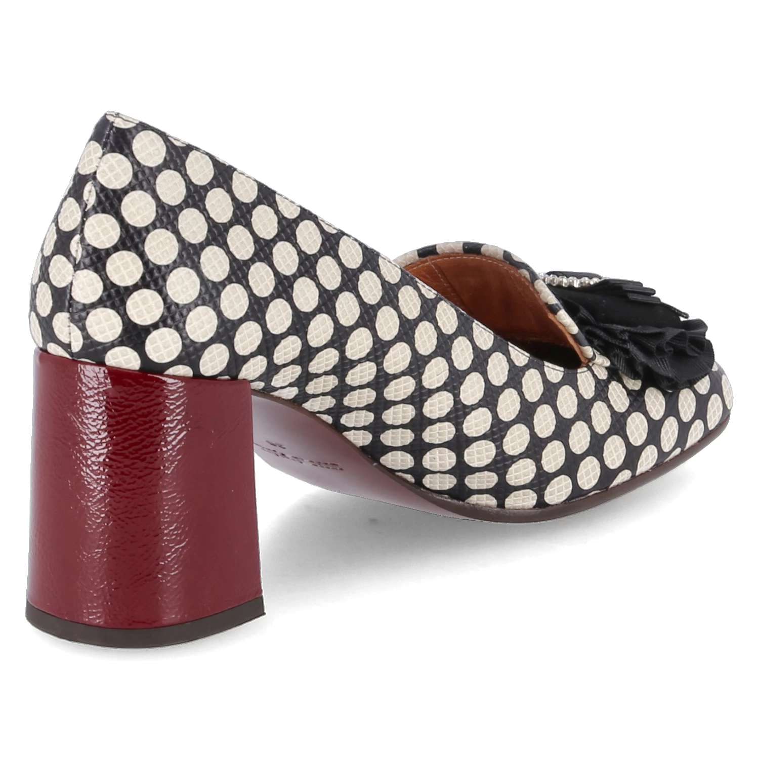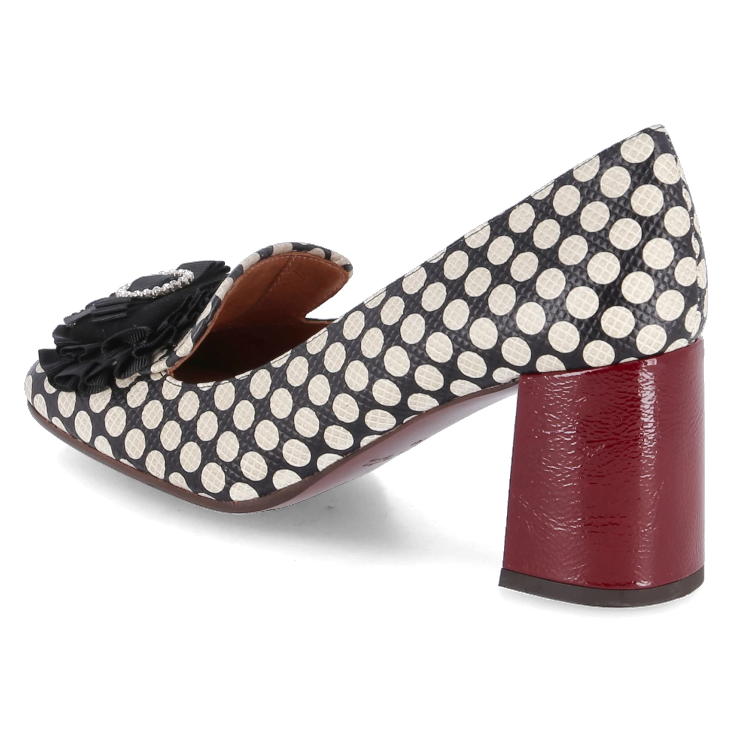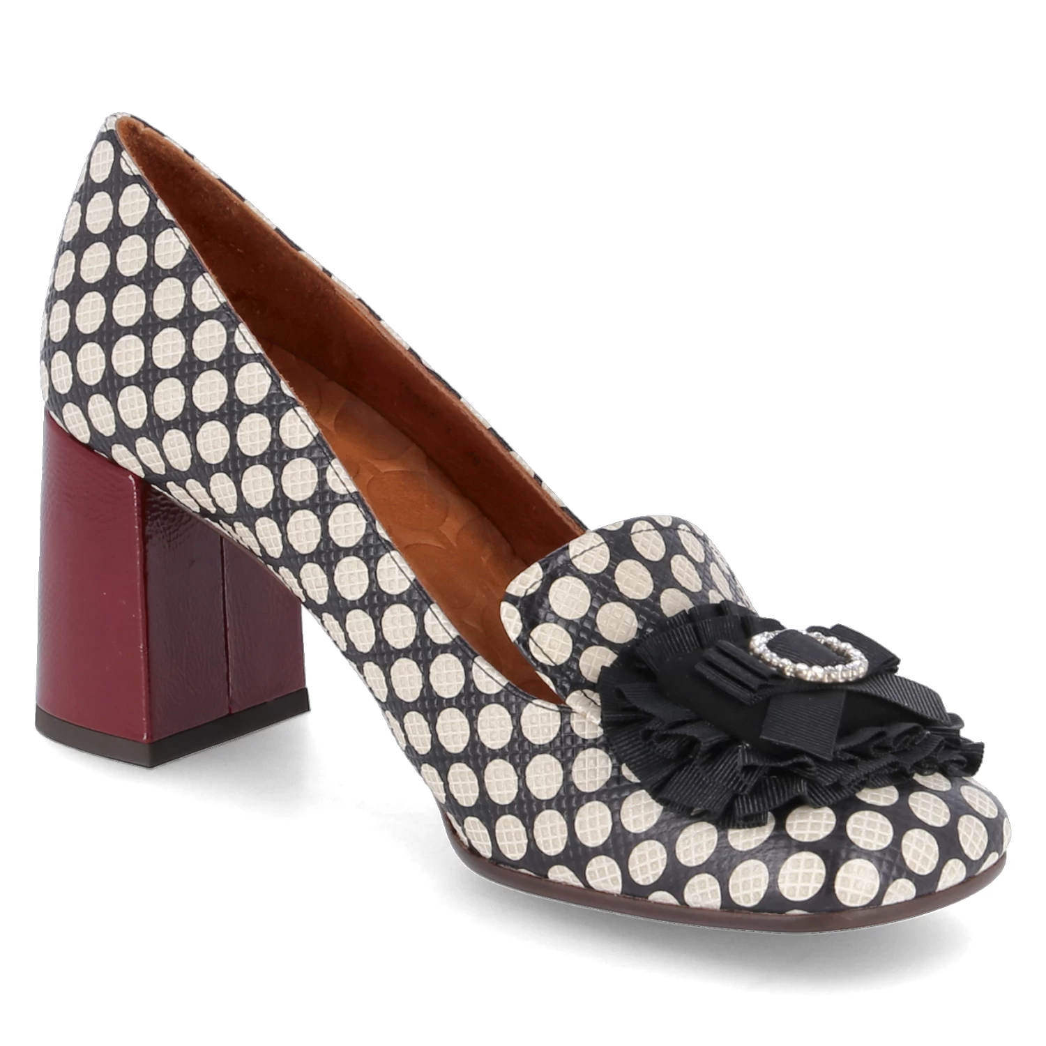 Chie Mihara Damen Hochfrontpumps PASUI Schwarz Glattleder – weiß gepunktet und geprägt – Zierbrosche mit Schleife und Glitzersteinen – stabiler Blockabsatz – Lederdecksohle, ~sohle (mit Kunststoffbeschlägen) und ~futter