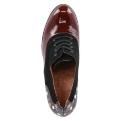 Chie Mihara Damen Hochfront-Pumps/ Schnürpumps DALOO Schwarz-Braun Leder – vorne Knautschlack – stabiler Blockabsatz mit Reptilprägung und bunten Punkten – samtiger Raulederschaft – Lederdecksohle, ~sohle (mit Kunststoffbeschlägen) und ~futter – kleines, ca. 2 cm hohes Plateau