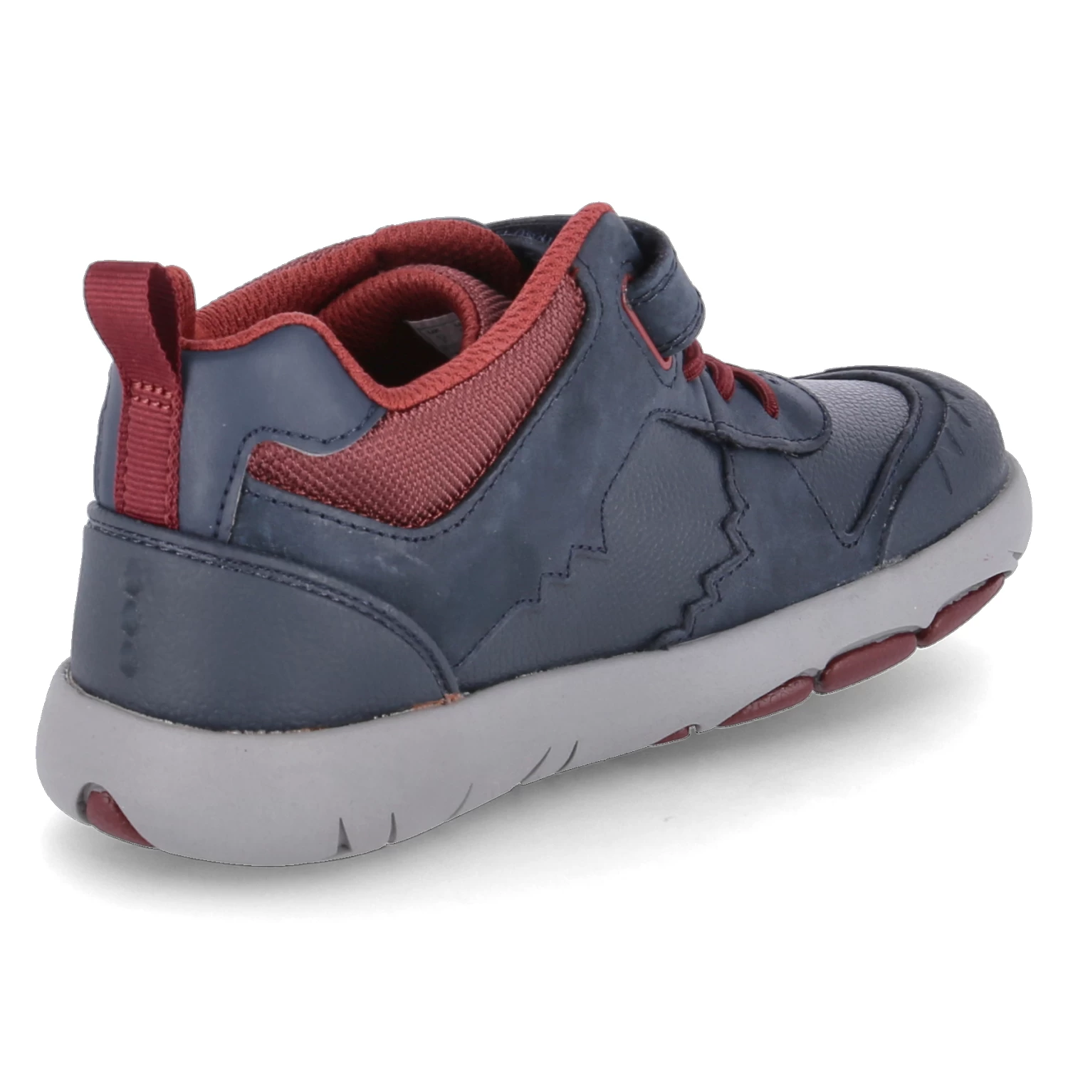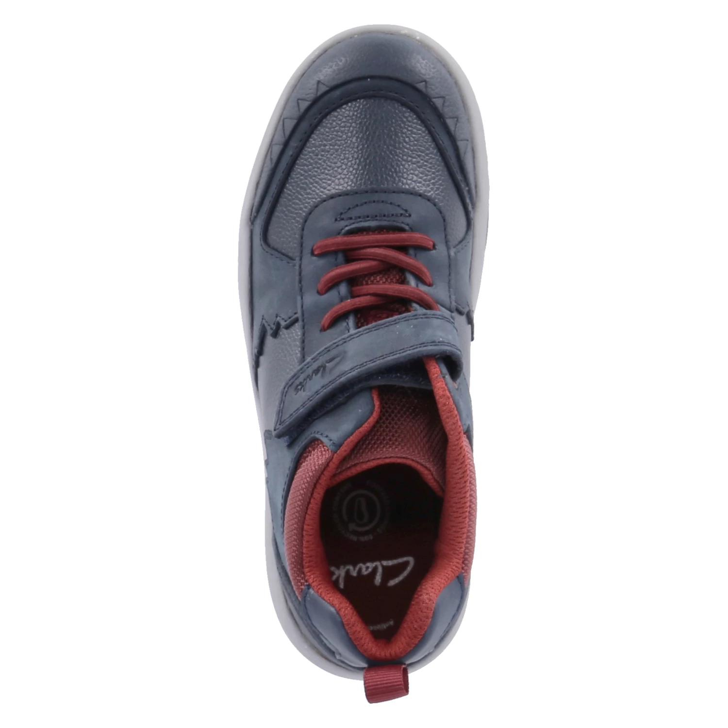 Clarks Jungen sportliche Klettschuhe REX PARK K Blau Leder-Textil – Klettriemen und Elastikband – gepolsterter Einstieg – Zierstreifen und -nähte – verstärkter Zehen- und Fersenbereich – flexible, rutschhemmende Laufsohle – Anziehlasche
