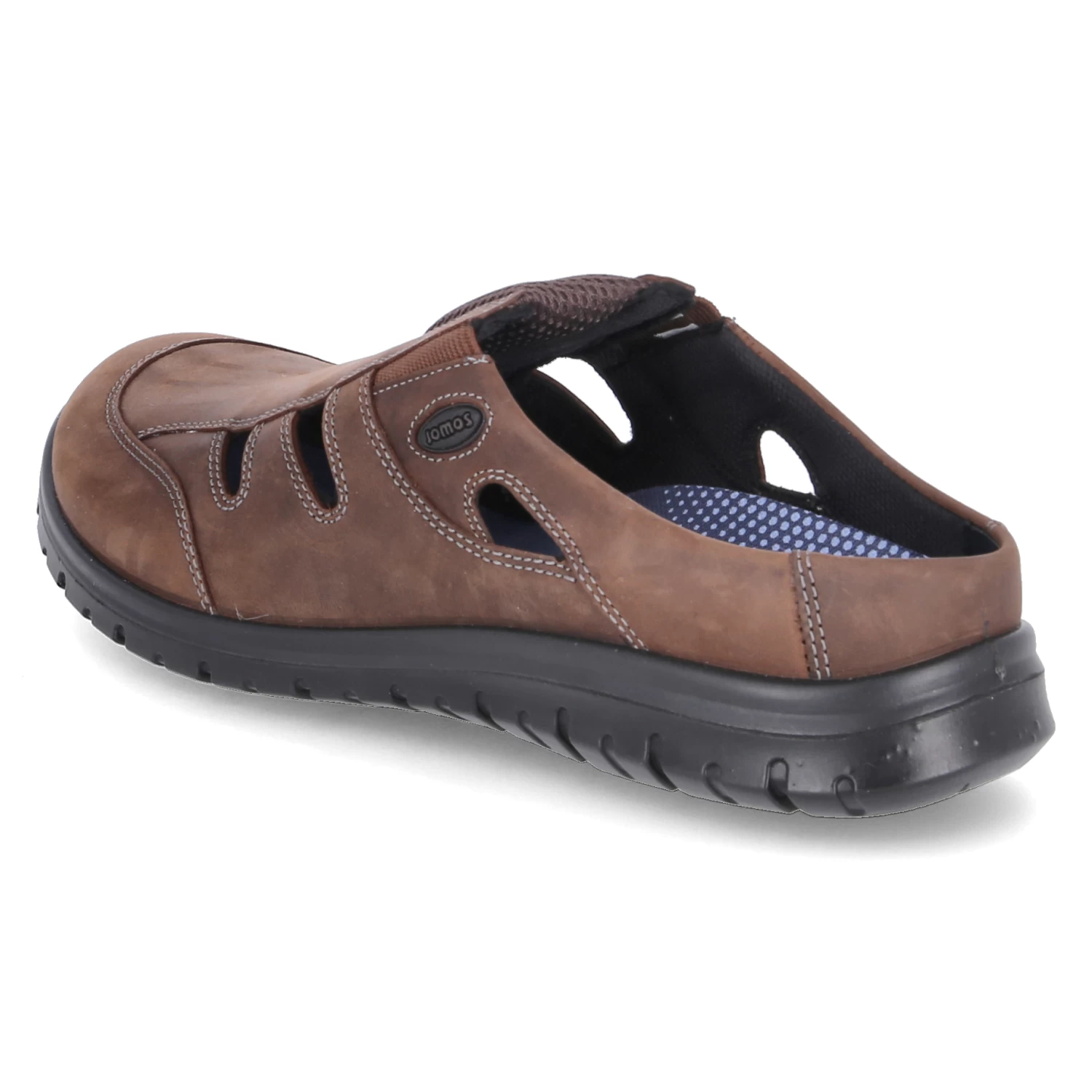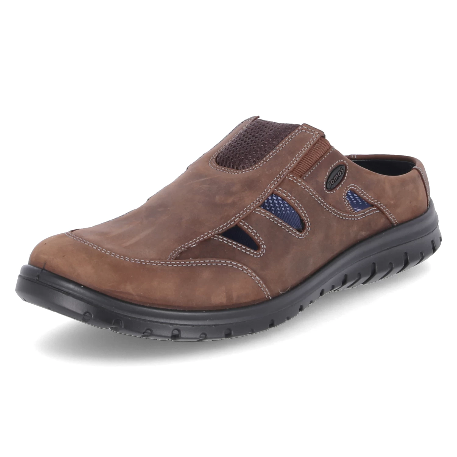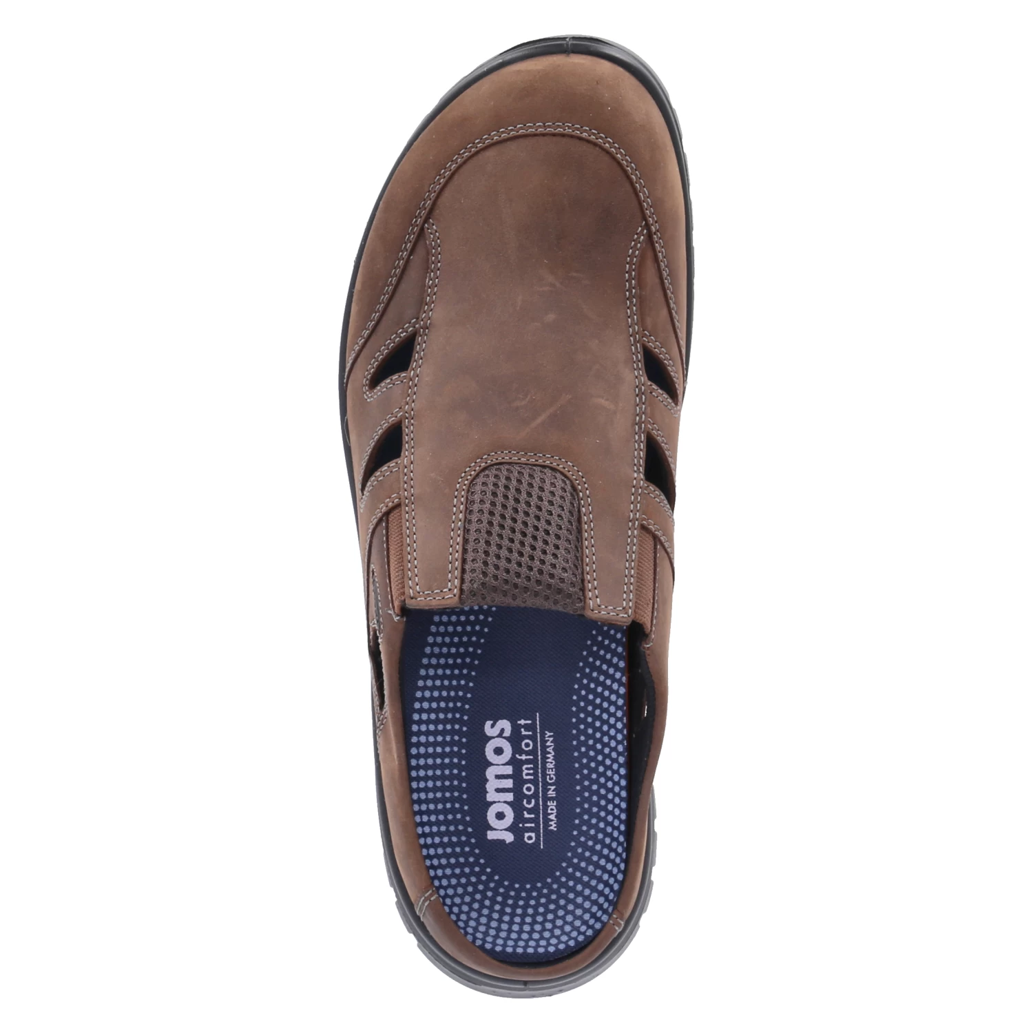 Jomos Herren Pantoletten/ Clogs Braun Rauleder – luftige Cut-Outs- verstärkter Zehenbereich – zwei Elastikeinsätze – leichtes Textilfutter – gepolsterte Wechseldecksohle – flexible, rutschhemmende Laufsohle mit leichtem Profil