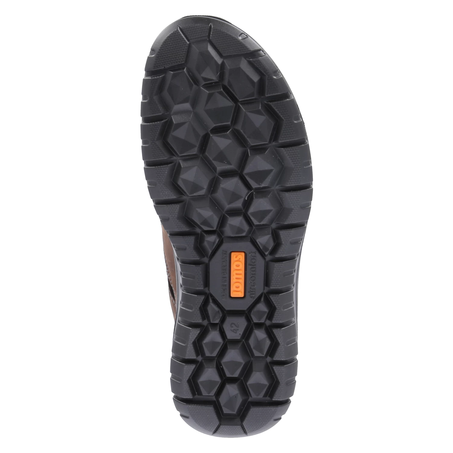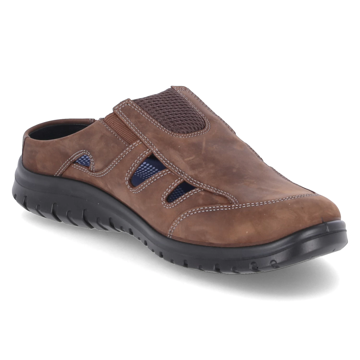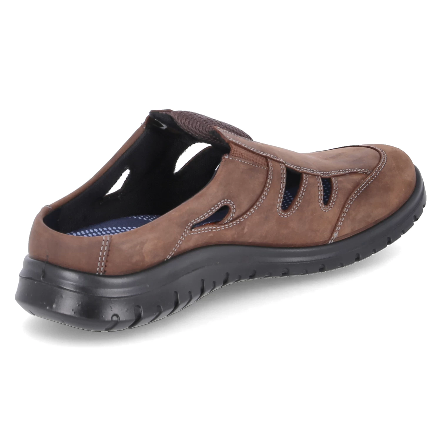 Jomos Herren Pantoletten/ Clogs Braun Rauleder – luftige Cut-Outs- verstärkter Zehenbereich – zwei Elastikeinsätze – leichtes Textilfutter – gepolsterte Wechseldecksohle – flexible, rutschhemmende Laufsohle mit leichtem Profil