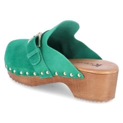 Kaerlek Damen Pantoletten/ Clogs GrĂĽn Rauleder – Obermaterial mit Nieten an der Laufsohle befestigt – komfortabel gepolsterte Leder-Decksohle – Zierriemen mit goldglänzender Schnalle – Holzsohle mitrutschhemmendem Belag