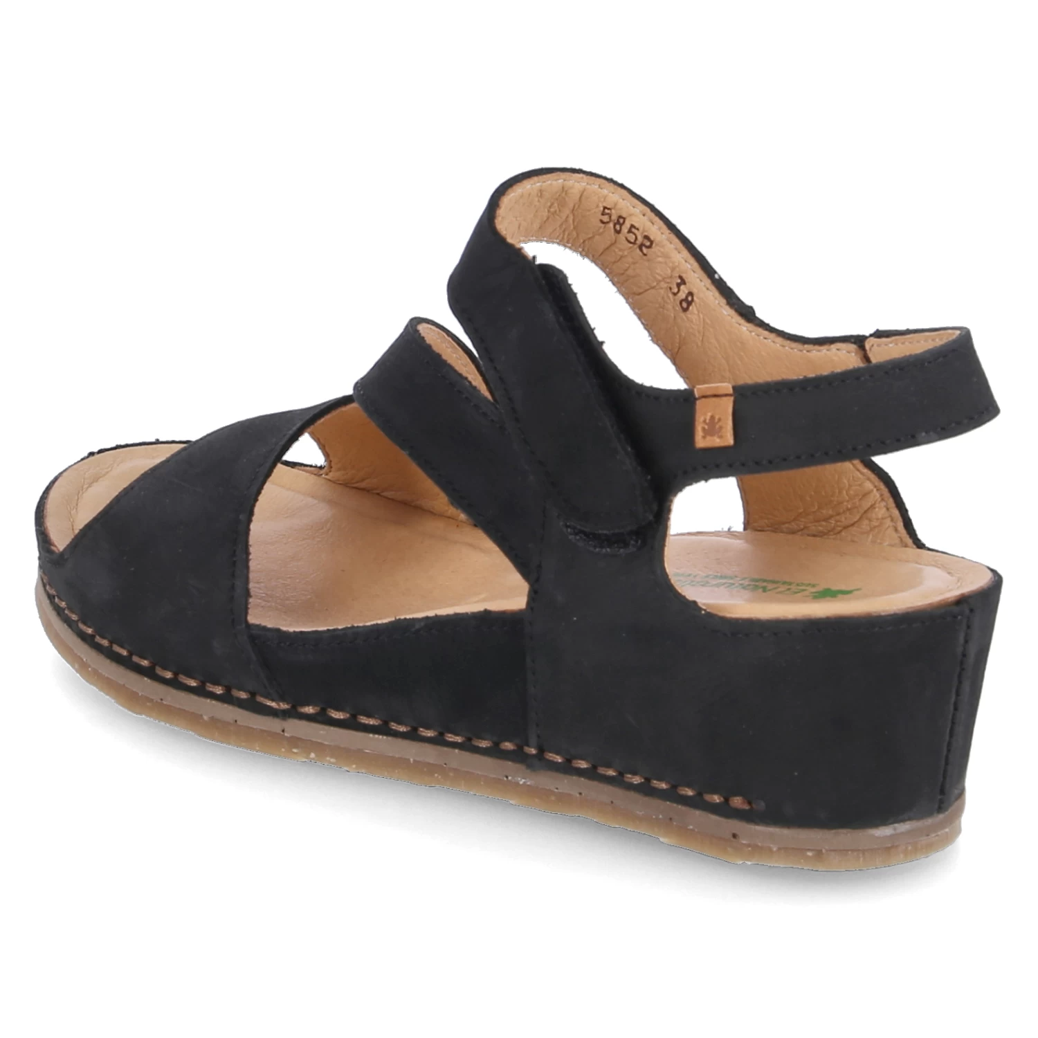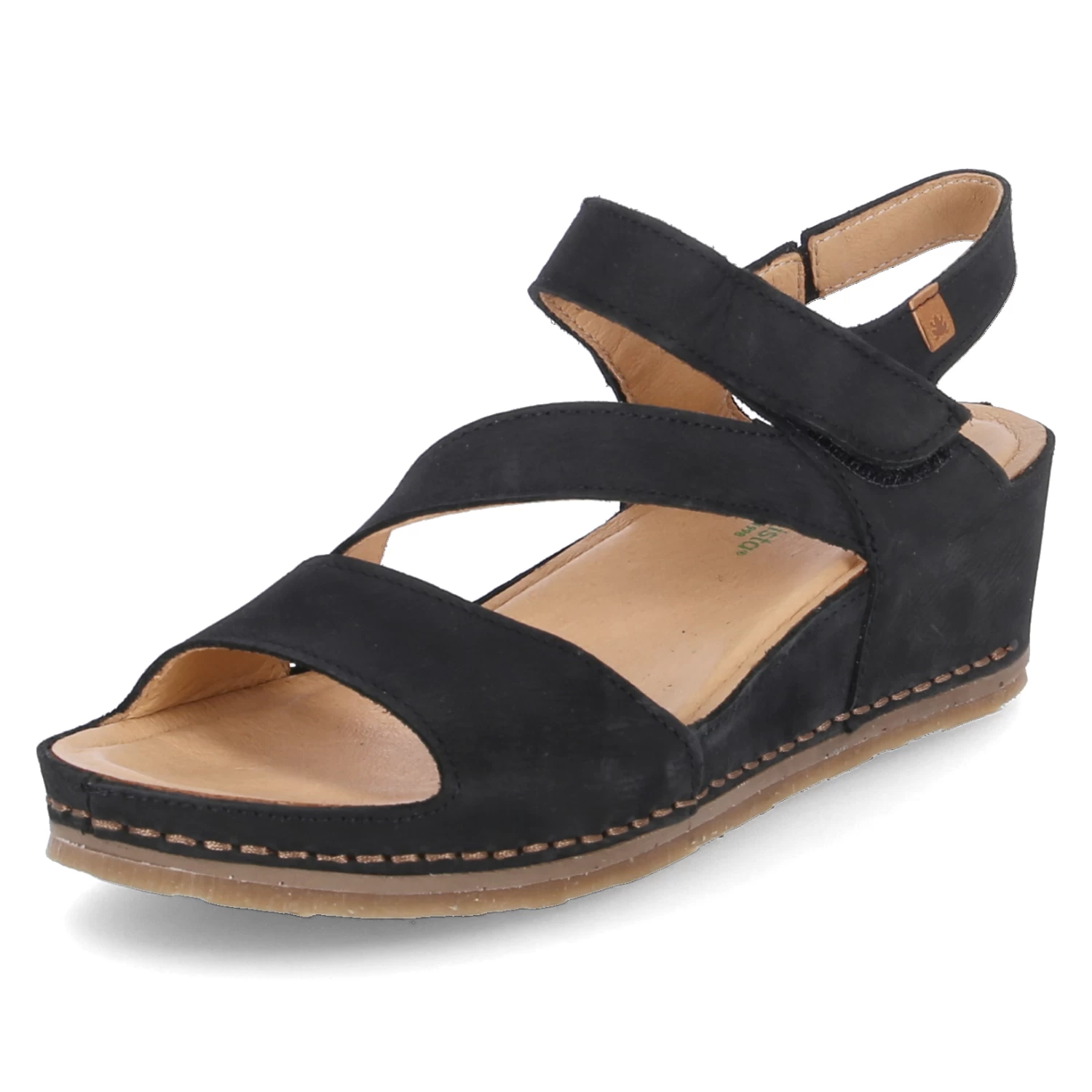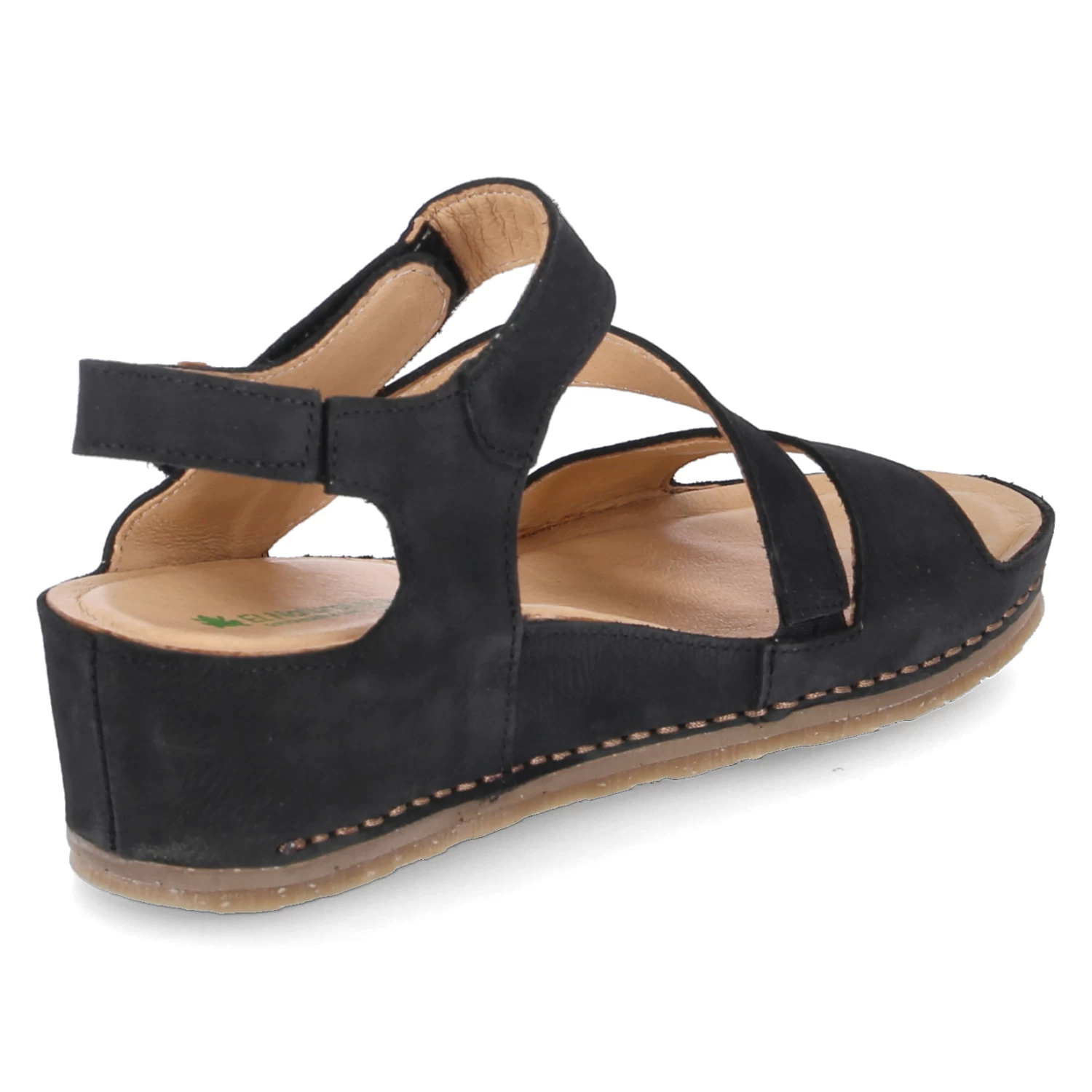 El Naturalista Damen Keilsandaletten PICUAL Schwarz Rauleder – ein Klettriemen – vorgeformte, gepolsterte Lederdecksohle – diagonaler Steg – Fersenriemen mit kleinem Elastikeinsatz – flexible, rutschhemmende Laufsohle