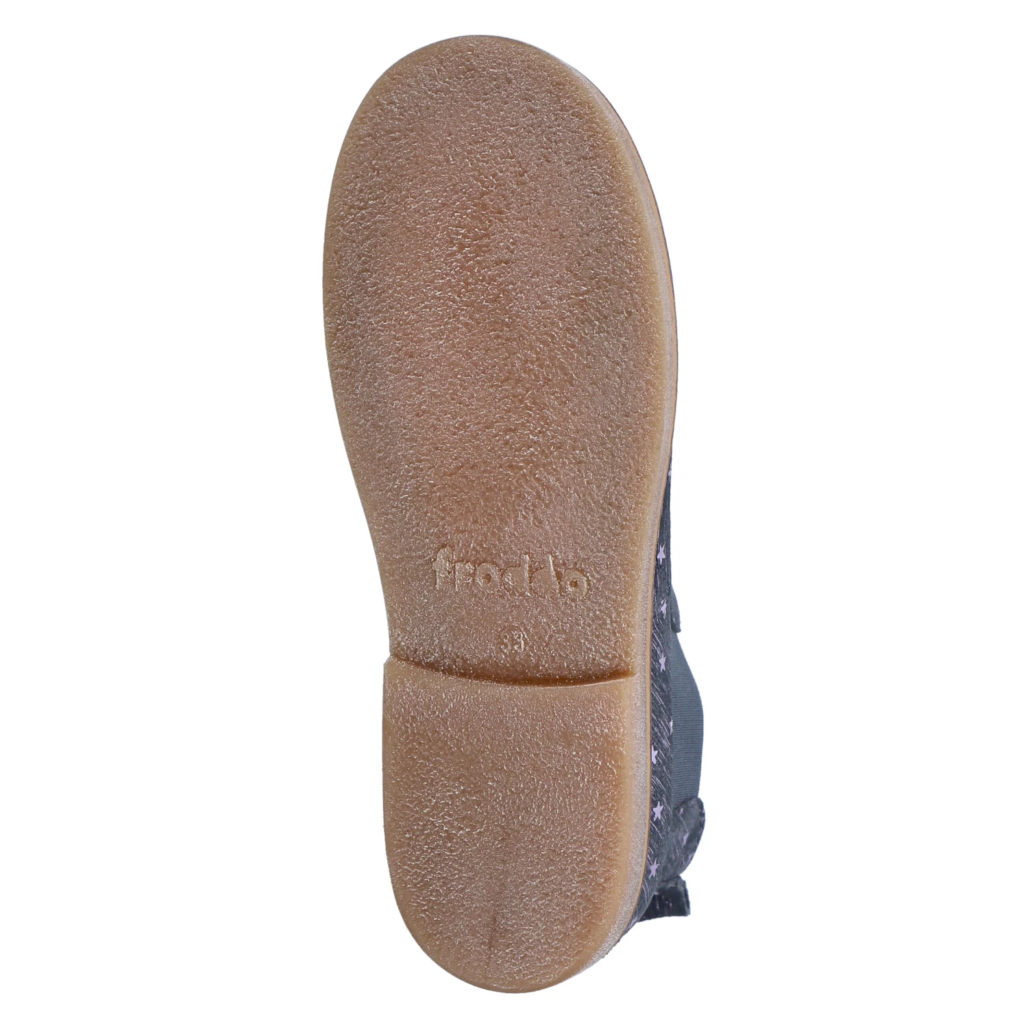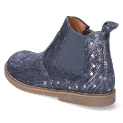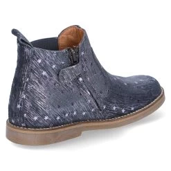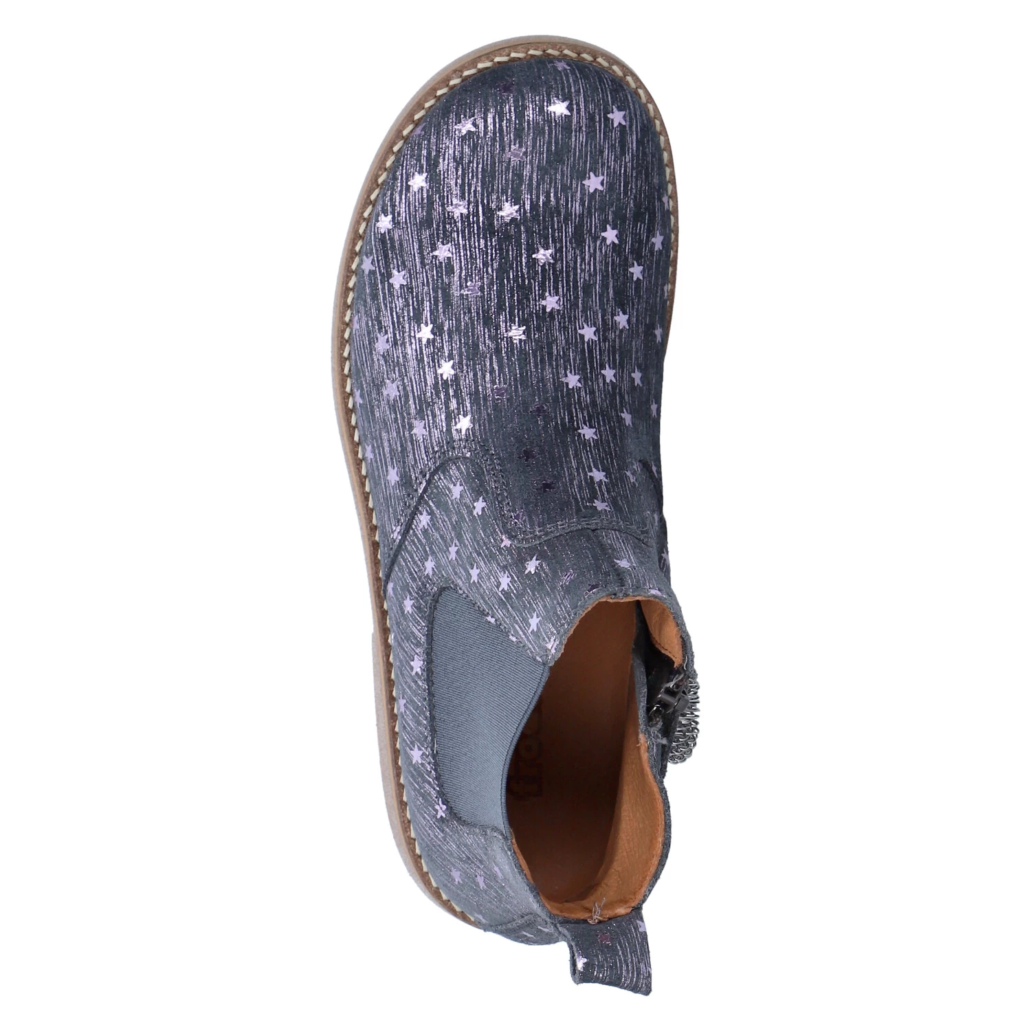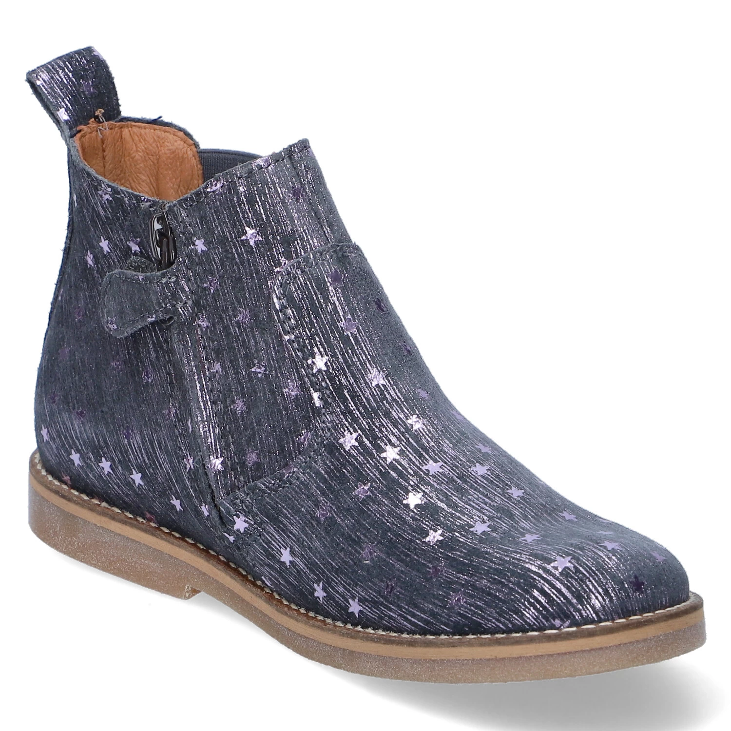 Froddo Mädchen Stiefeletten/ Chelsea Boots CHELYS LOW Grau Rauleder – violett schimmernde Sterne und Streifen – ReiĂźverschluss – Elastikeinsatz – Anziehlasche – verstärkter Fersenbereich – hautfreundliches Lederfutter – gepolsterte Lederdecksohle – flexible, rutschhemmende Laufsohle mit leichtem Profil