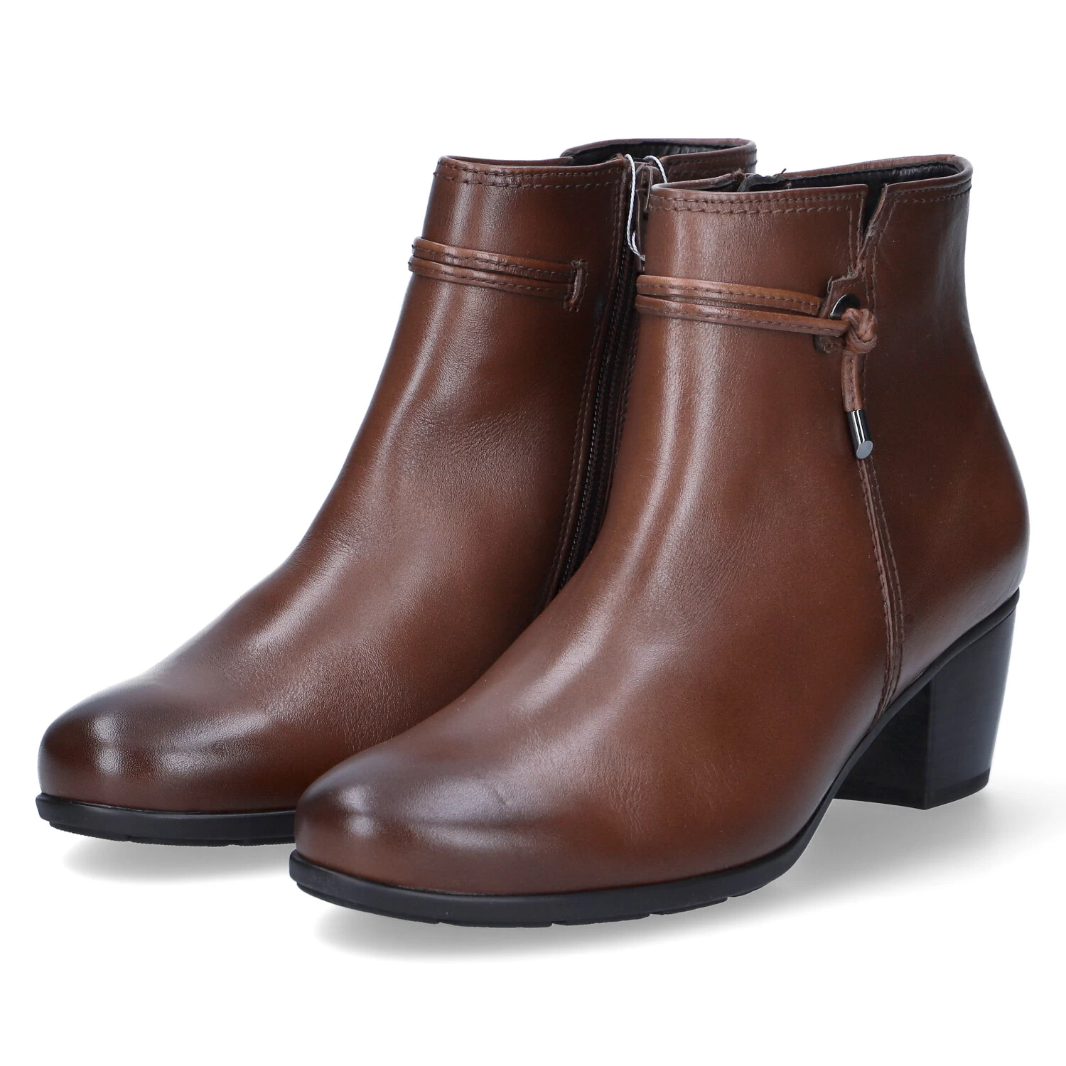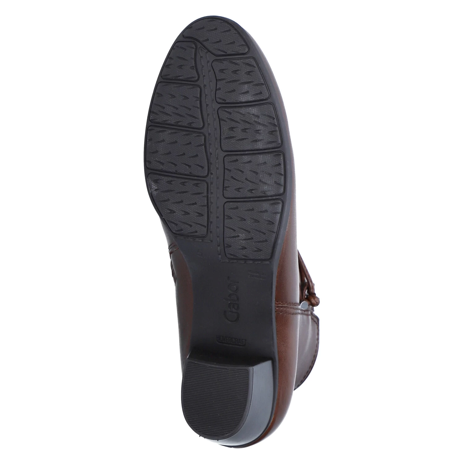 Gabor Damen Ankle Boots/ Stiefeletten Braun Glattleder – ReiĂźverschluss – Zierriemen – angenehmes Textilfutter – gepolsterte, herausnehmbare Decksohle – verstärkte Ferse – stabile, rutschhemmende Laufsohle mit Profil – Blockabsatz ca. 6 cm