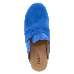 Gabor Damen Pantoletten/ Clogs Blau Rauleder – Zierriemen – gepolsterte Lederdecksohle – seitlicher Rundnietenbesatz – stabiler Blockabsatz und Holzsohle mit Beschlägen
