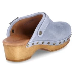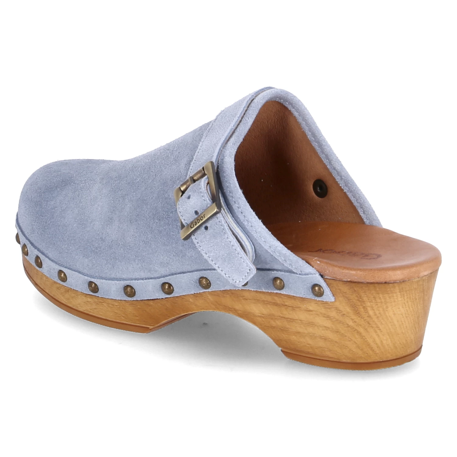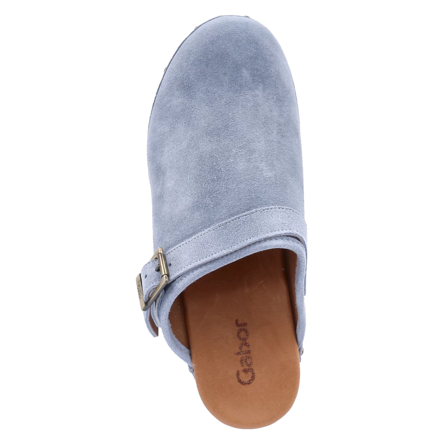 Gabor Damen Pantoletten/ Clogs Blau Rauleder – Obermaterial mit Nieten an der Laufsohle befestigt – komfortabel gepolsterte Leder-Decksohle – Zierriemen mit Schnalle – Holzsohle mitrutschhemmendem Belag