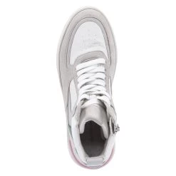 Gabor Damen sportliche Stiefeletten/ High Sneaker WeiĂź-Grau Rauleder – SchnĂĽrung und ReiĂźverschluss – Ferse mit grĂĽnen und rosa Highlight – verstärkter Zehen- und Fersenbereich – gepolsterter Einstieg – weiches Textilfutter – gepolsterte Wechseldecksohle (recycelt) – flexible, rutschhemmende Laufsohle