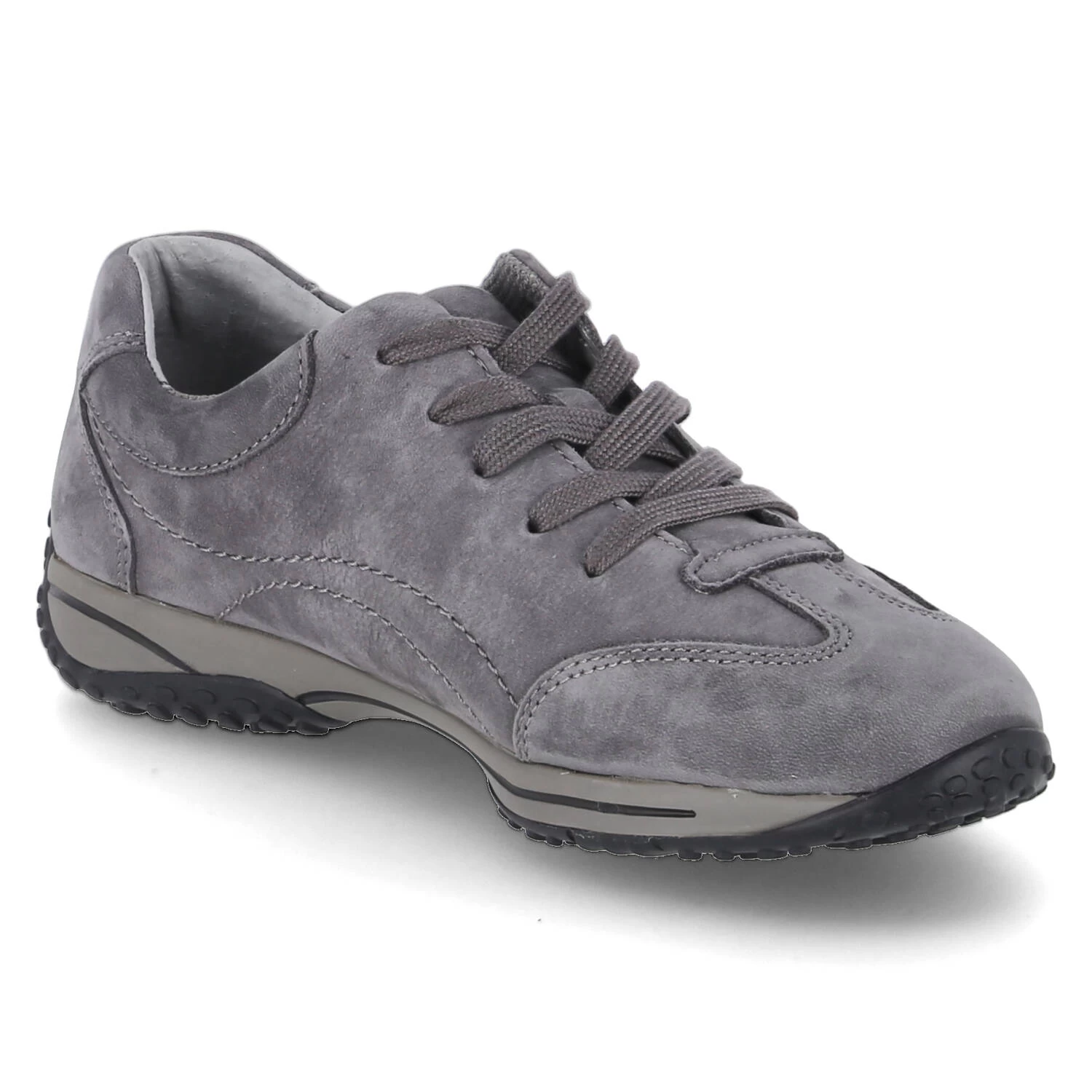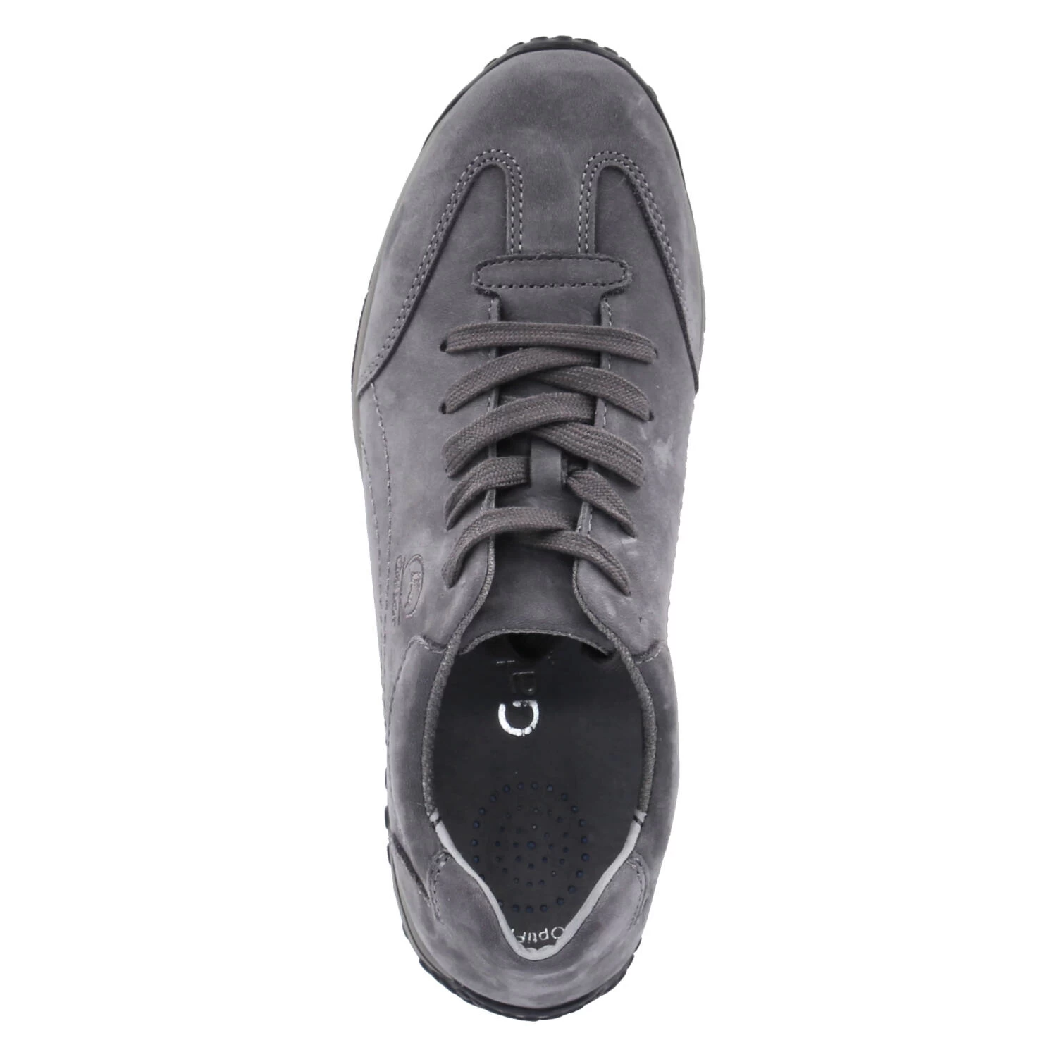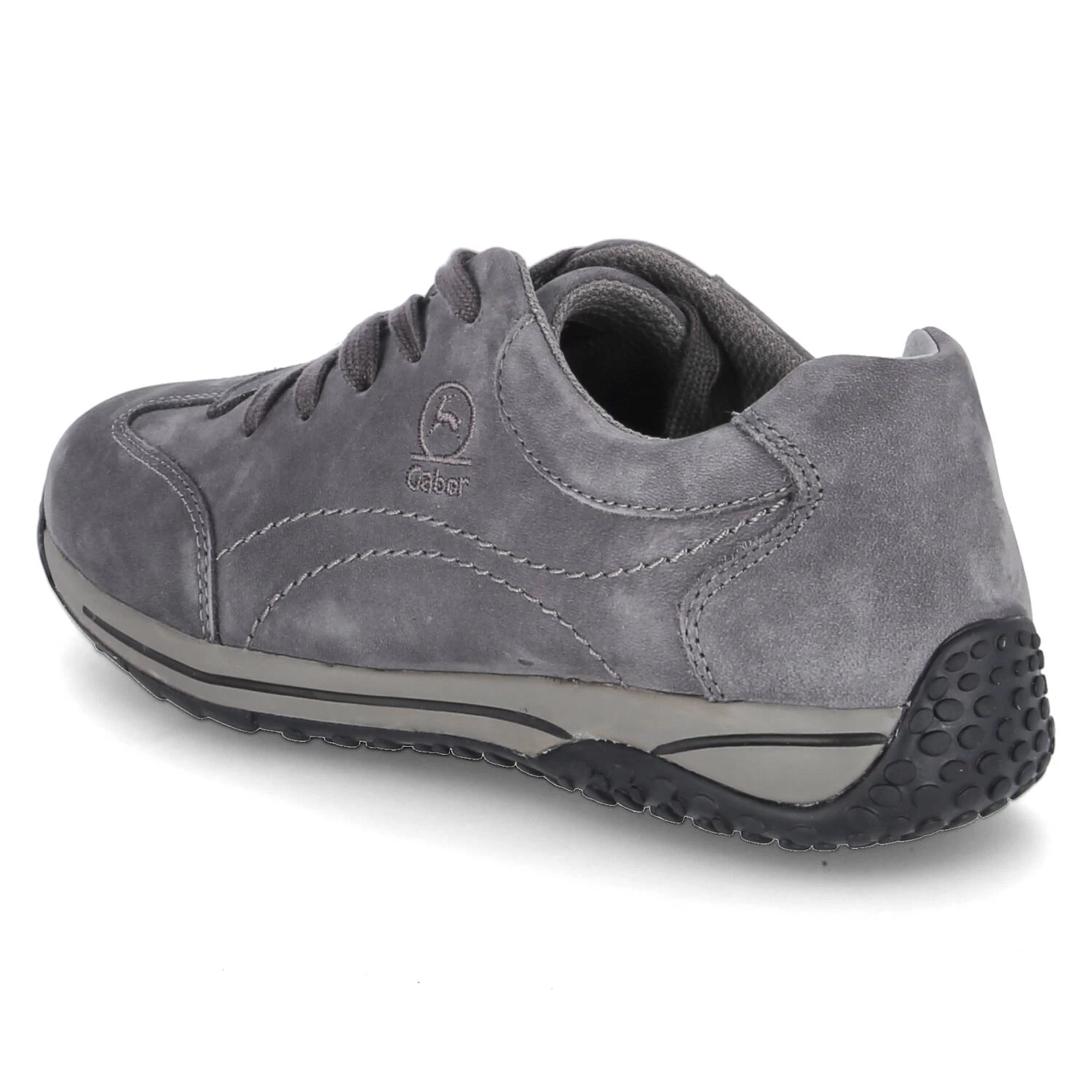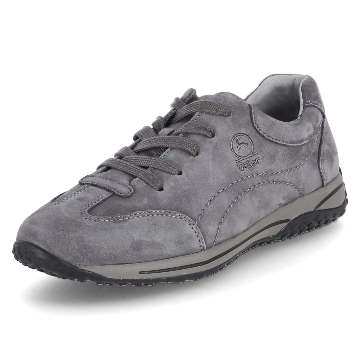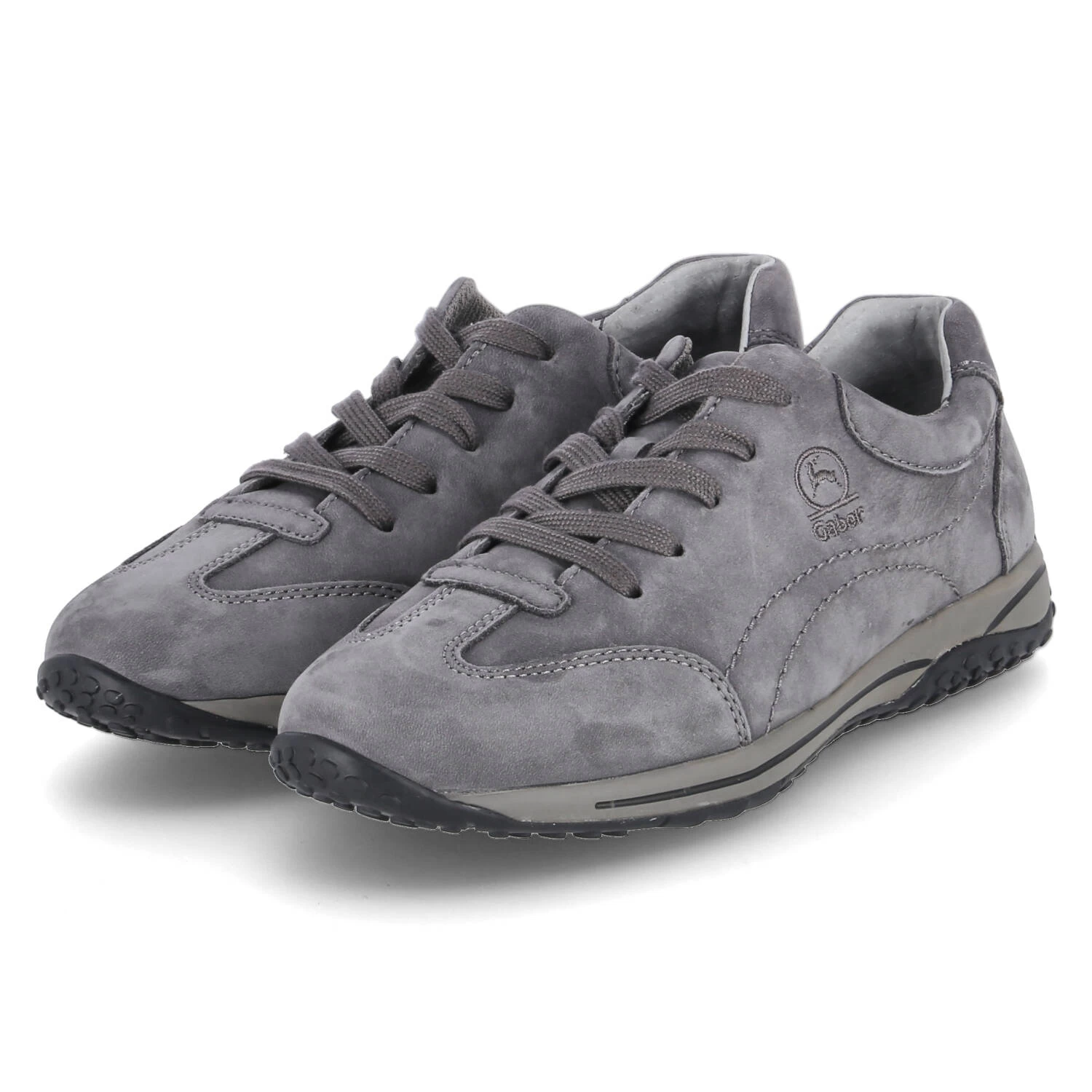 Gabor Damen Low Sneaker Grau Rauleder – Schnürung – gepolsterter Einstieg – verstärkter Zehen- und Fersenbereich – sehr flexible, rutschhemmende Laufsohle – gepolstertes Wechselfußbett