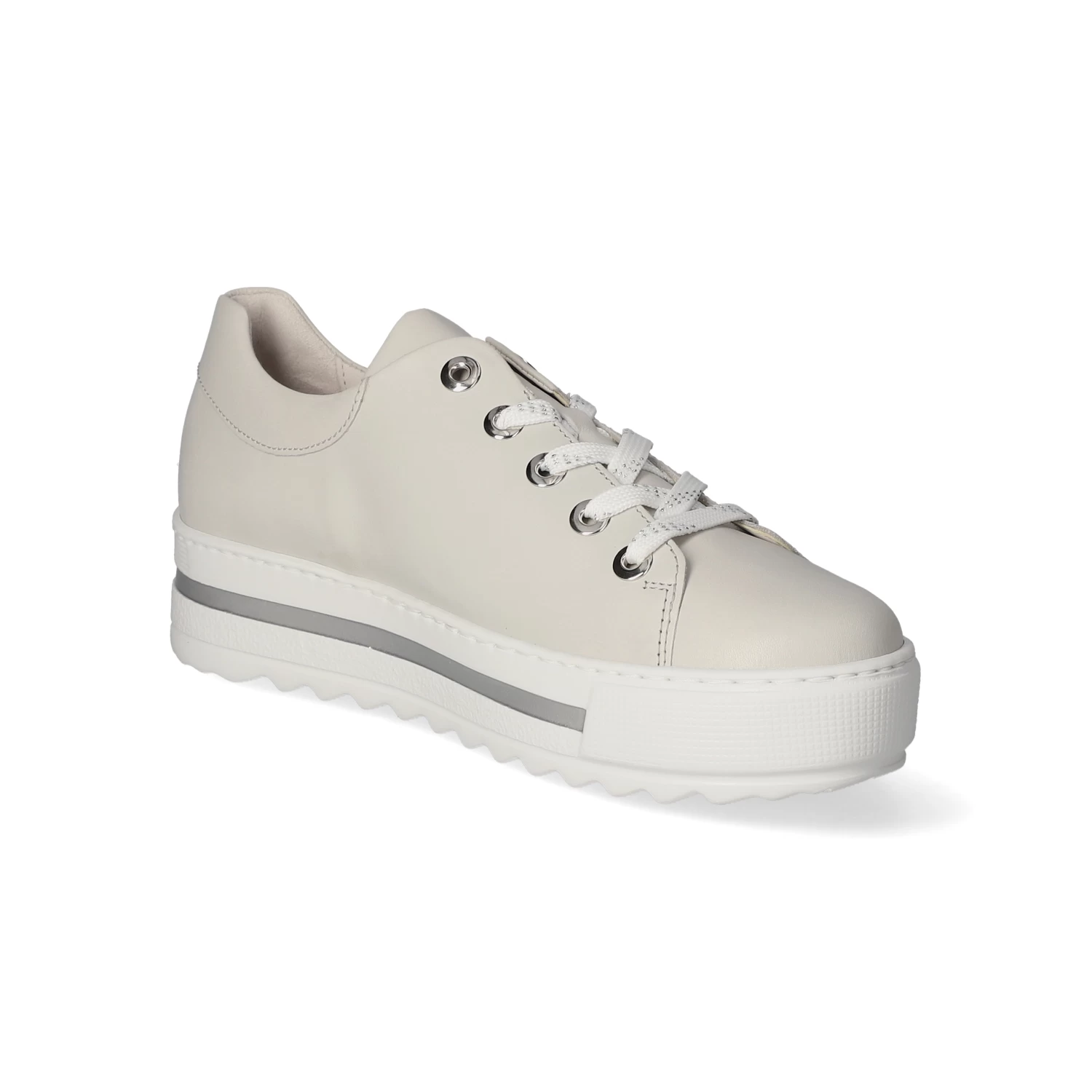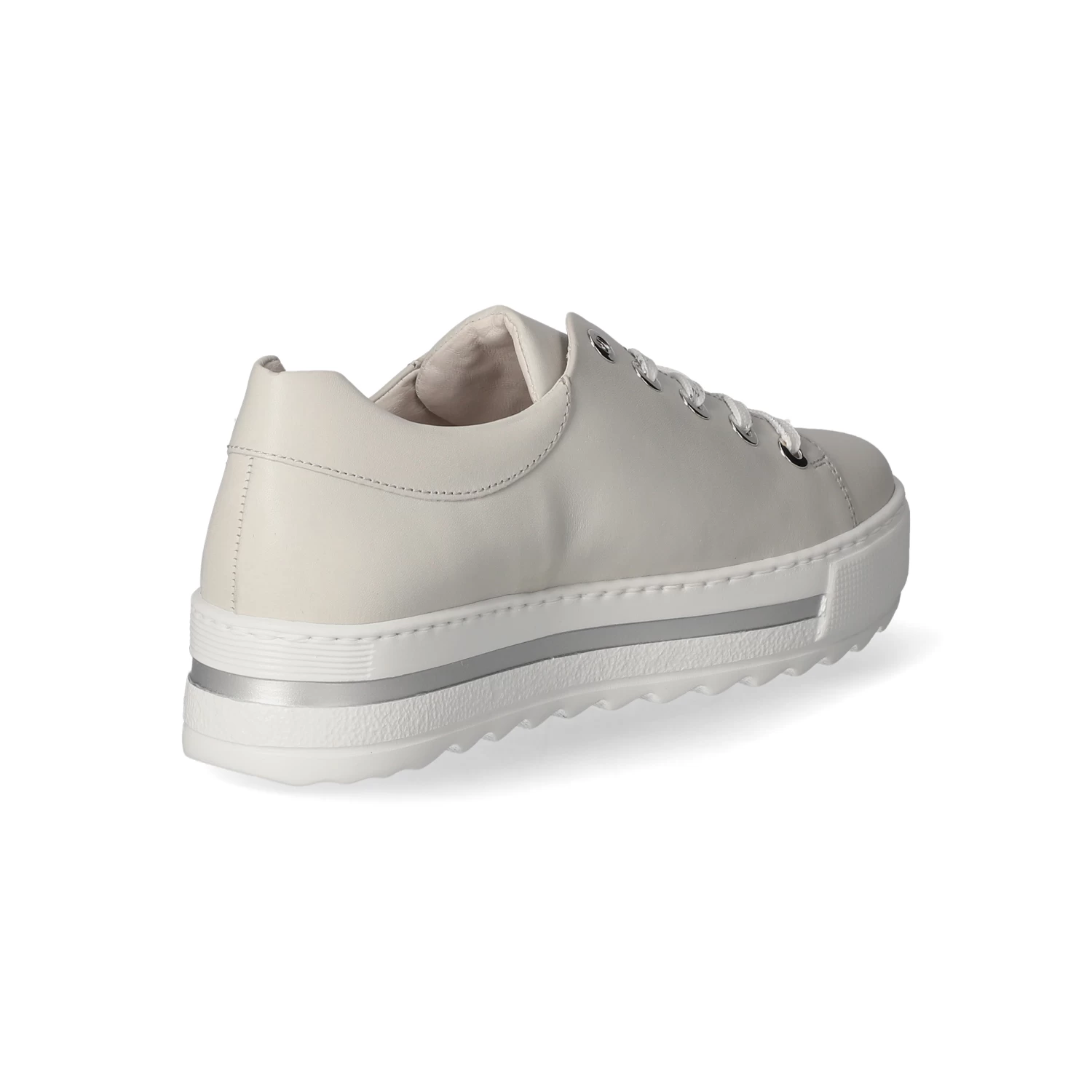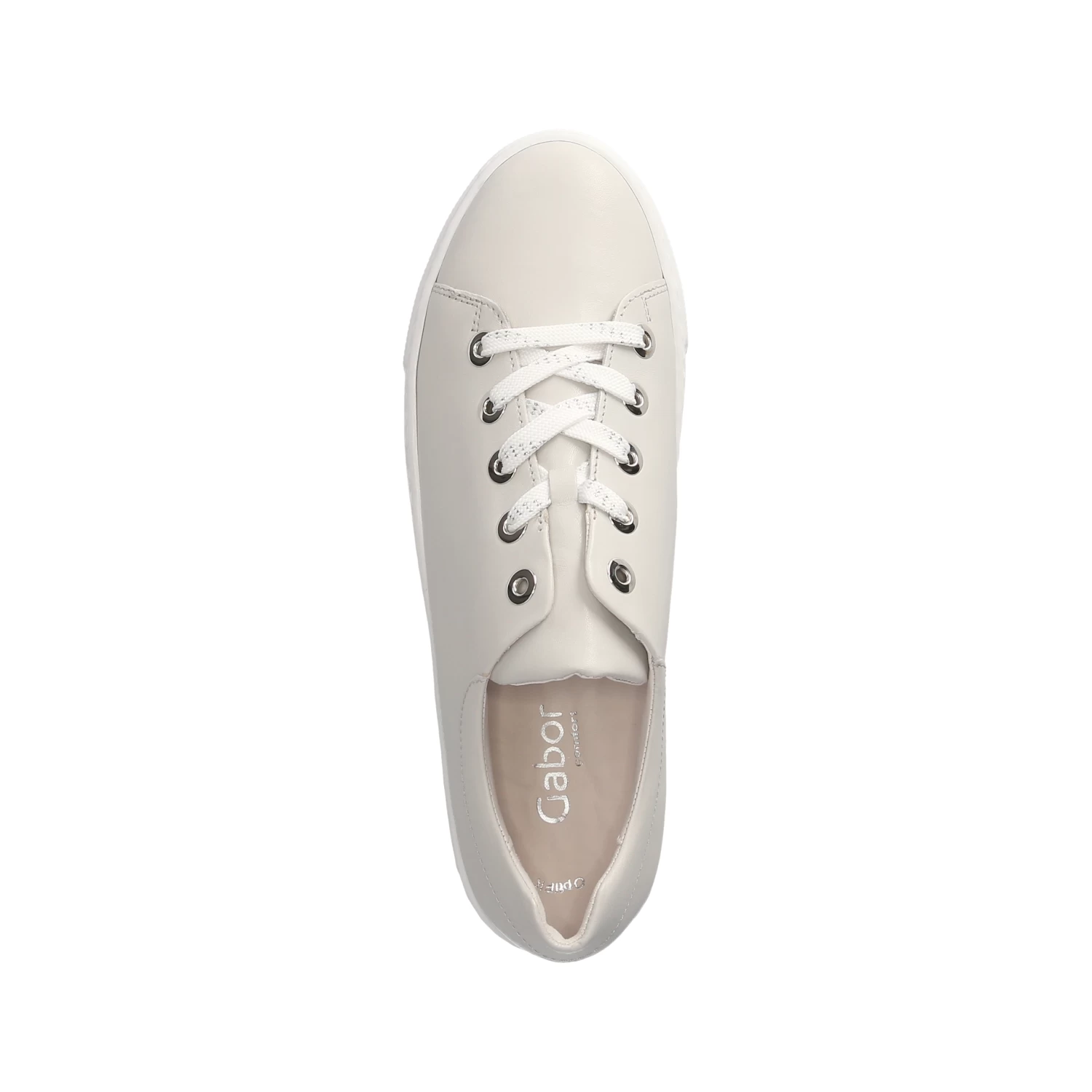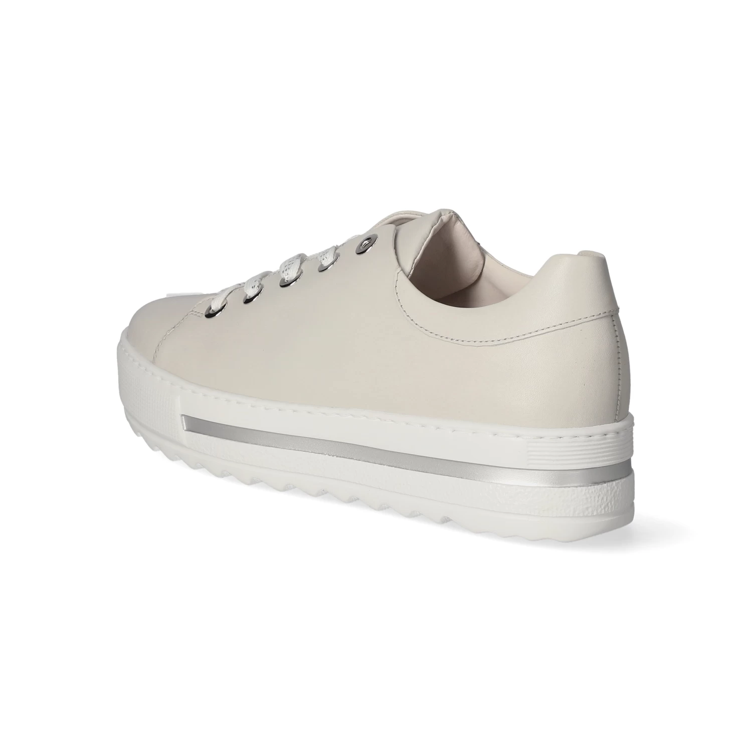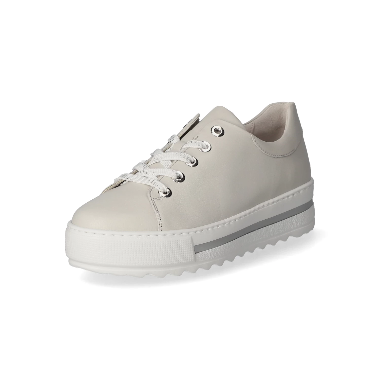 Gabor Damen Low Sneaker Grau Glattleder – sportliches Design – typische Markendetails – SchnĂĽrung – verstärkter Fersenbereich – gepolsterter Einstieg – leichtes Leder-Textilfutter – gepolsterte Lederdecksohle – flexible, rutschhemmende Profilsohle – ca. 3 cm Plateau