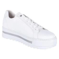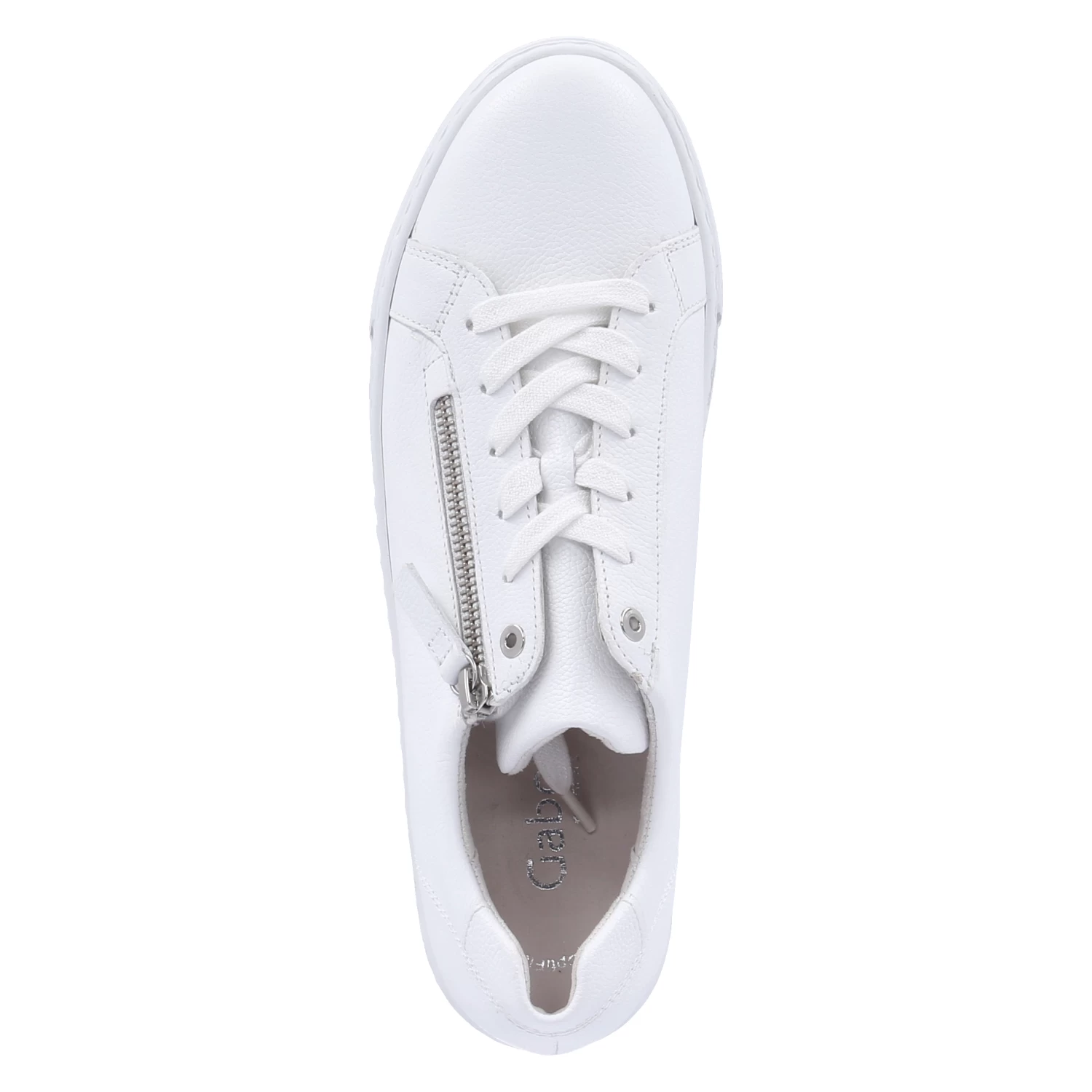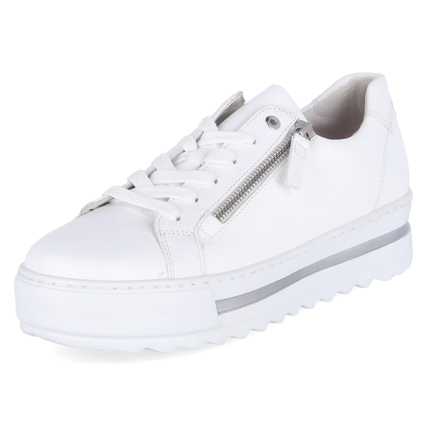 Gabor Damen Low Sneaker WeiĂ Glattleder – sportliches Design – typische Markendetails – SchnĂŒrung und ReiĂverschluss – verstĂ€rkter Fersenbereich – leicht gepolsterter Einstieg – leichtes Leder-Textilfutter – gepolsterte Lederdecksohle – stabile, rutschhemmende Profilsohle – ca. 4 cm Plateau
