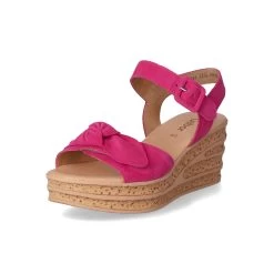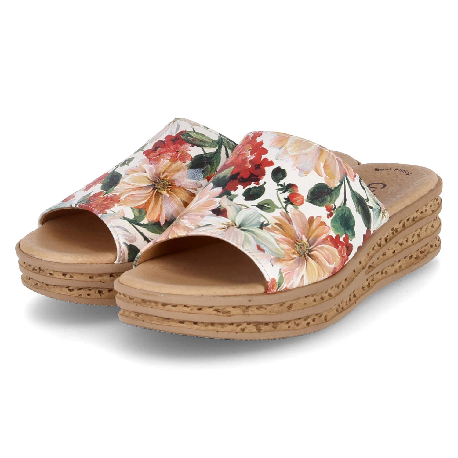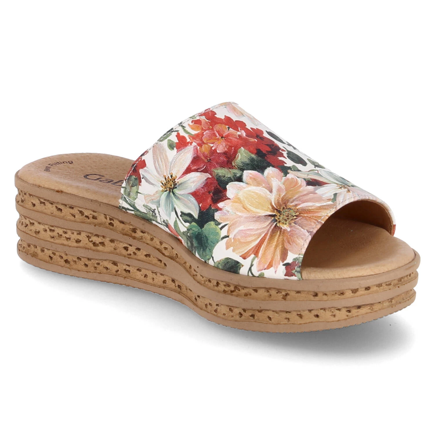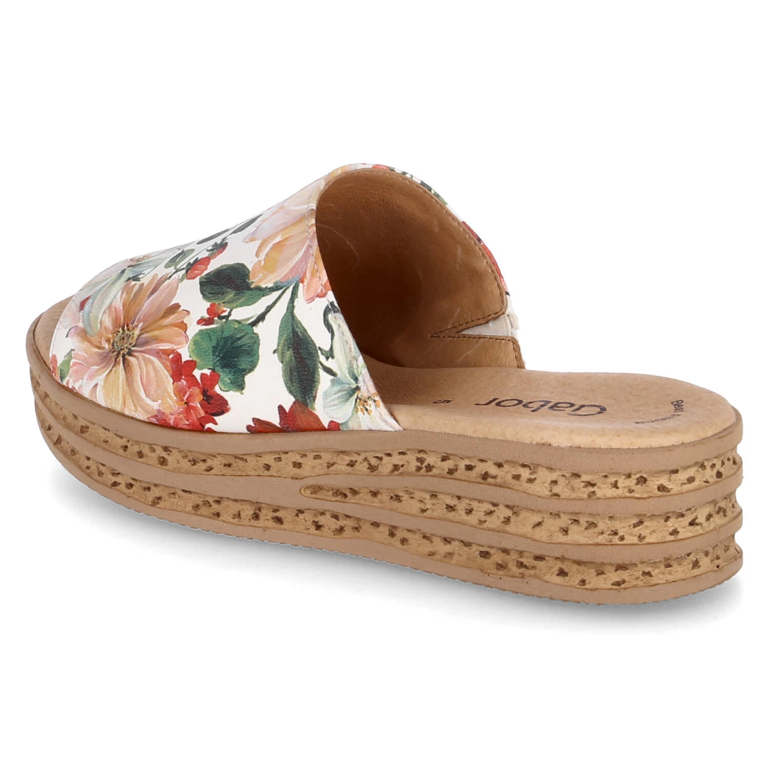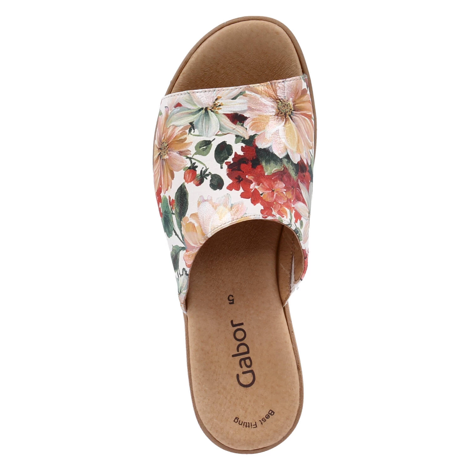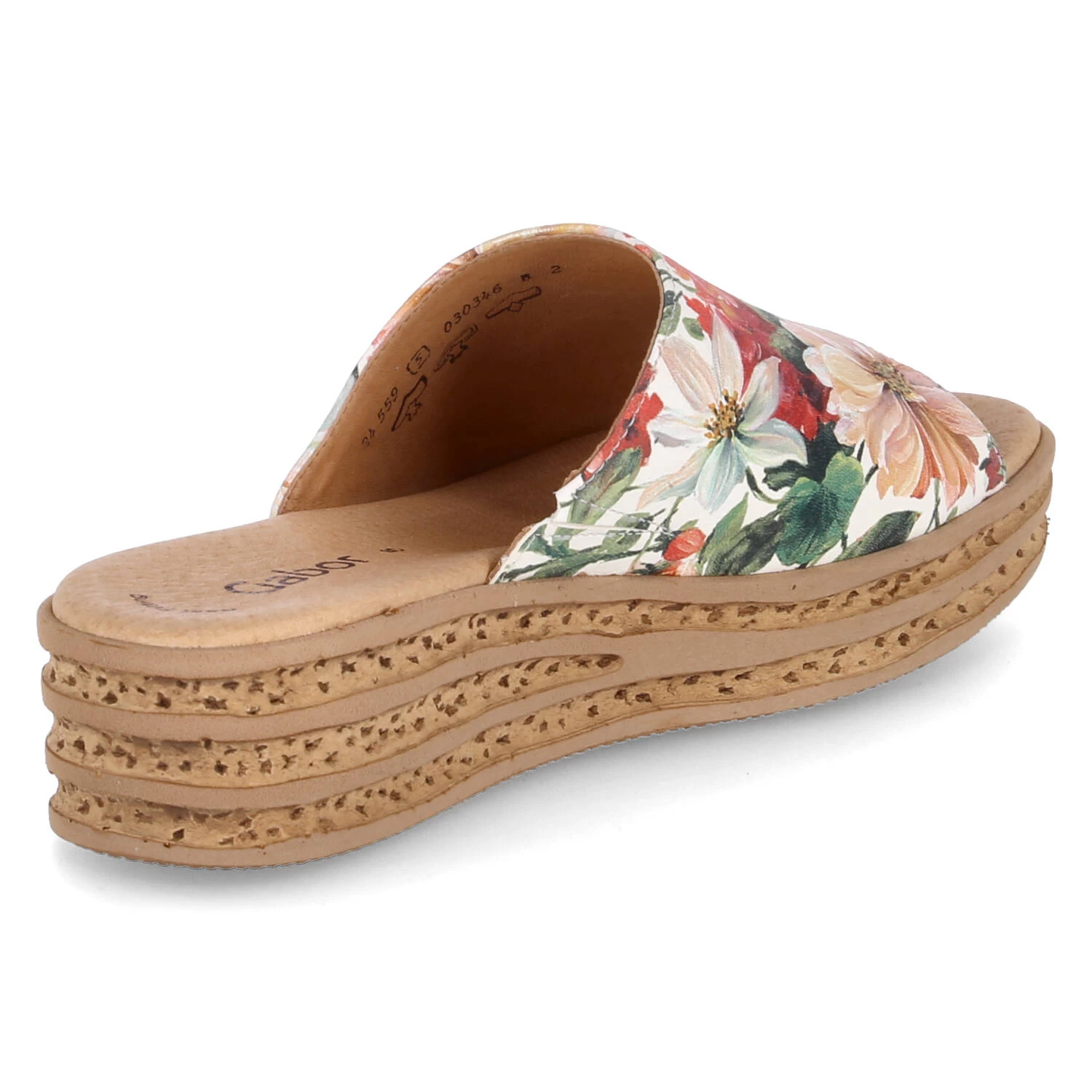 Gabor Damen Pantoletten WeiĂź-Bunt Glattleder – Riemen mit Elastikeinsatz und Blumenprint – gepolsterte Lederdecksohle – robuste Laufsohle mit Rahmen in Korkoptik