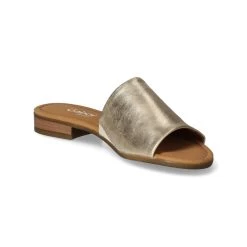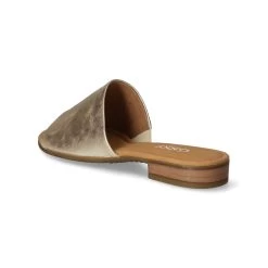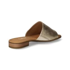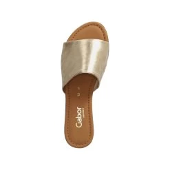Gabor Damen Pantoletten Gold Glattleder – Stretcheinsatz seitlich vom Spann – komfortabel gepolsterte Decksohle – profilierte Laufsohle mit rutschhemmenden Eigenschaften – Blockabsatz