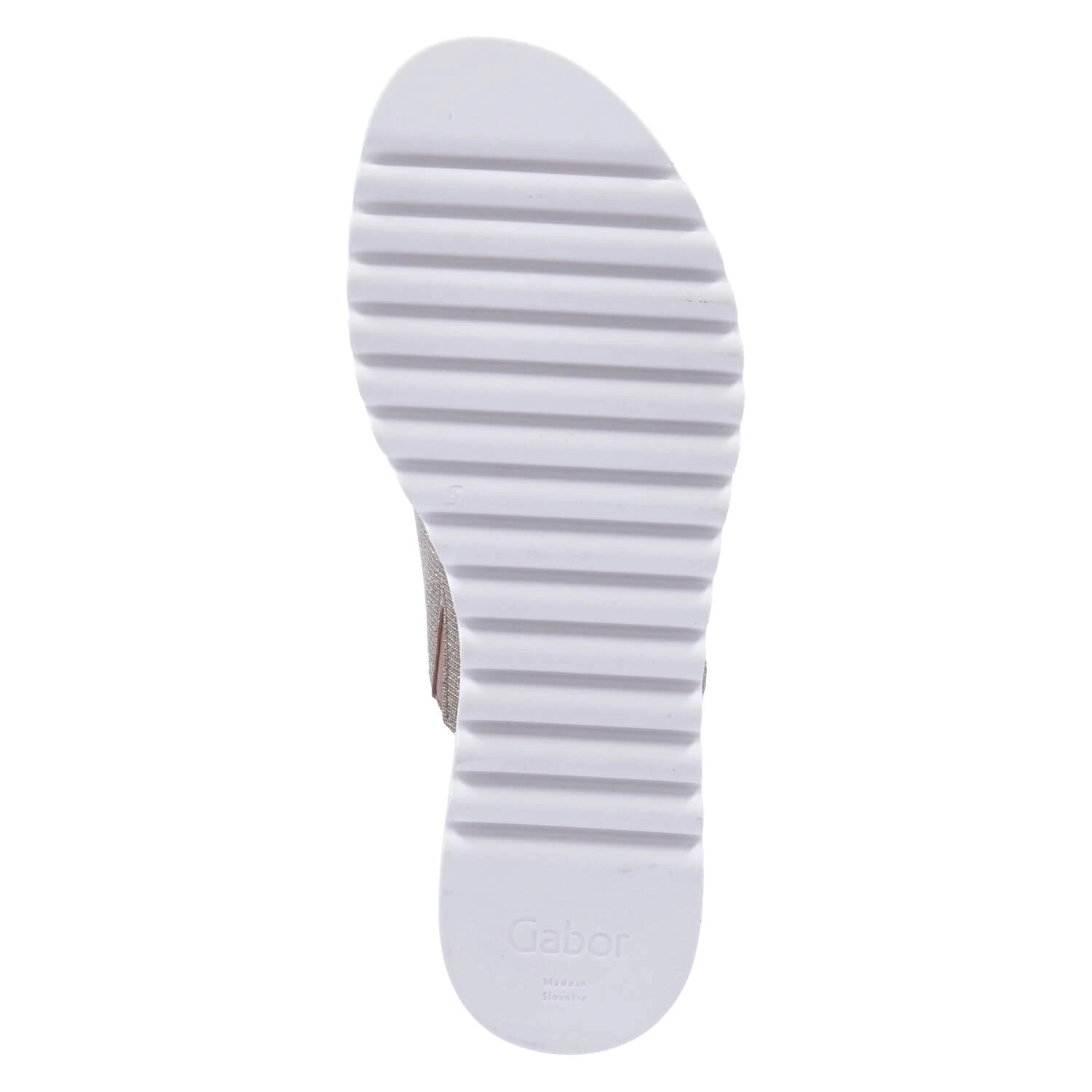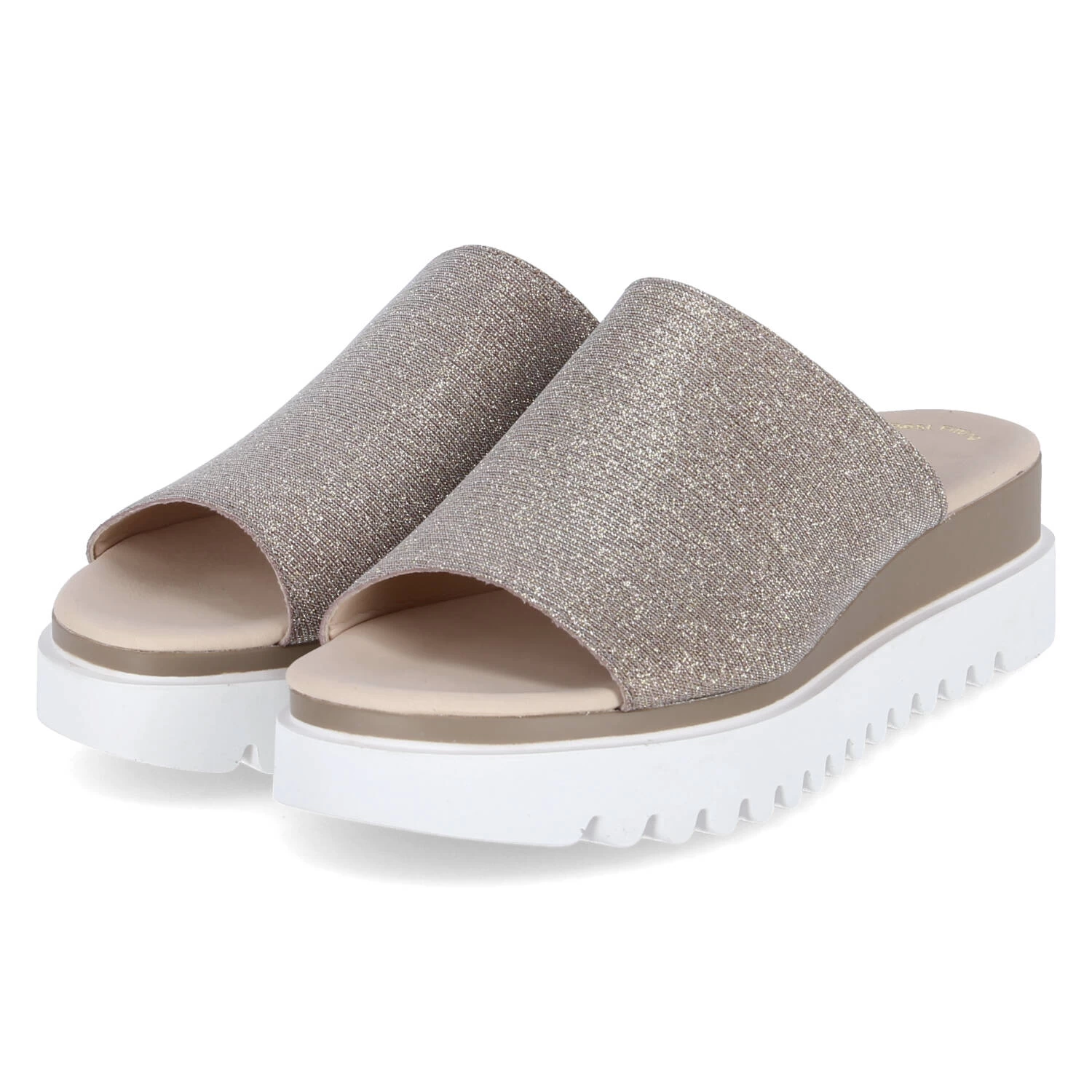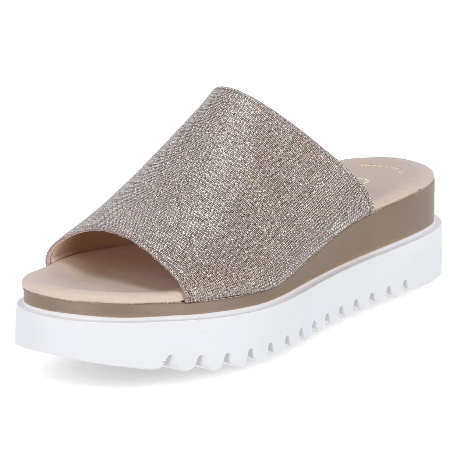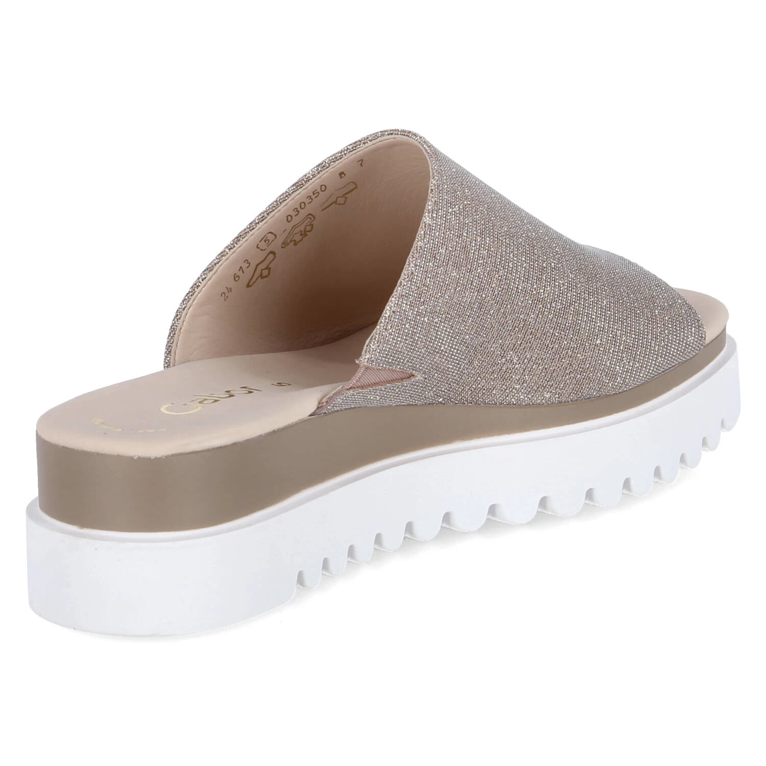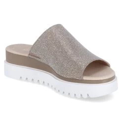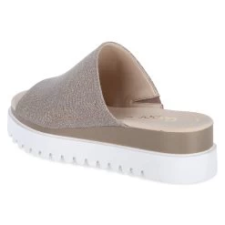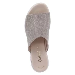 Gabor Damen Pantoletten Rosègold Synthetik – glitzernde Oberfläche – breiter Riemen mit seitlichem Elastikeinsatz – Lederdecksohle – starke Laufsohle mit Profil