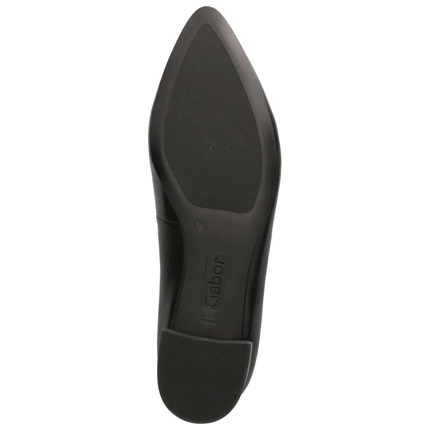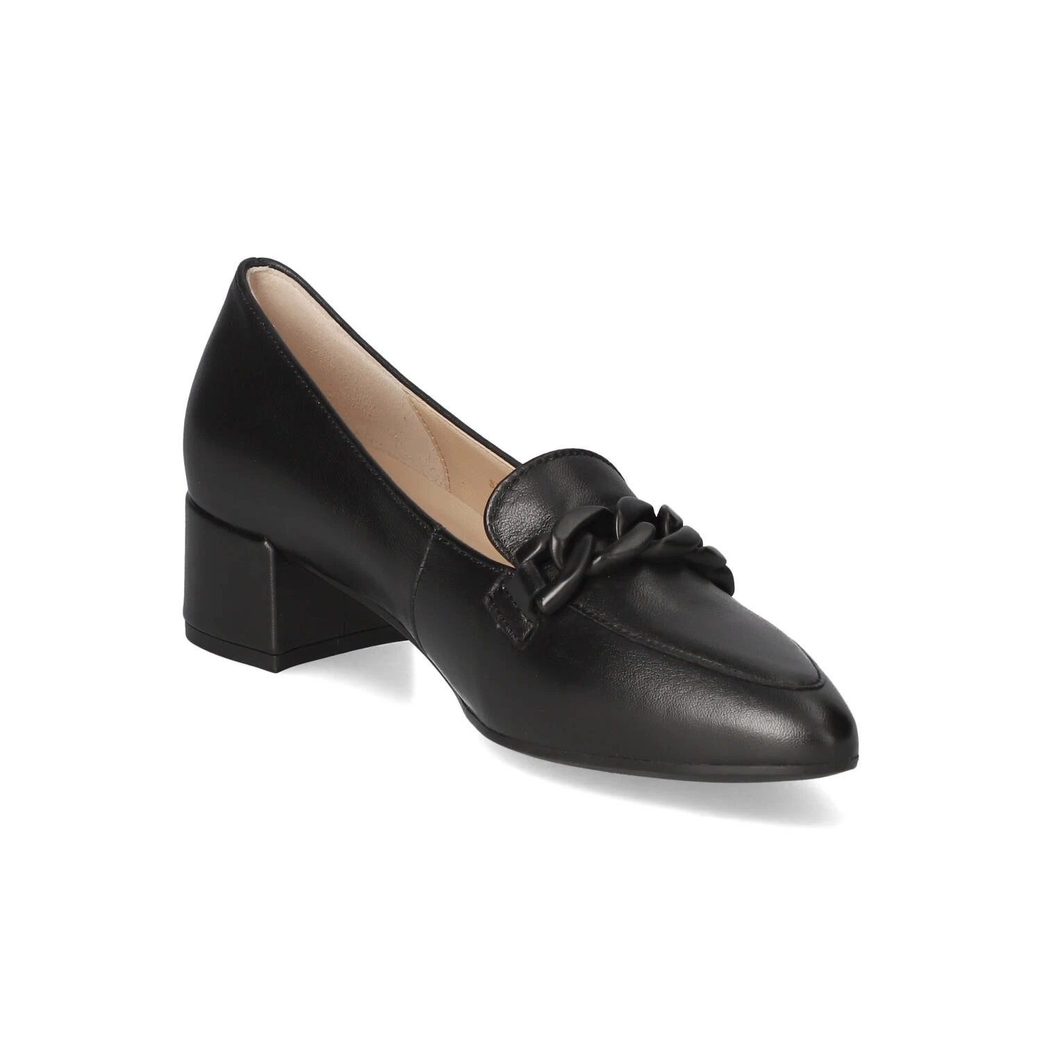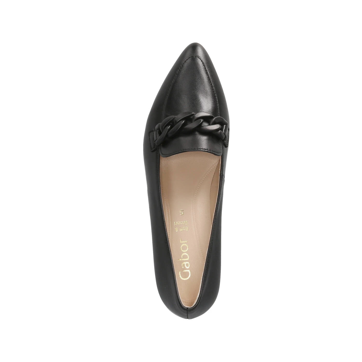 Gabor Damen Pumps/ Hochfrontpumps Schwarz Glattleder – zierendes Kettenelement – verstärkter Zehen- und Fersenbereich – angenehmes Lederfutter – gepolsterte Lederdecksohle – flexible, rutschhemmende Laufsohle mit leichtem Profil – stabiler Blockabsatz