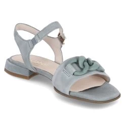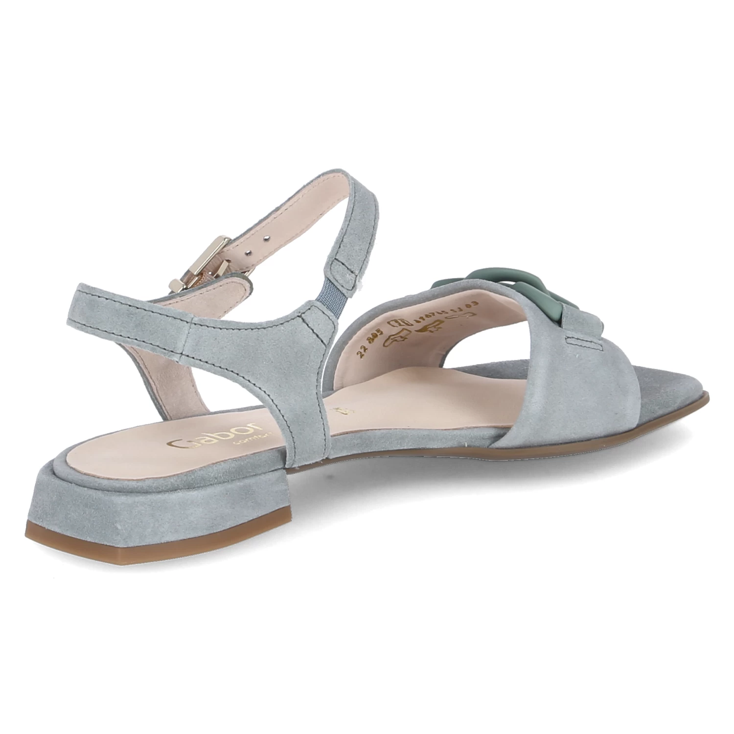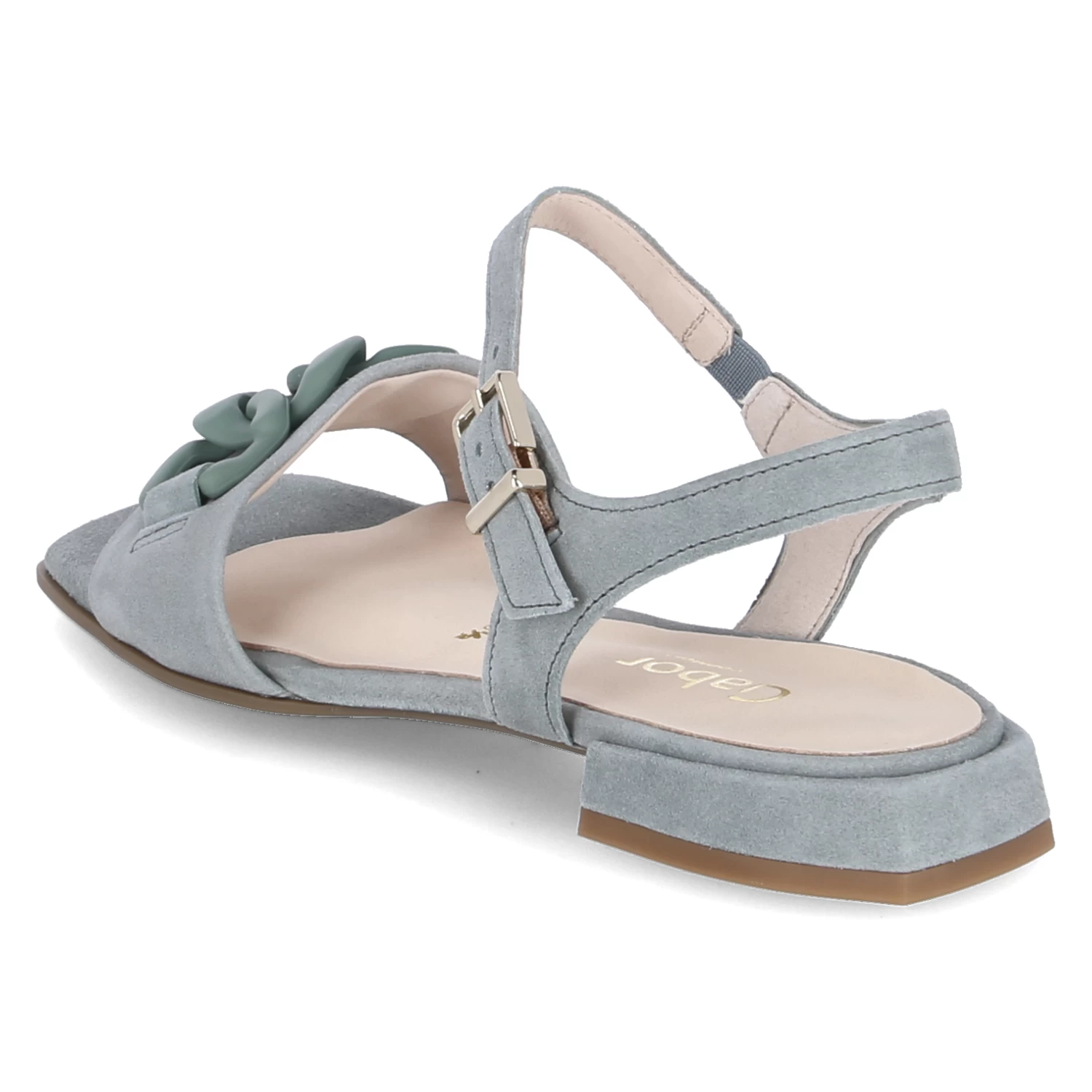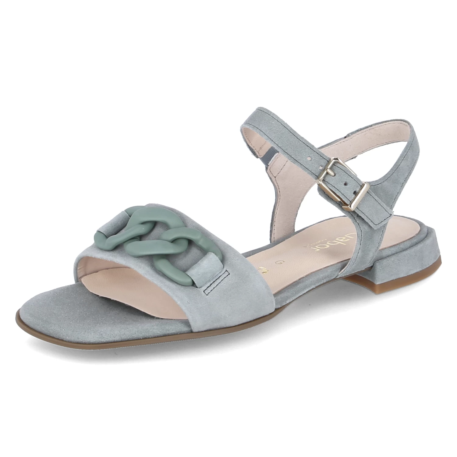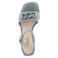 Gabor Damen Sandaletten/ Sandalen GrĂĽn Rauleder – vorderer Riemen mit Kettenelement – Knöchelriemen mit Schnalle und Elastikeinsatz – leicht gepolsterte Lederdecksohle – flexible, rutschhemmende Laufsohle – kleiner Blockabsatz