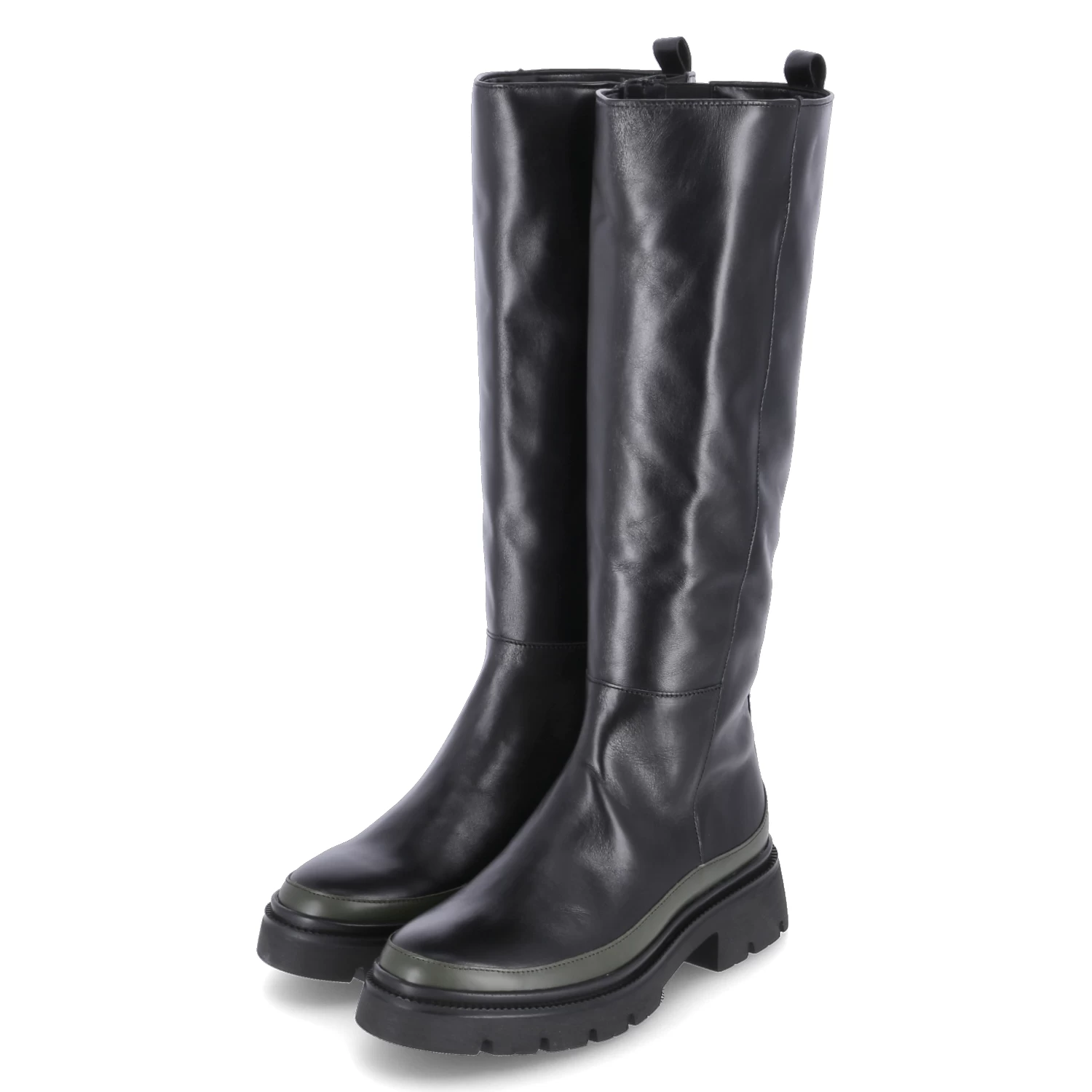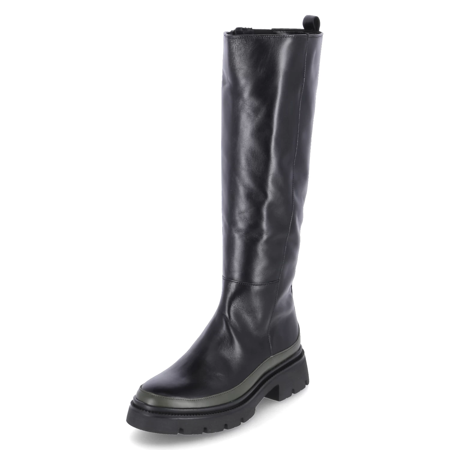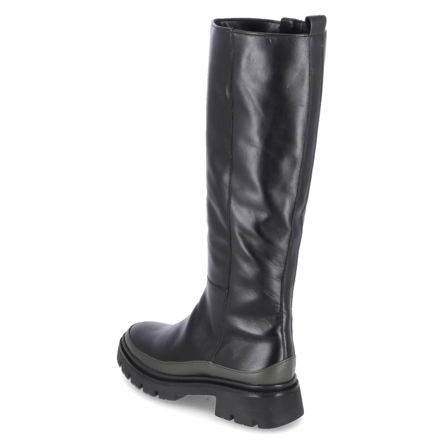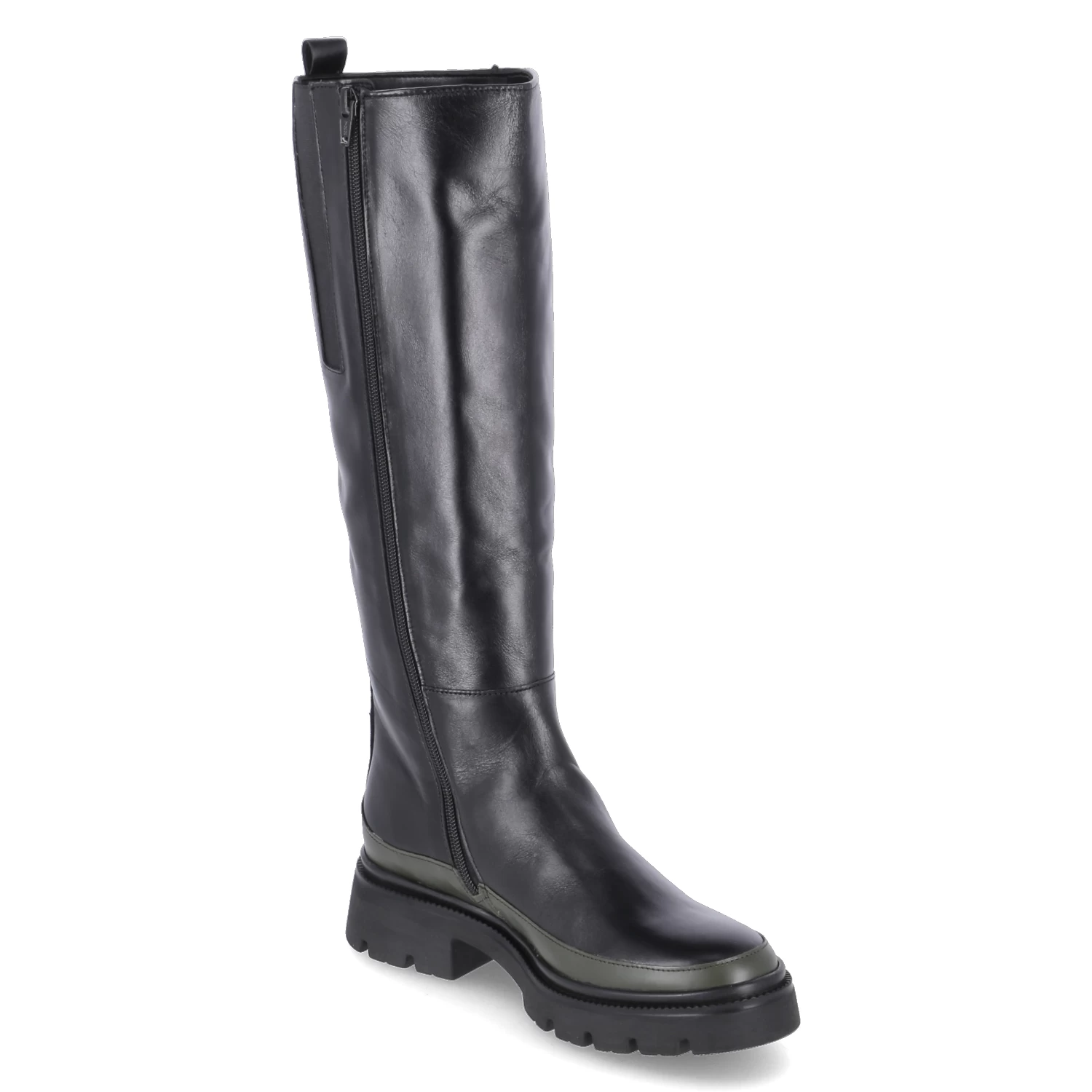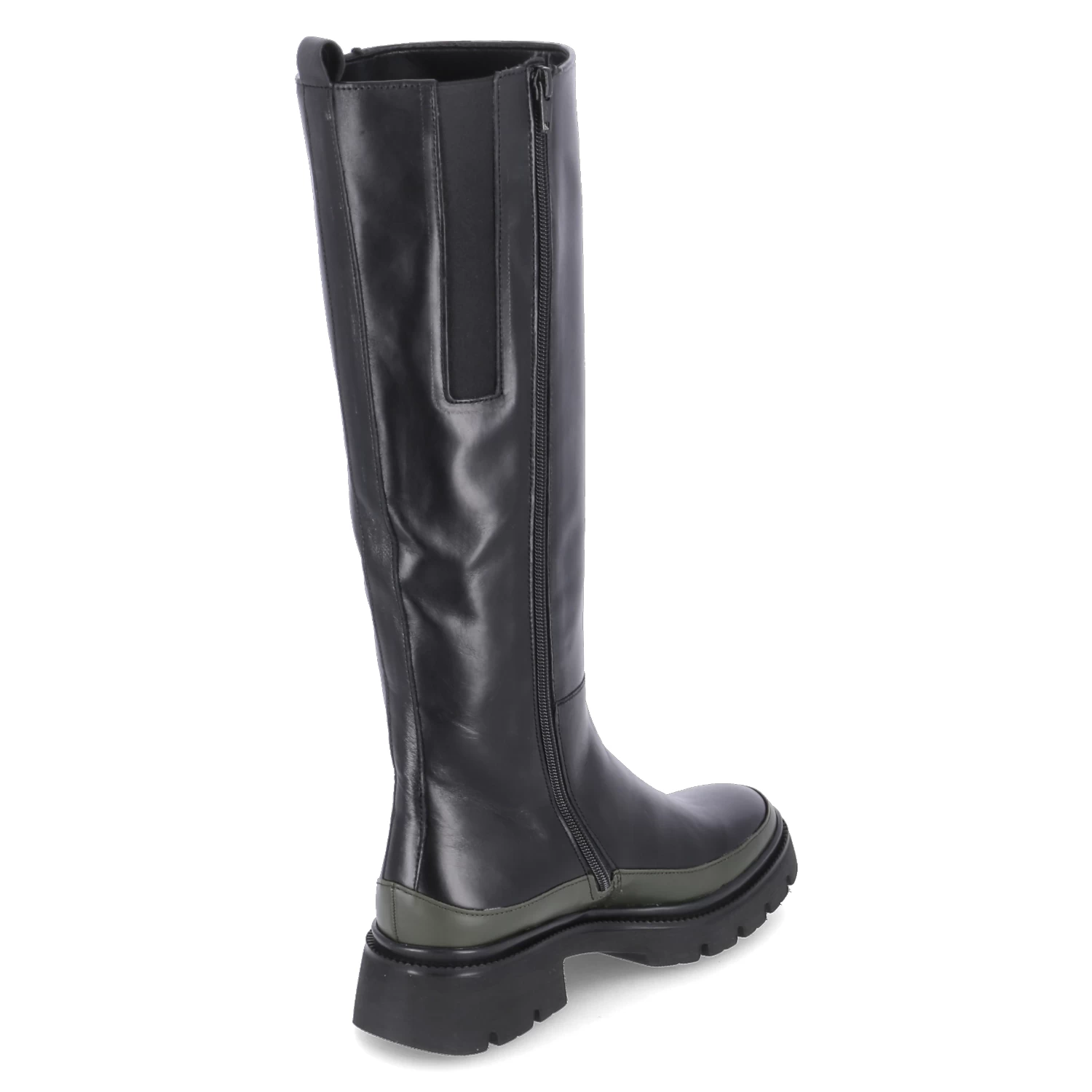 Gabor Damen underknee Stiefel Schwarz Glattleder – ReiĂźverschluss – seitlicher Elastikeinsatz – Anziehlasche – verstärkter FuĂźrahmen in GrĂĽn – rutschhemmende Profilsohle – angenehmes Textilfutter – herausnehmbares FuĂźbett