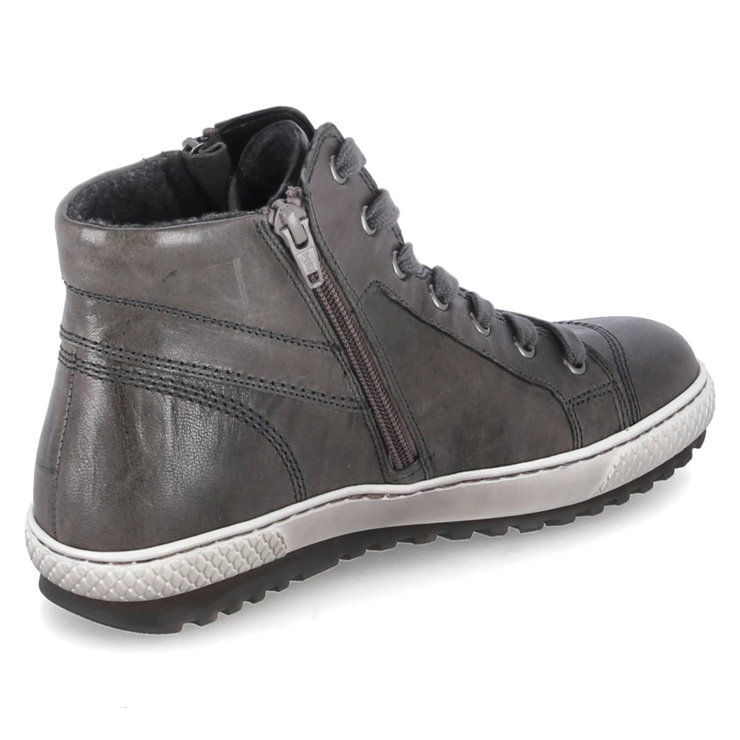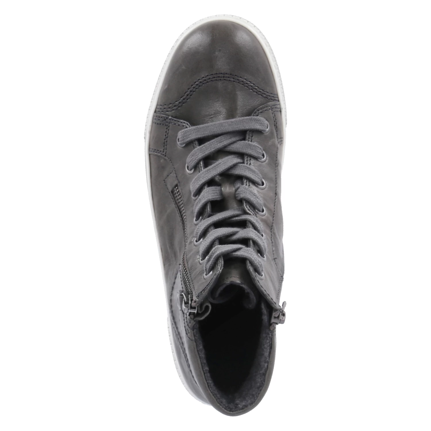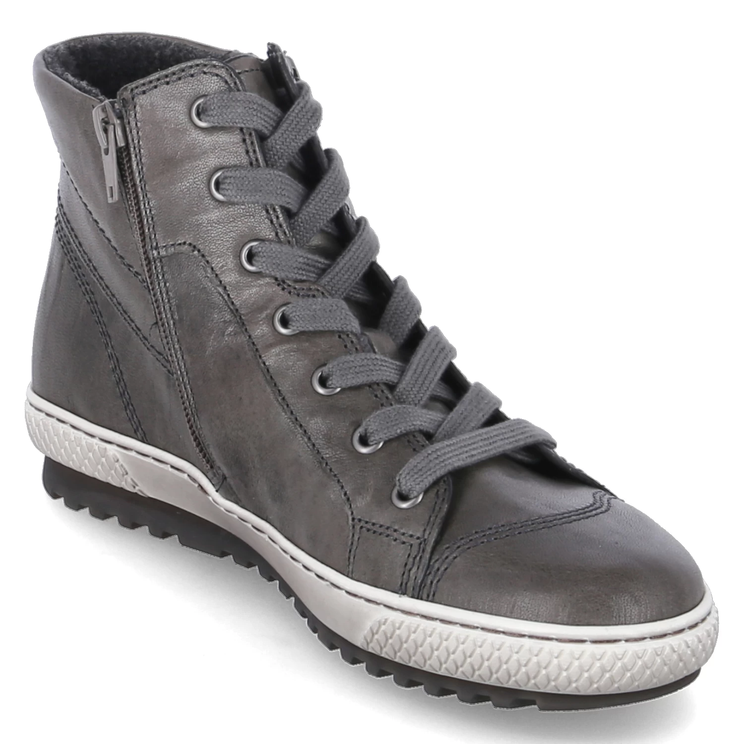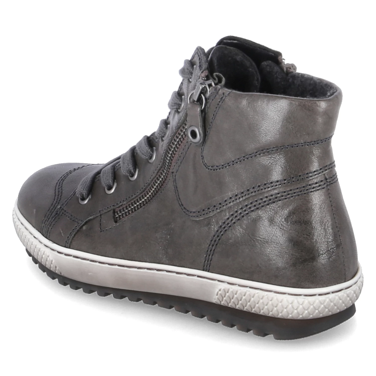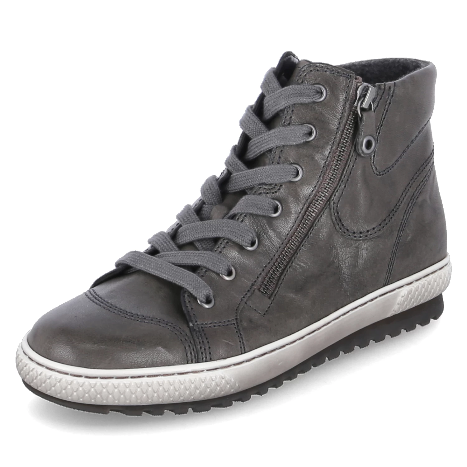 Gabor Damen Stiefeletten Grau Glattleder – SchnĂĽrung und zwei ReiĂźverschlĂĽsse – Ziernähte – gepolsterter Einstieg – verstärkter Zehen- und Fersenbereich – Fleecefutter fĂĽr kĂĽhle Tage – WechselfuĂźbett – flexible Laufsohle
