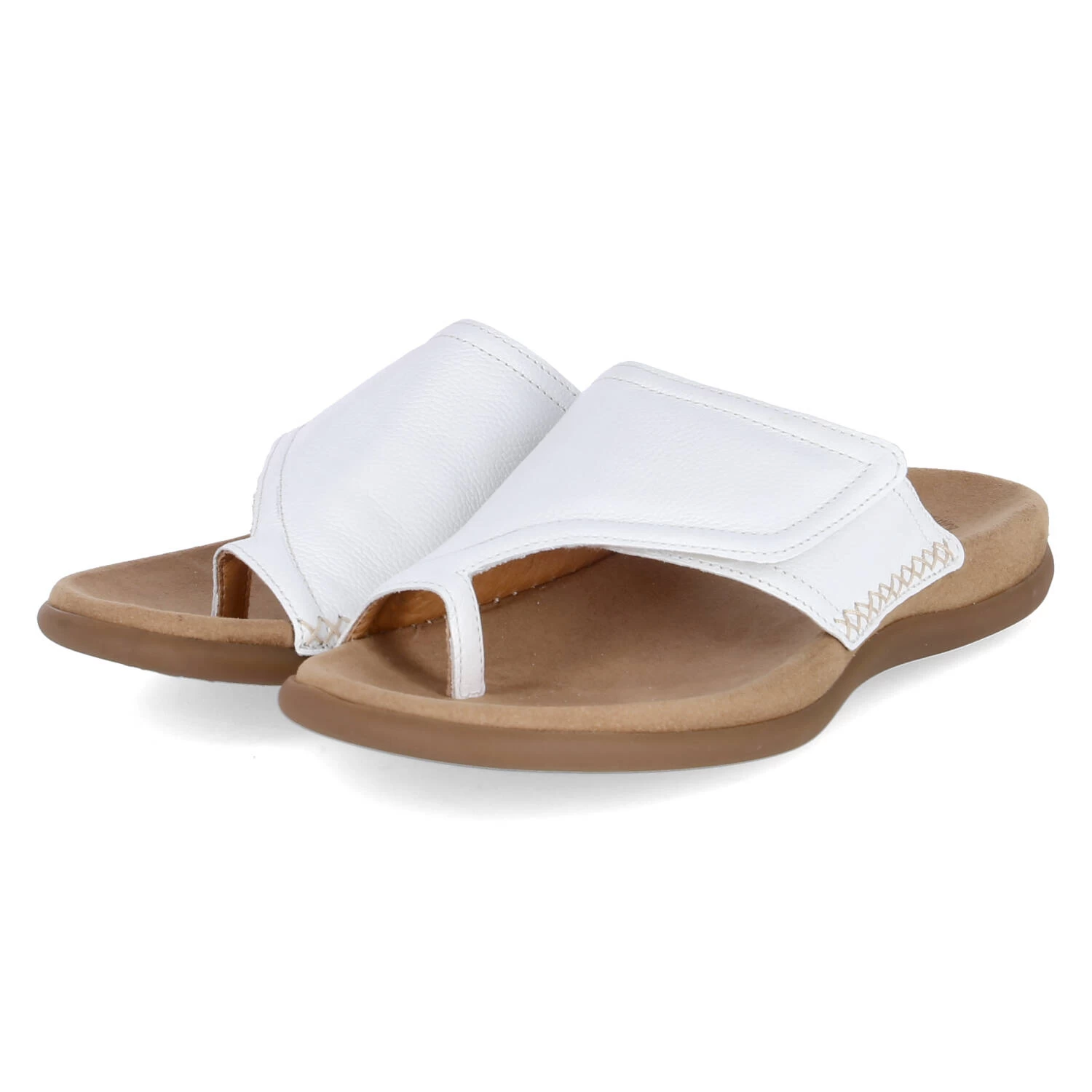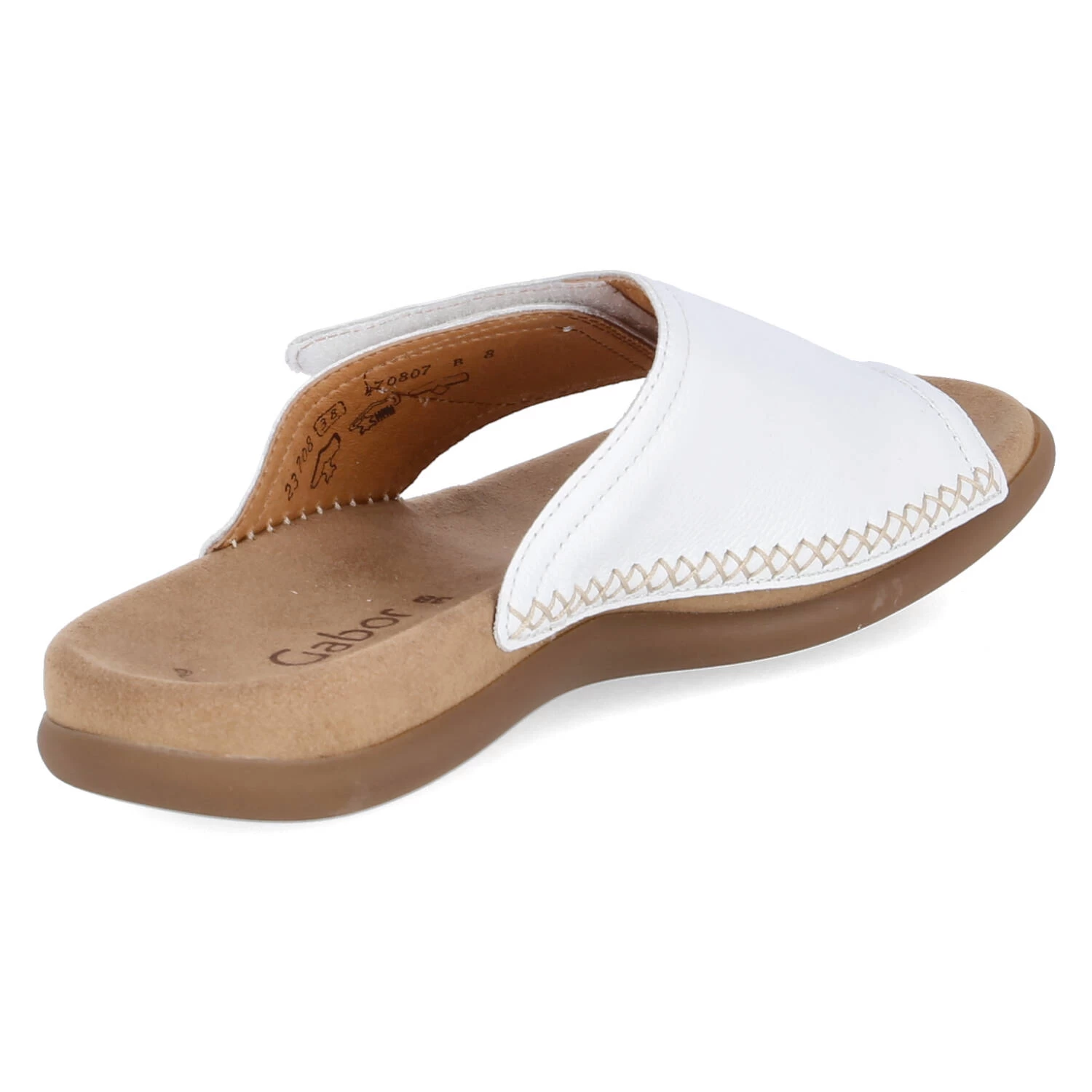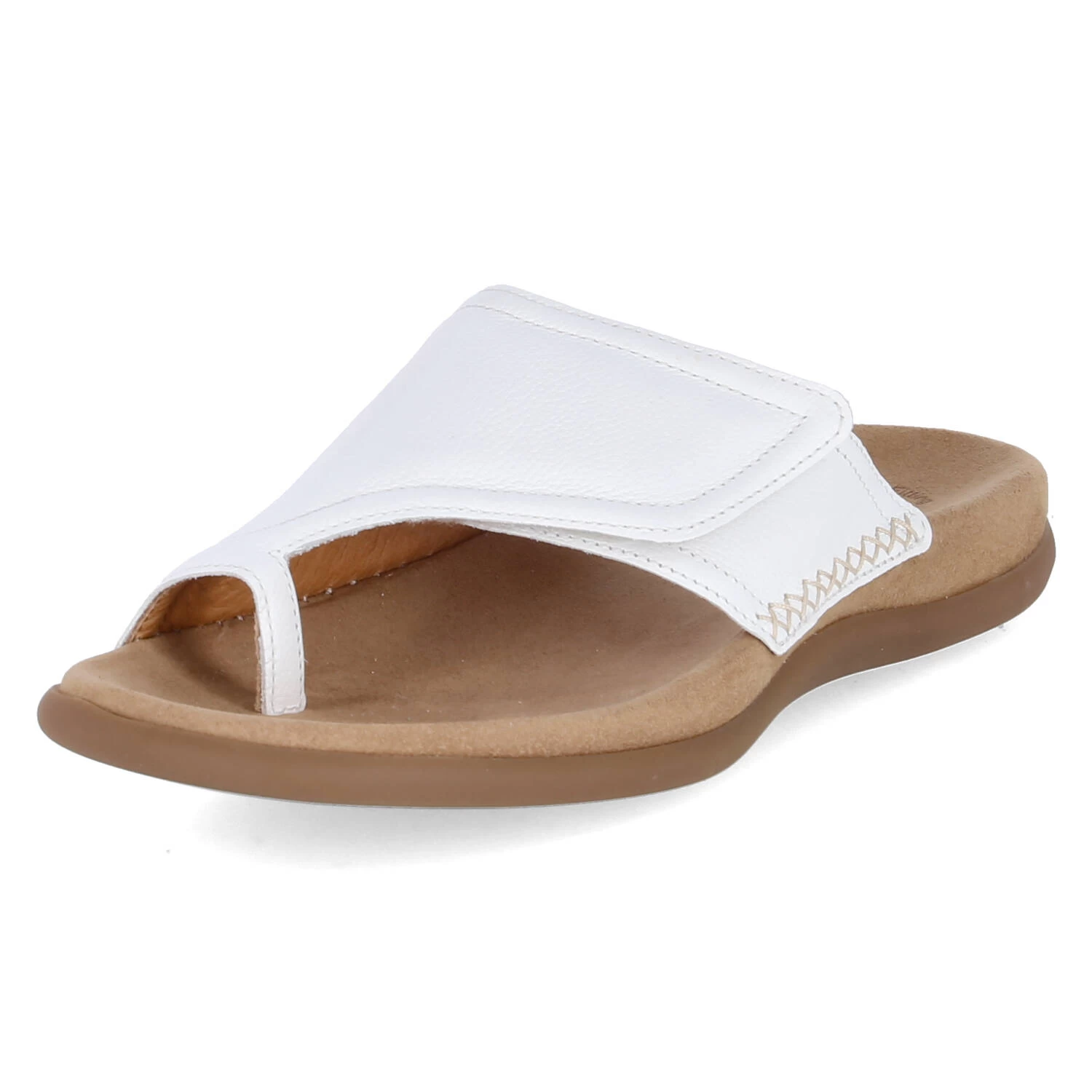 Gabor Damen Pantoletten/ Zehentrenner WeiĂź Rauleder – Klettverschlussriemen – seitliche Ziernähte – gepolstertes TieffuĂźbett – flexible, rutschhemmende Laufsohle