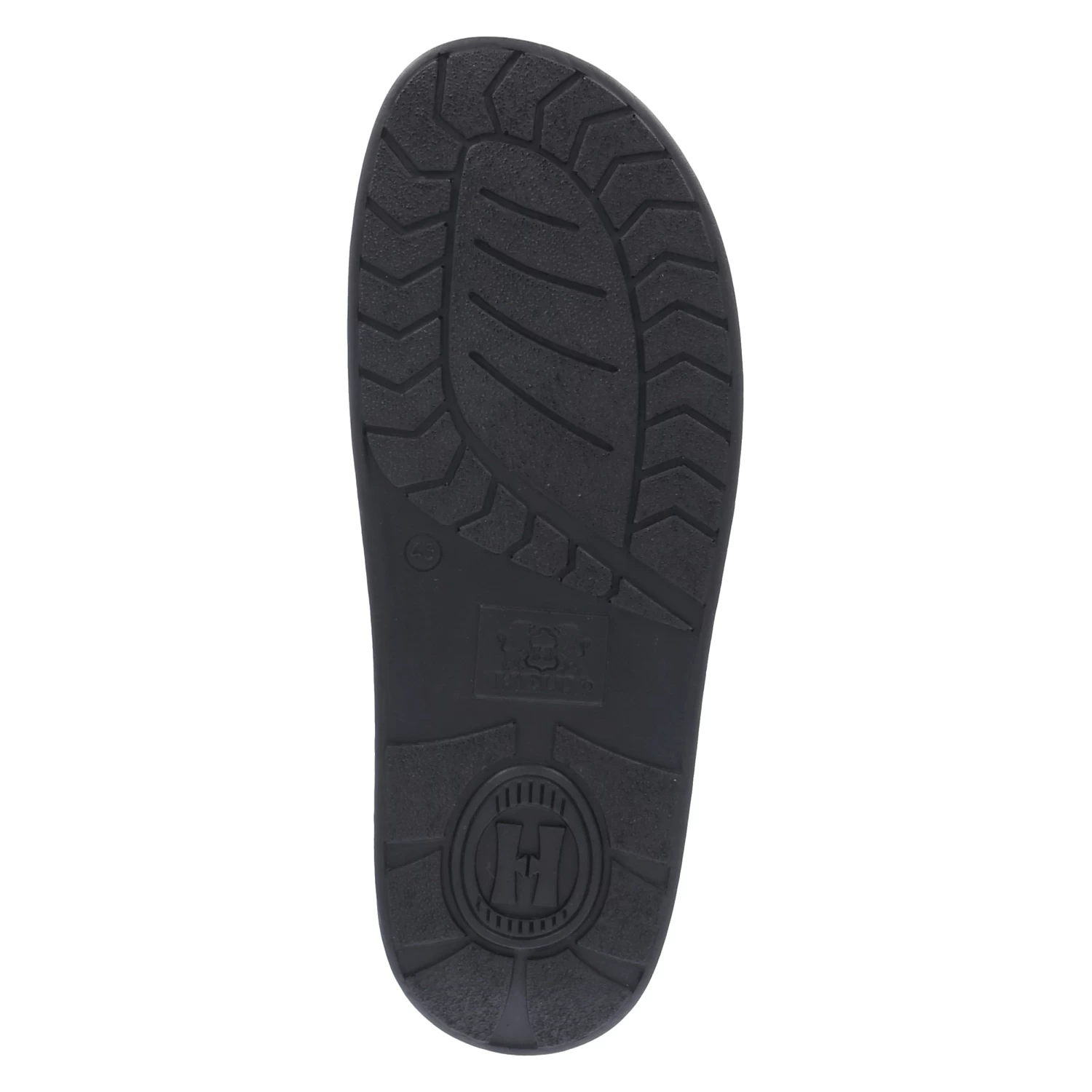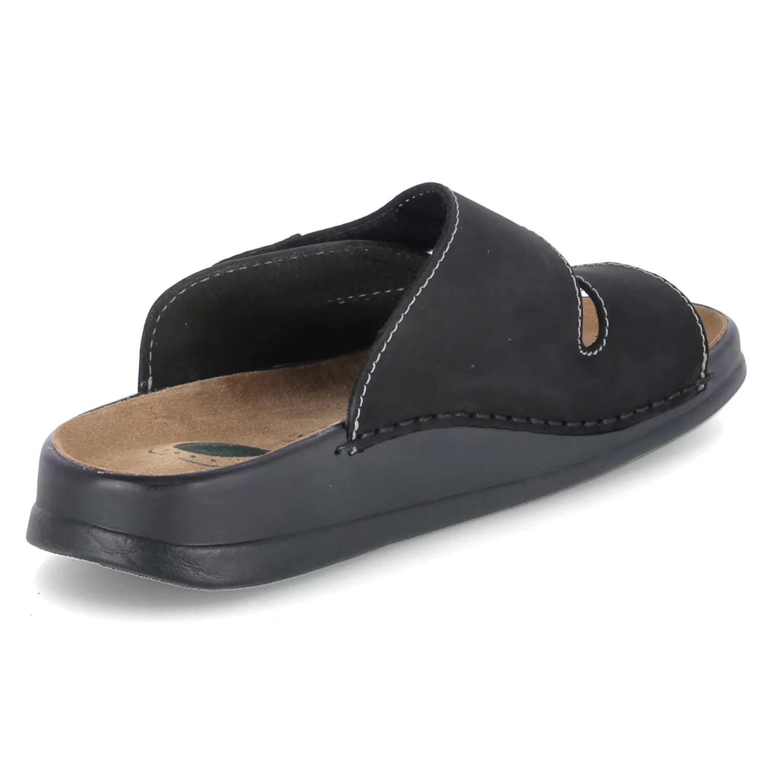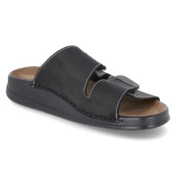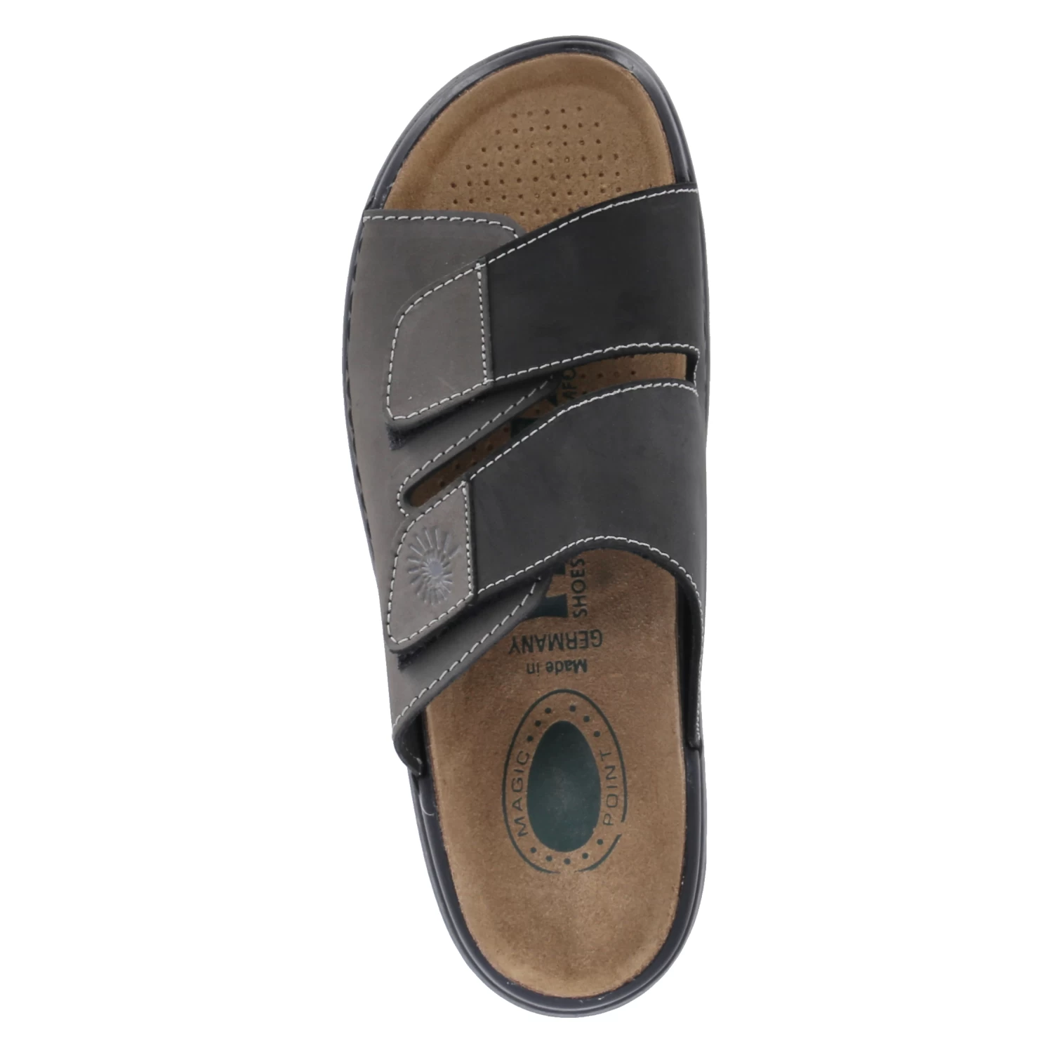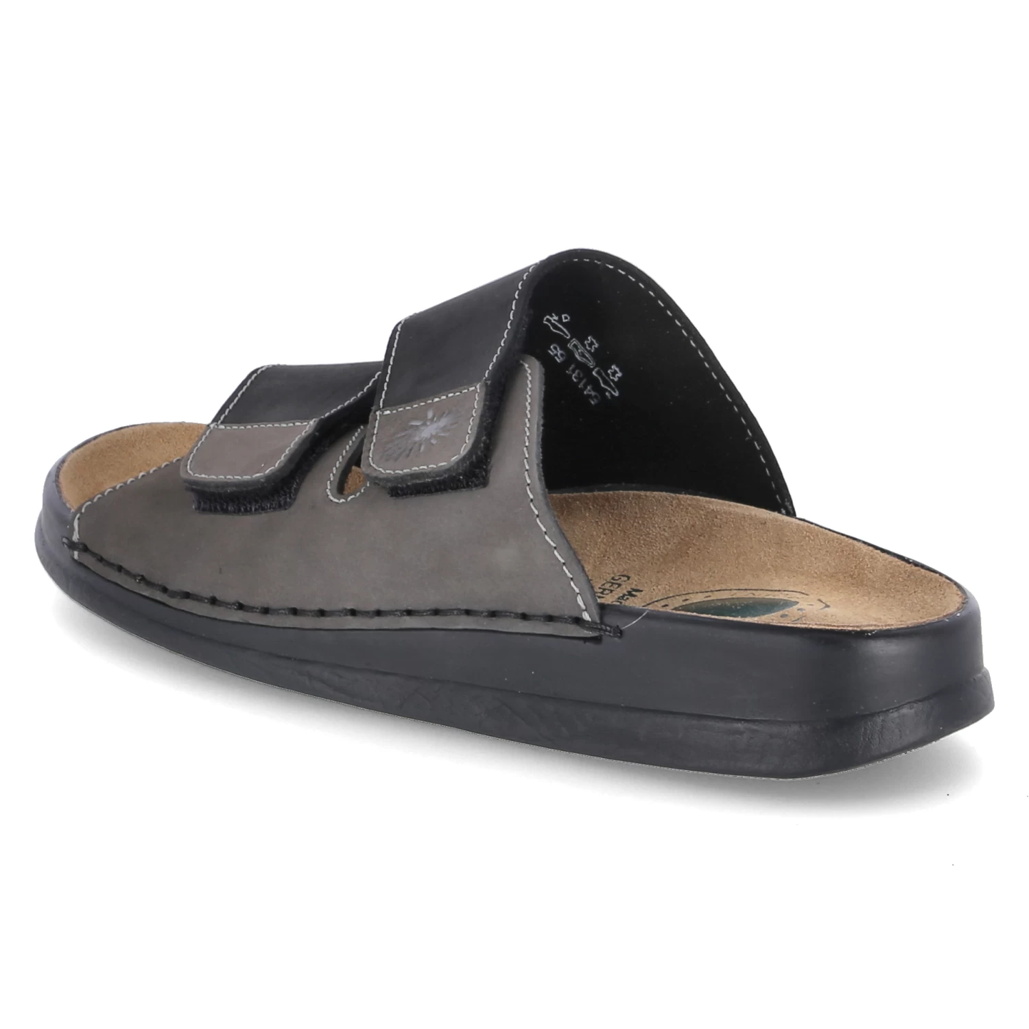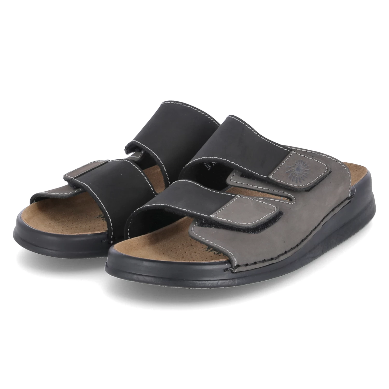 Helix Herren Pantoletten Schwarz-Grau Nubukleder – zwei breite Riemen mit Klettverschluss – angenehmes Lederfutter – TieffuĂźbett mit Lederdecksohle und gepolsterter Ferse – flexible, rutschhemmende Sohle mit dezentem Profil
