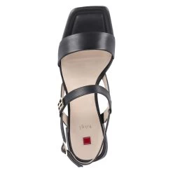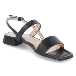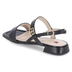 Högl Damen Sandaletten/ Sandalen Schwarz Glattleder – metallisch schimmernde Oberfläche – Markenbutton – Schnalle mit Elastikeinsatz – Lederdecksohle – flexible, rutschhemmende Laufsohle – modischer, flacher Blockabsatz