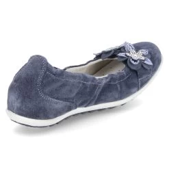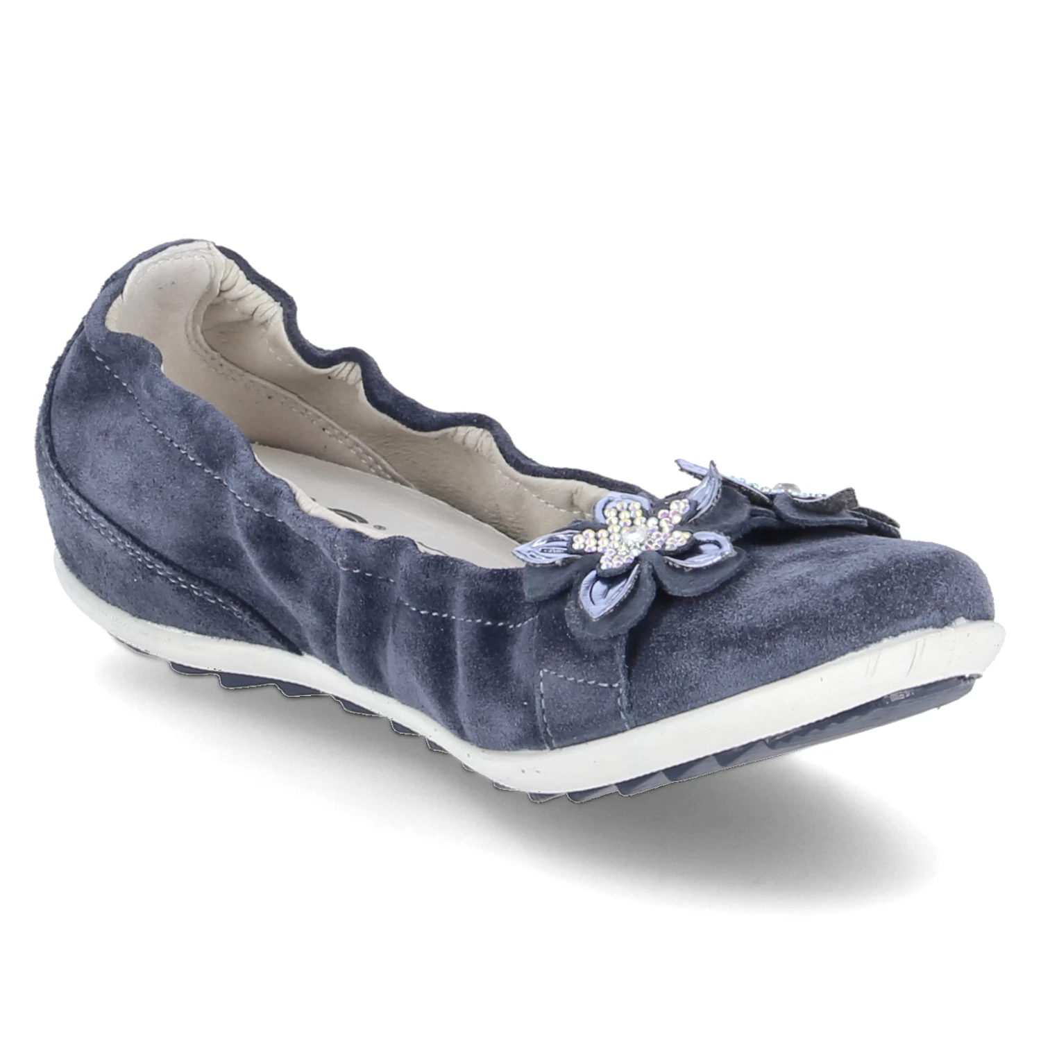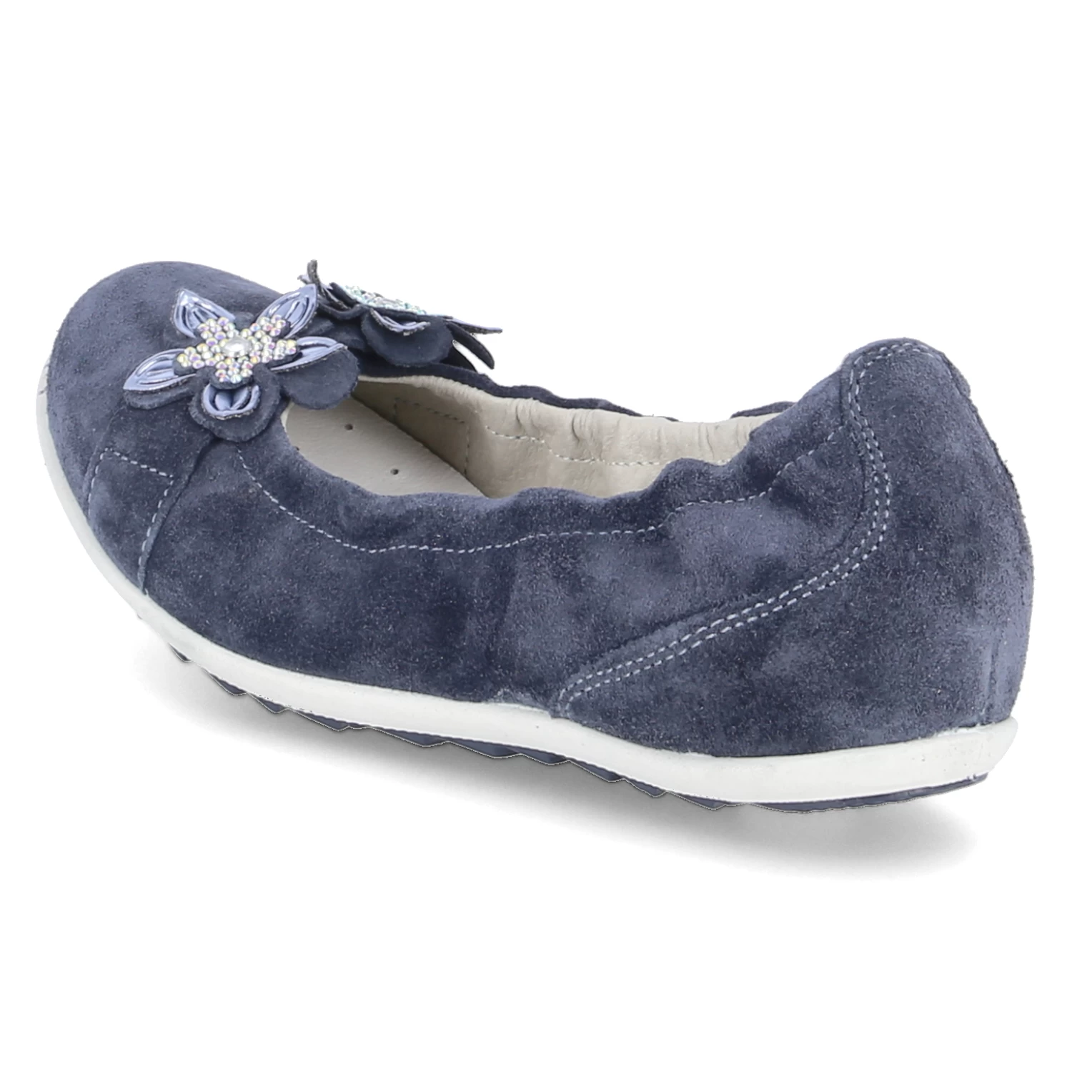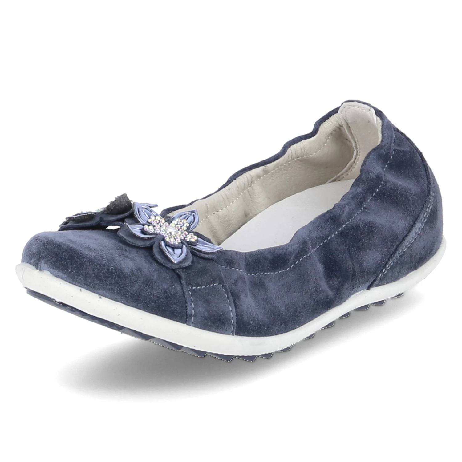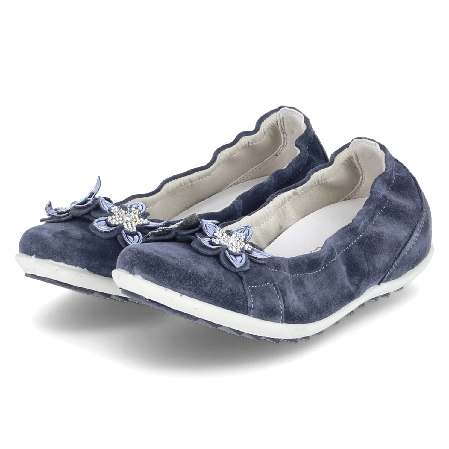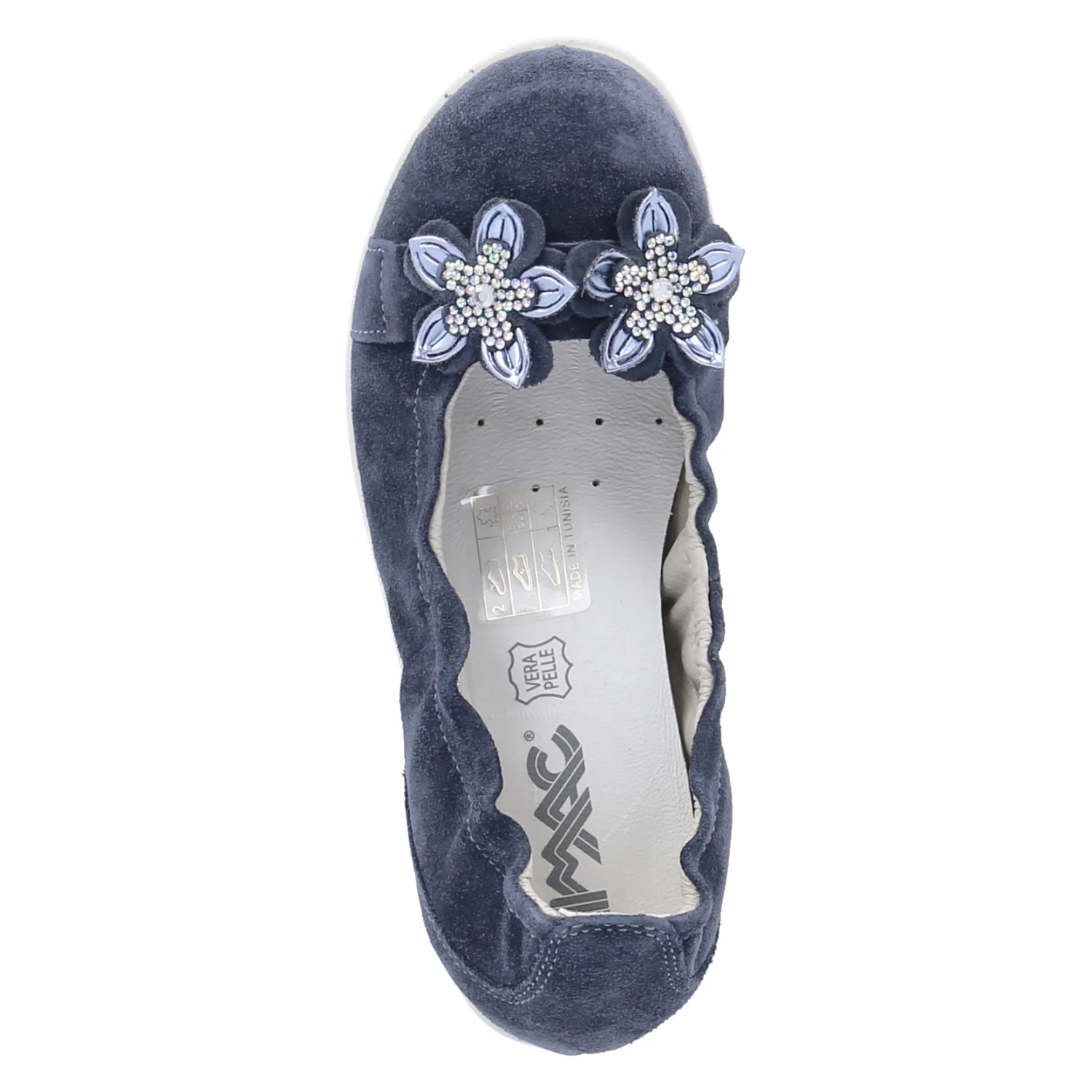 Imac Mädchen Ballerinas Blau Rauleder – hĂĽbsche Blumenmotive mit Glitzersteinen – elastischer Einstieg – verstärkter Fersenbereich – gepolsterte Wechseldecksohle – sehr flexible, rutschhemmende Profilsohle