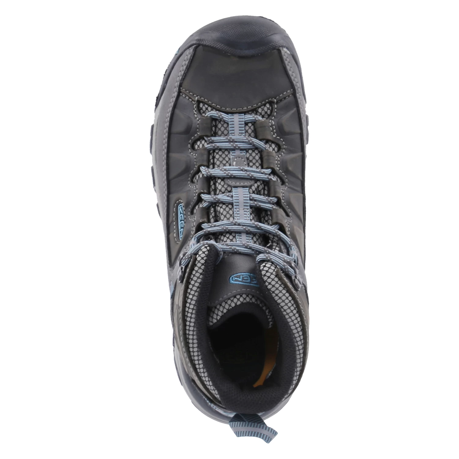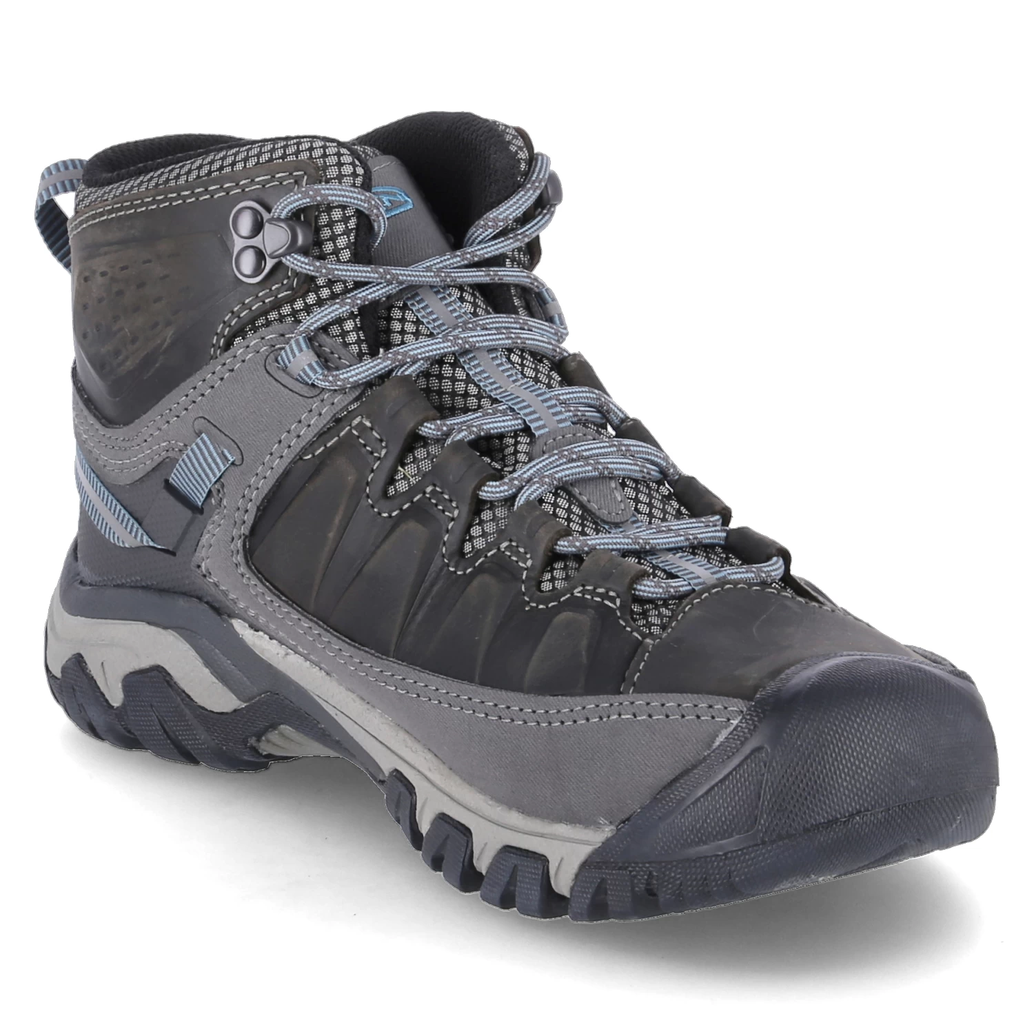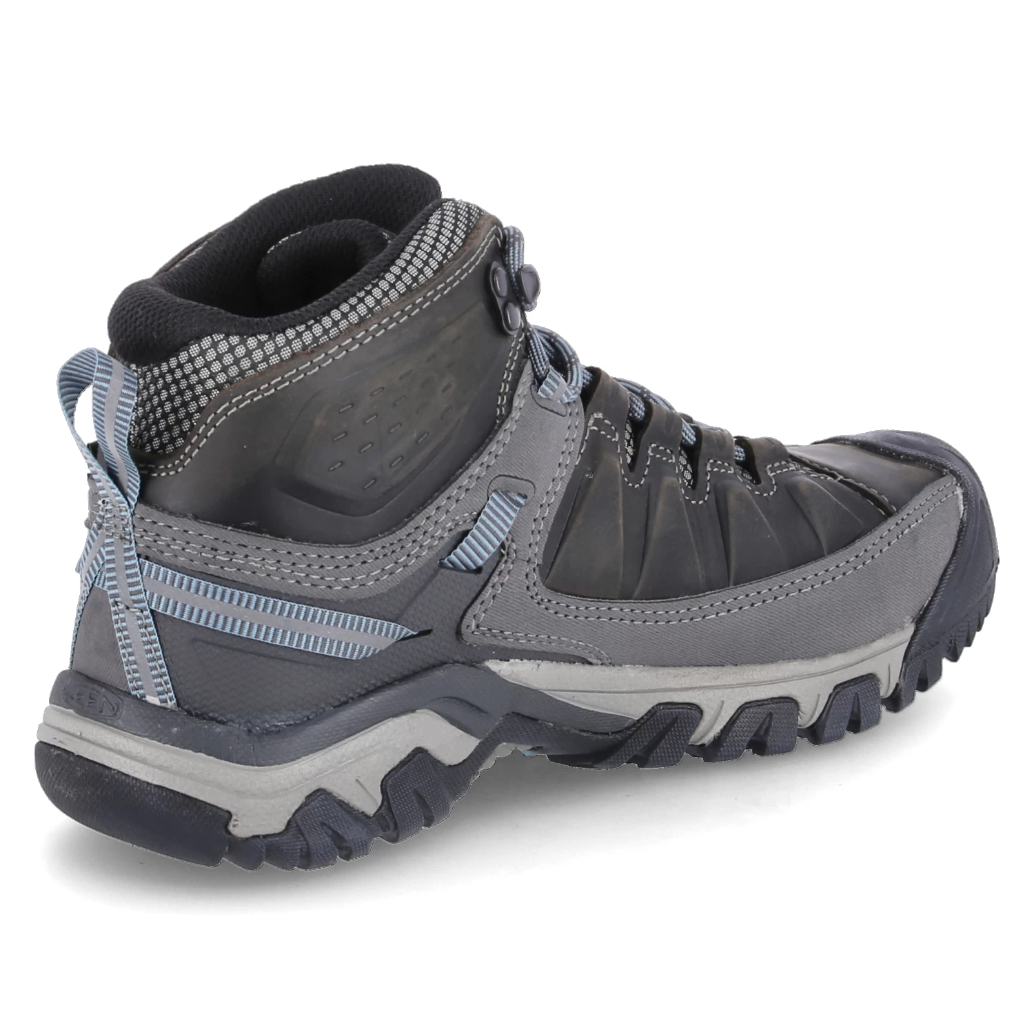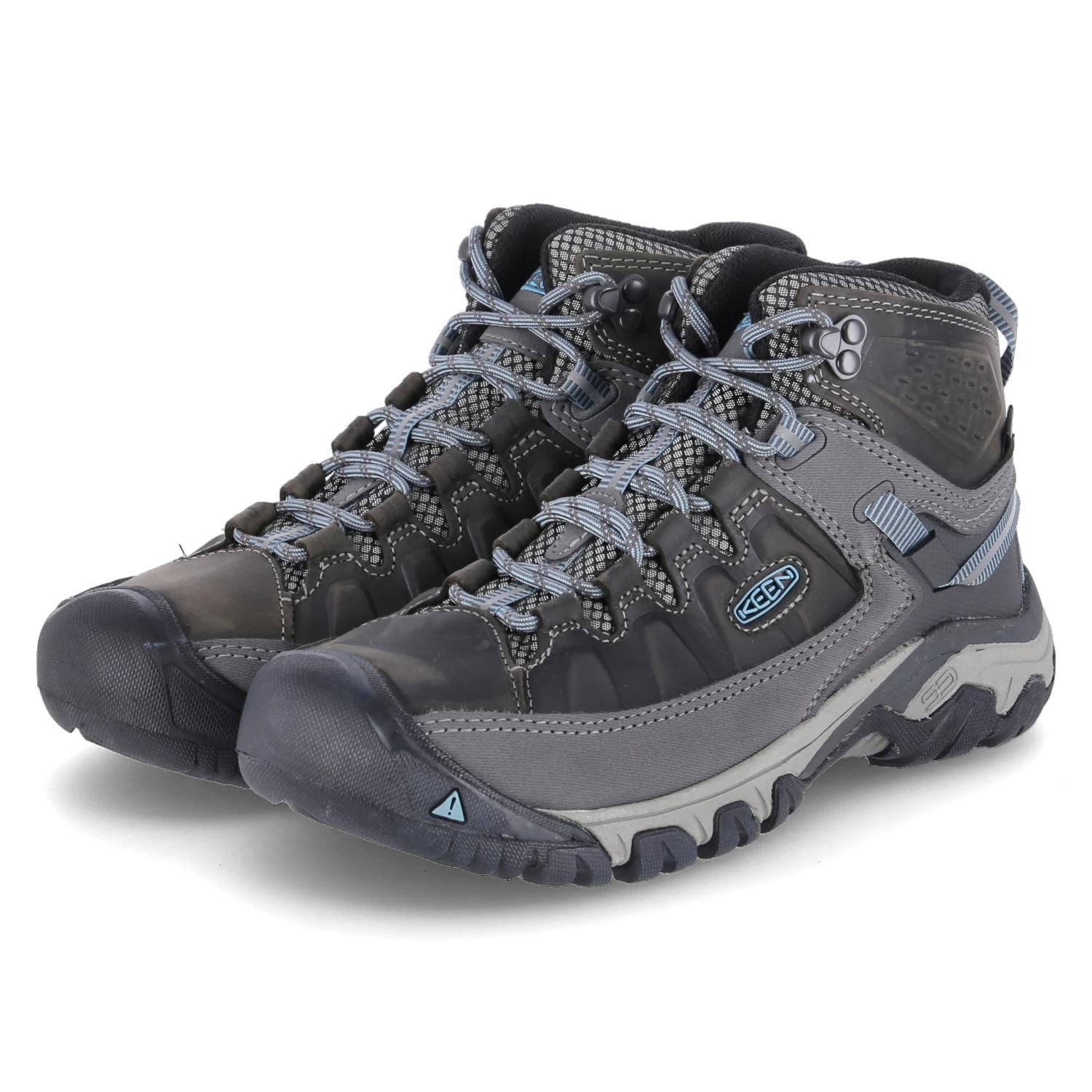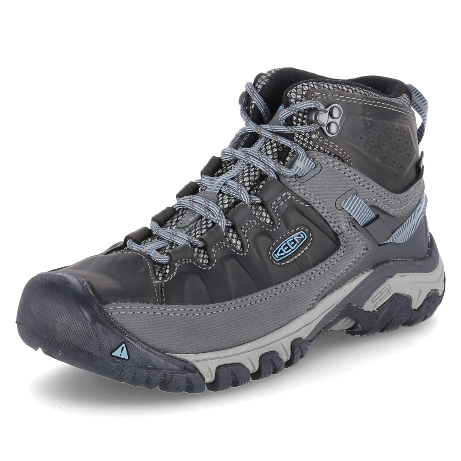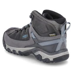 Keen Damen Outdoorschuhe/ High Sneaker TARGHEE III MID WP Grau Leder-Textil-Mix – wasserfest, atmungsaktiv – blaue Highlights – Ziernähte – verstärkter Zehen- und Fersenbereich – gepolsterter Einstieg – gelabelt – gepolstertes WechselfuĂźbett – rutschhemmende Laufsohle – Anziehlasche – reflektierende Details