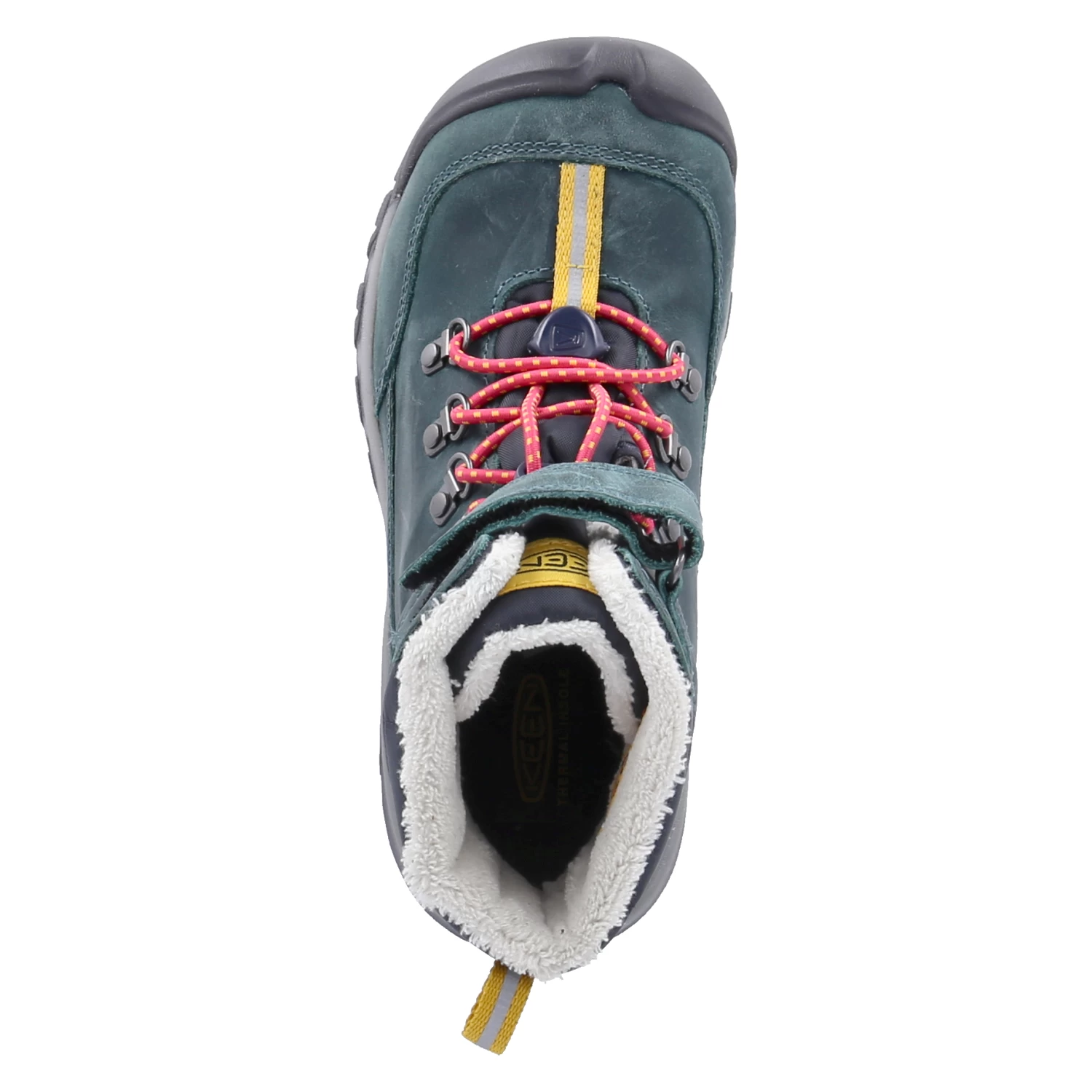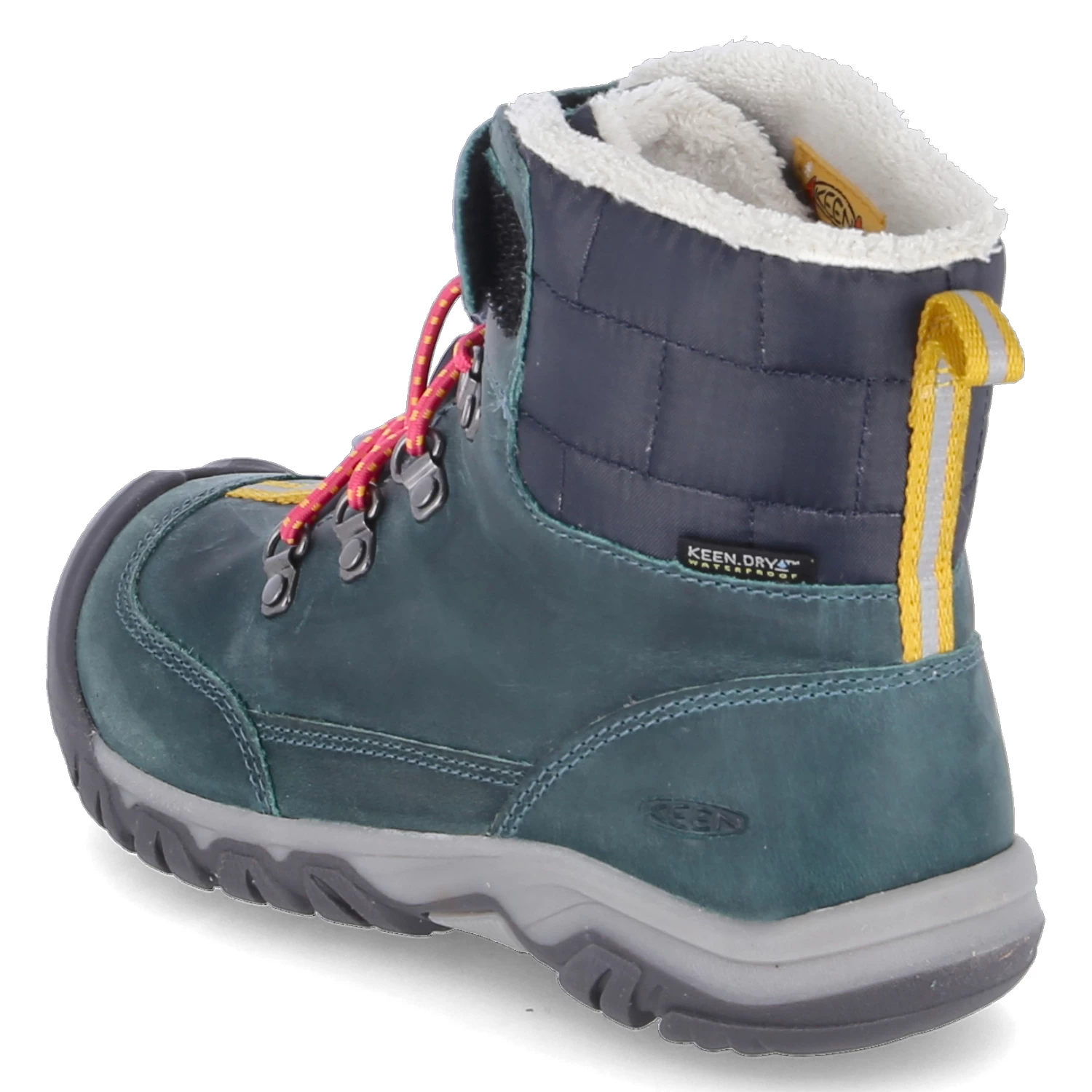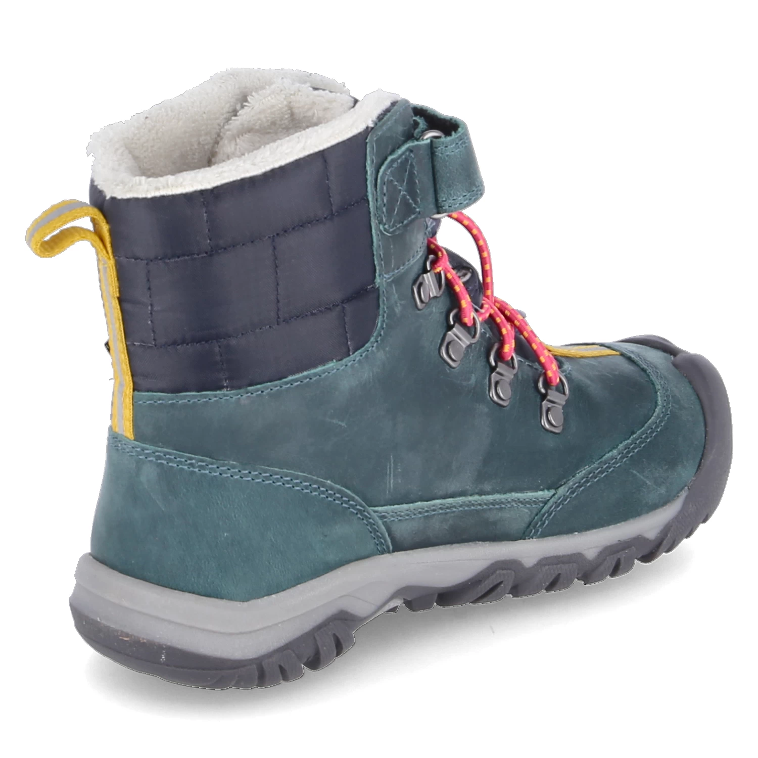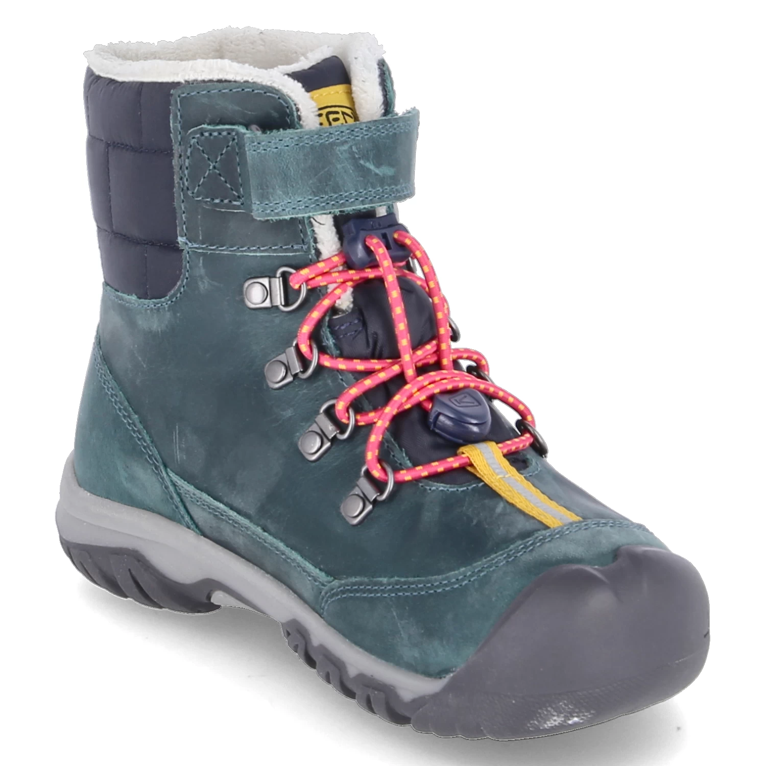 Keen Mädchen Wanderstiefel/ SchnĂĽrboots/ Winter-Stiefeletten GRETA BOOT WP GrĂĽn Leder-Textil-Mix – wasserfest und isolierend (Keen.Dry /bis -32°C) – Klett- und Schnellverschluss – verstärkter FuĂźrahmen – Anziehlasche – blauer gepolsterter Einstieg mit Rechteckmuster – weiches Textilfutter – gepolstertes WechselfuĂźbett – flexible, rutschhemmende Laufsohle – reflektierende Details – Used Look