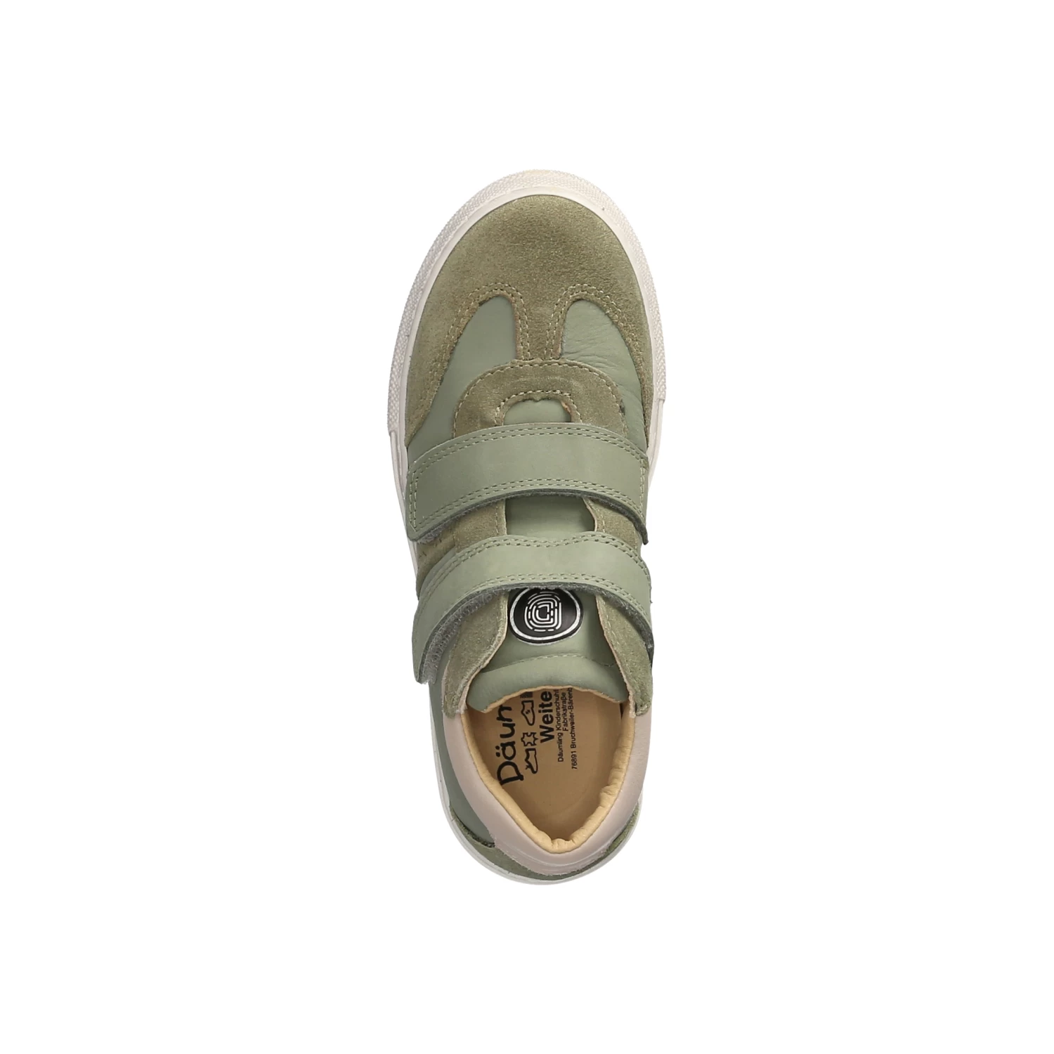 Däumling Kinder Klettschuhe/ Low Sneaker BOB GrĂĽn Leder – sportliches Design – typische Markendetails – Klettverschluss – verstärkter Zehen- und Fersenbereich – gepolsterter Einstieg – leichtes Leder-Textilfutter – gepolsterte Wechseldecksohle – flexible, rutschhemmende Laufsohle mit leichtem Profil