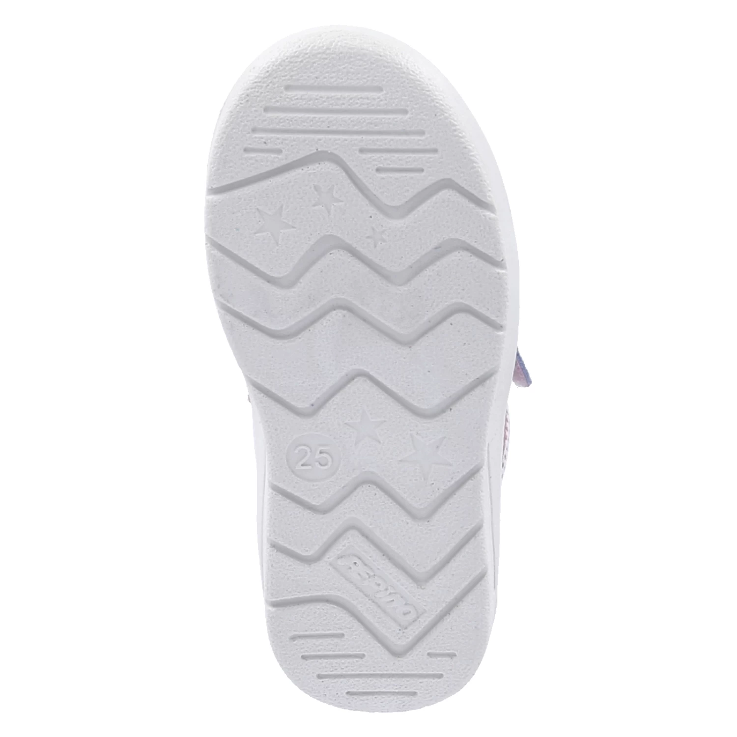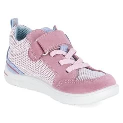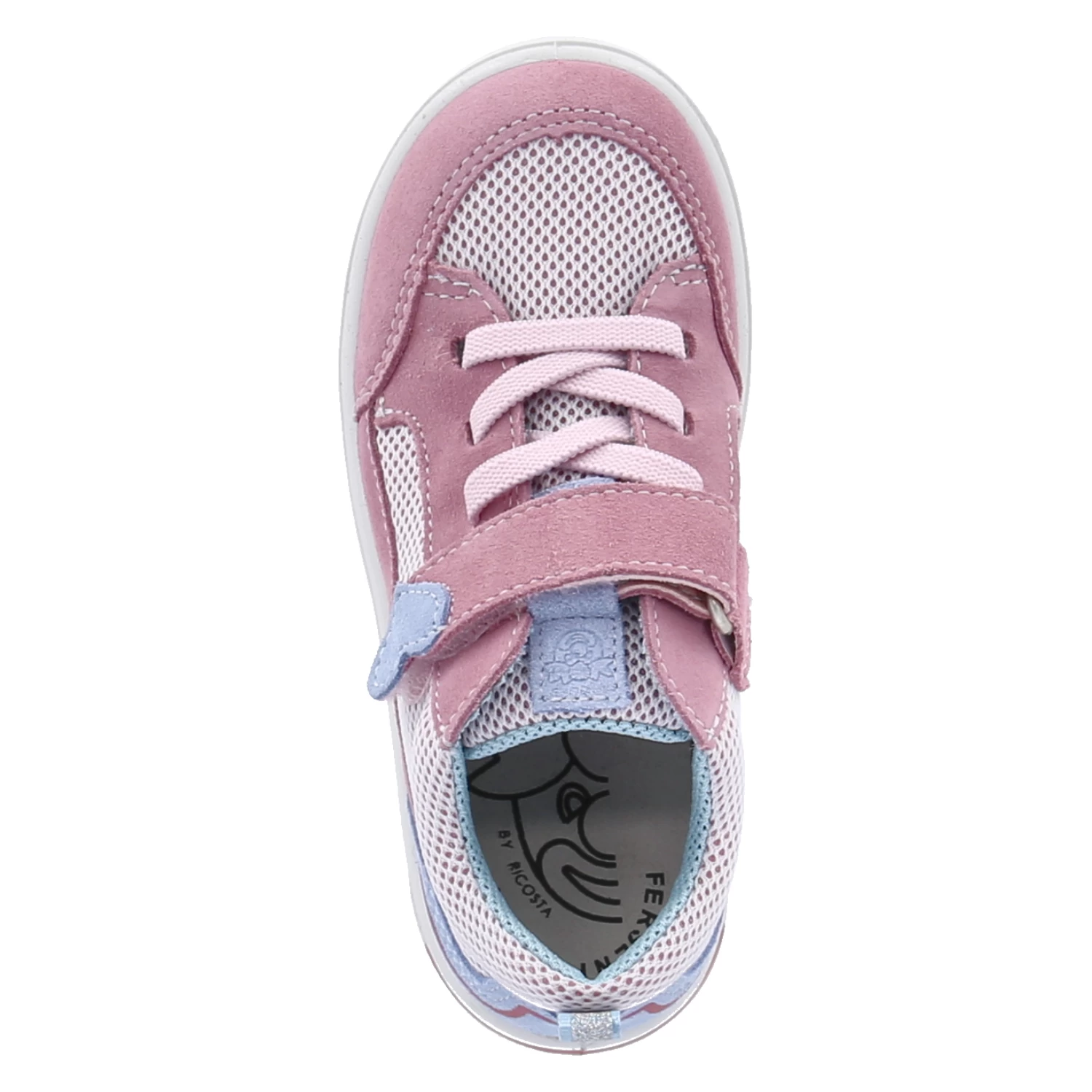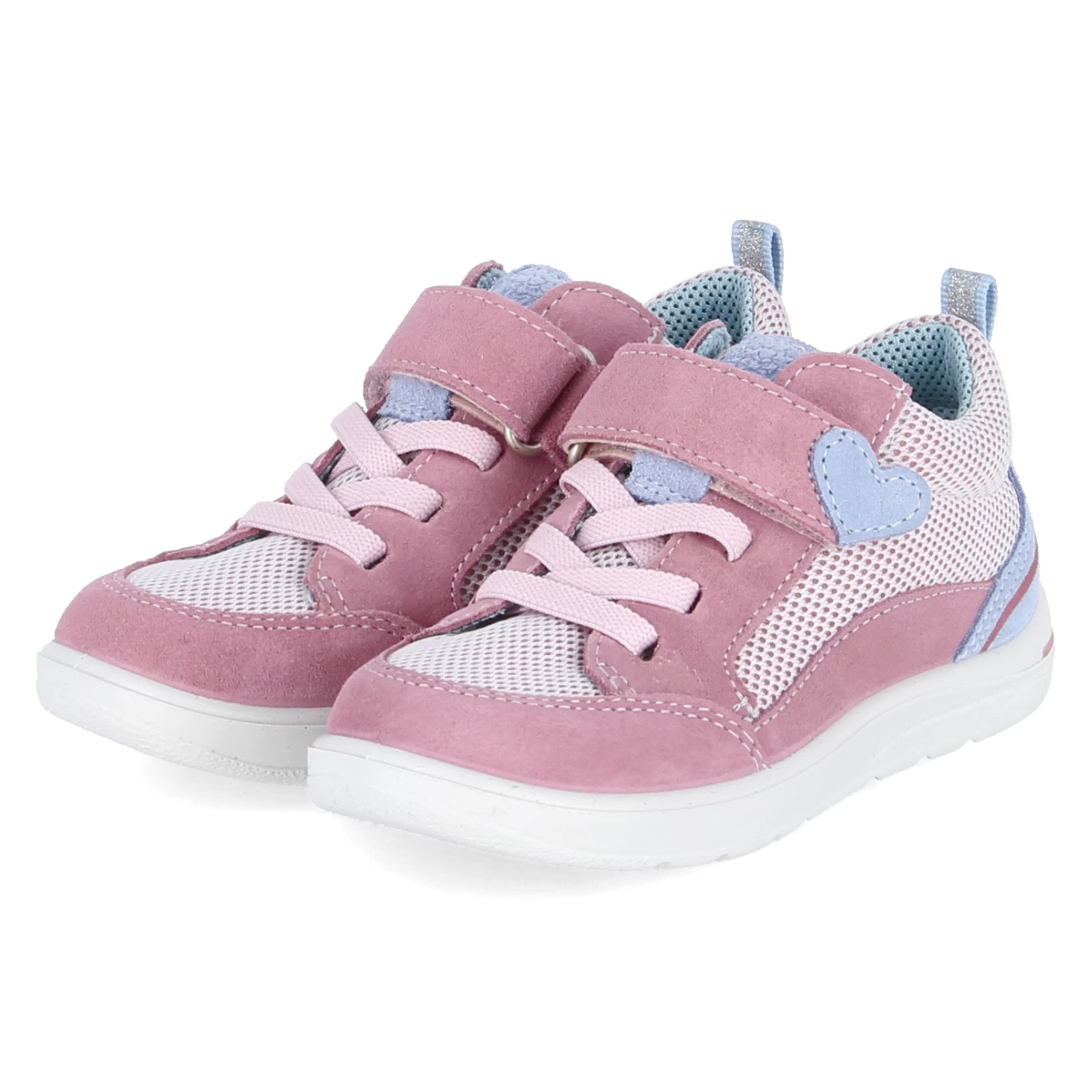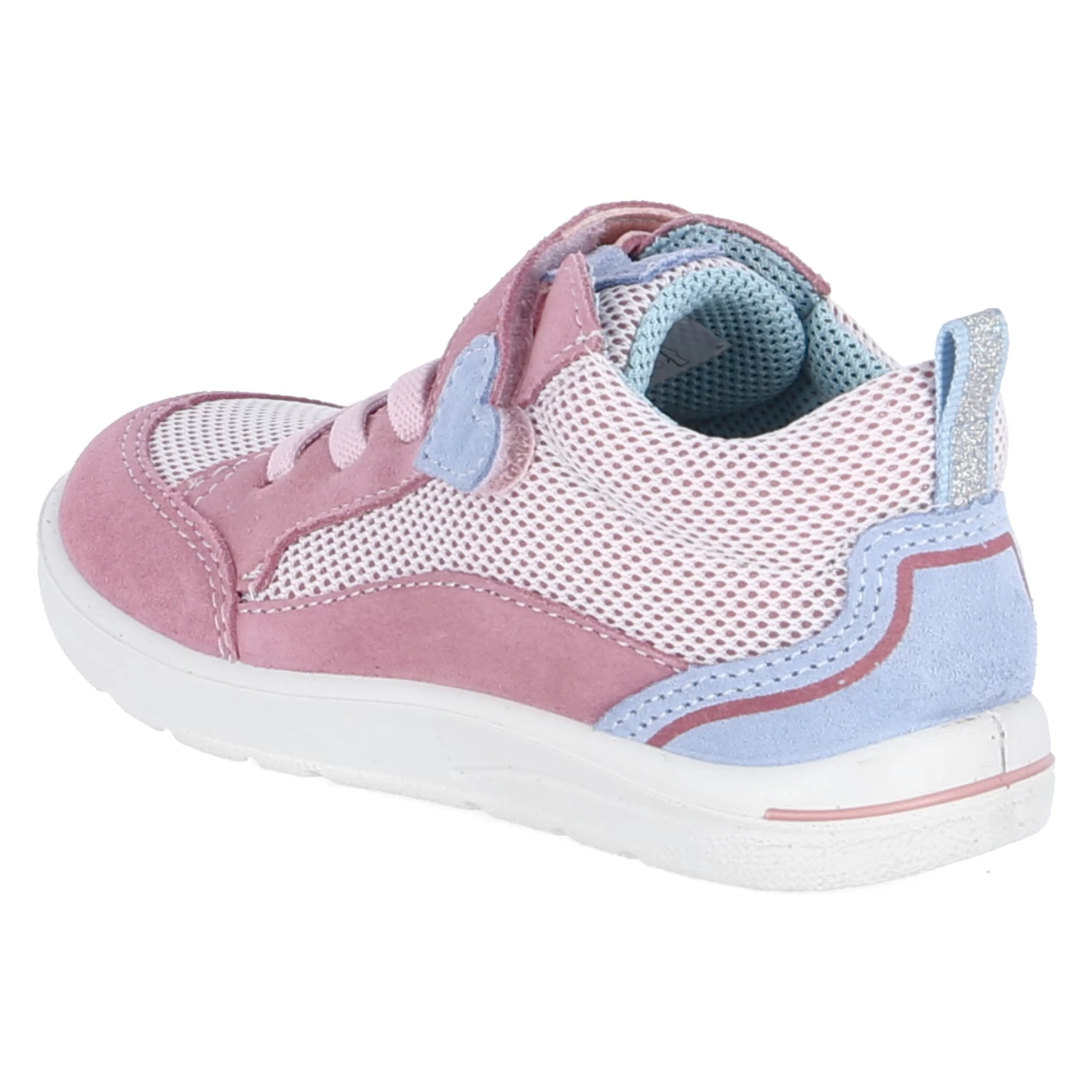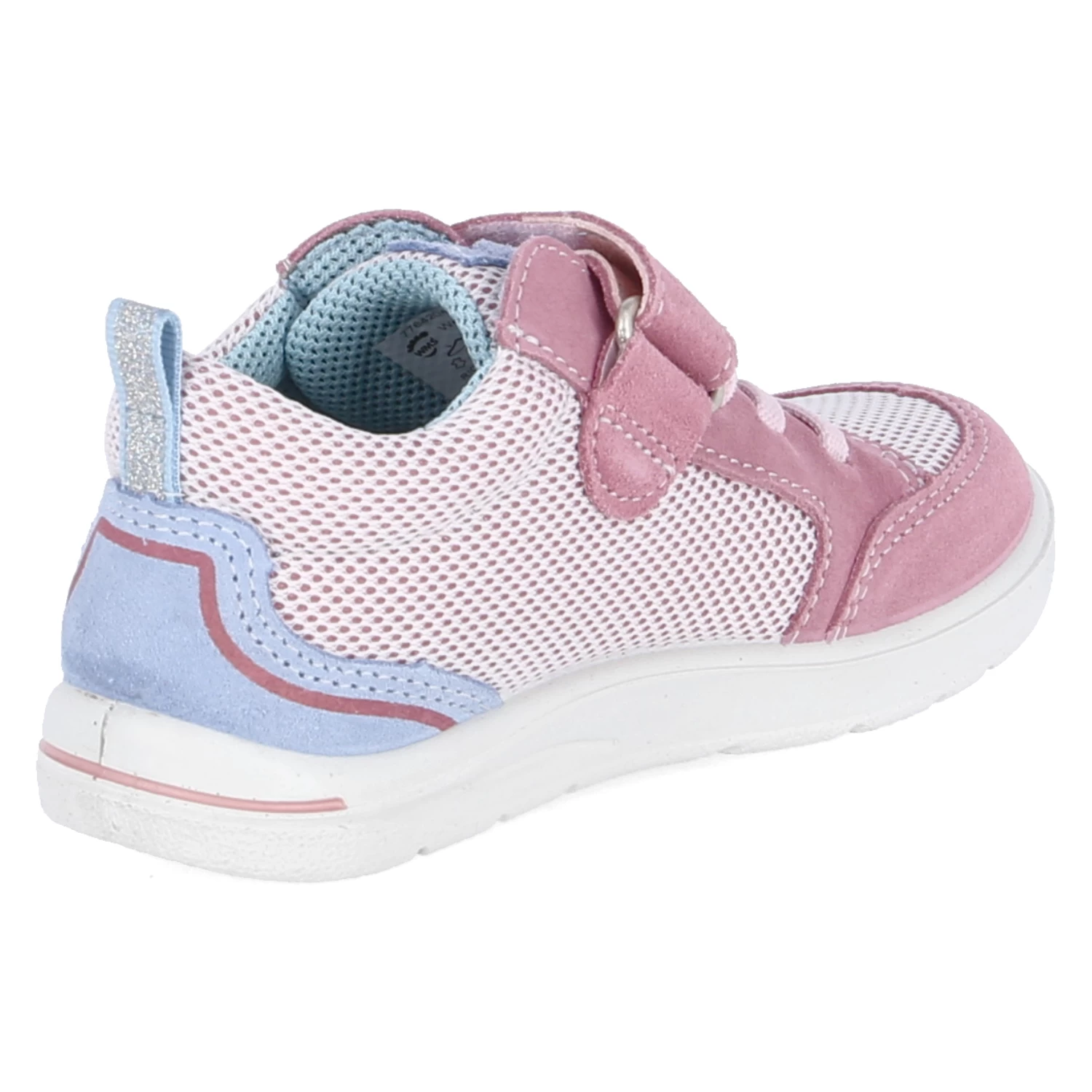 Pepino Mädchen Klettschuhe/ Low Sneaker EMMI Rosa Leder-Synthetik-Mix – Klettverschluss und Elastikband in Schnüroptik – verstärkter Zehen- und Fersenbereich – leicht gepolsterter Einstieg – blaue Highlights – flexible, rutschhemmende Laufsohle – glitzernde Anziehlasche – herausnehmbare Lederdecksohle