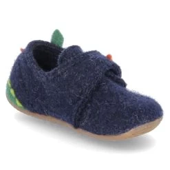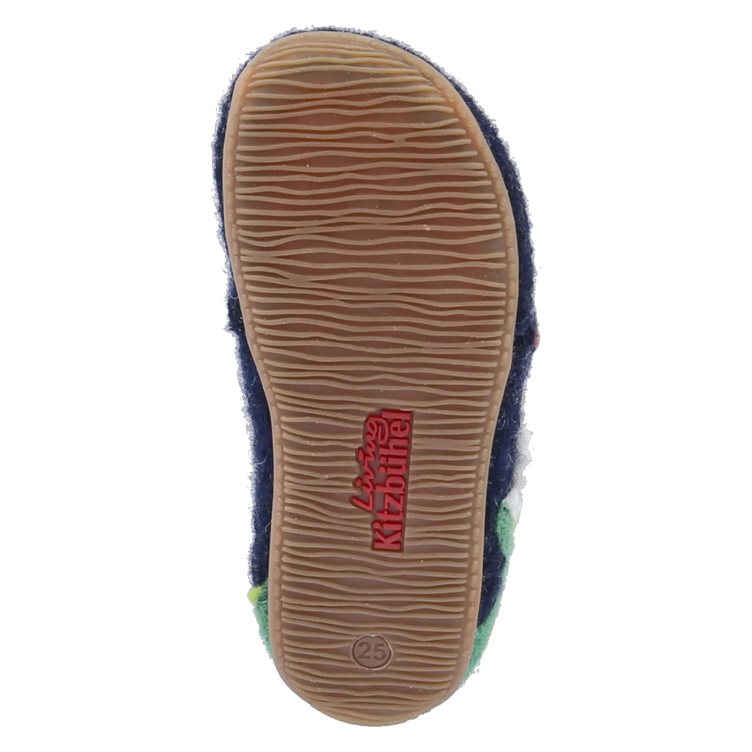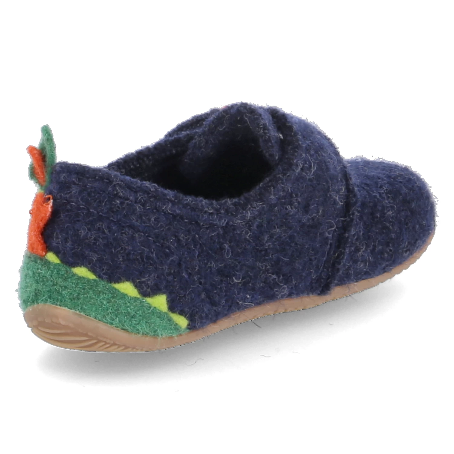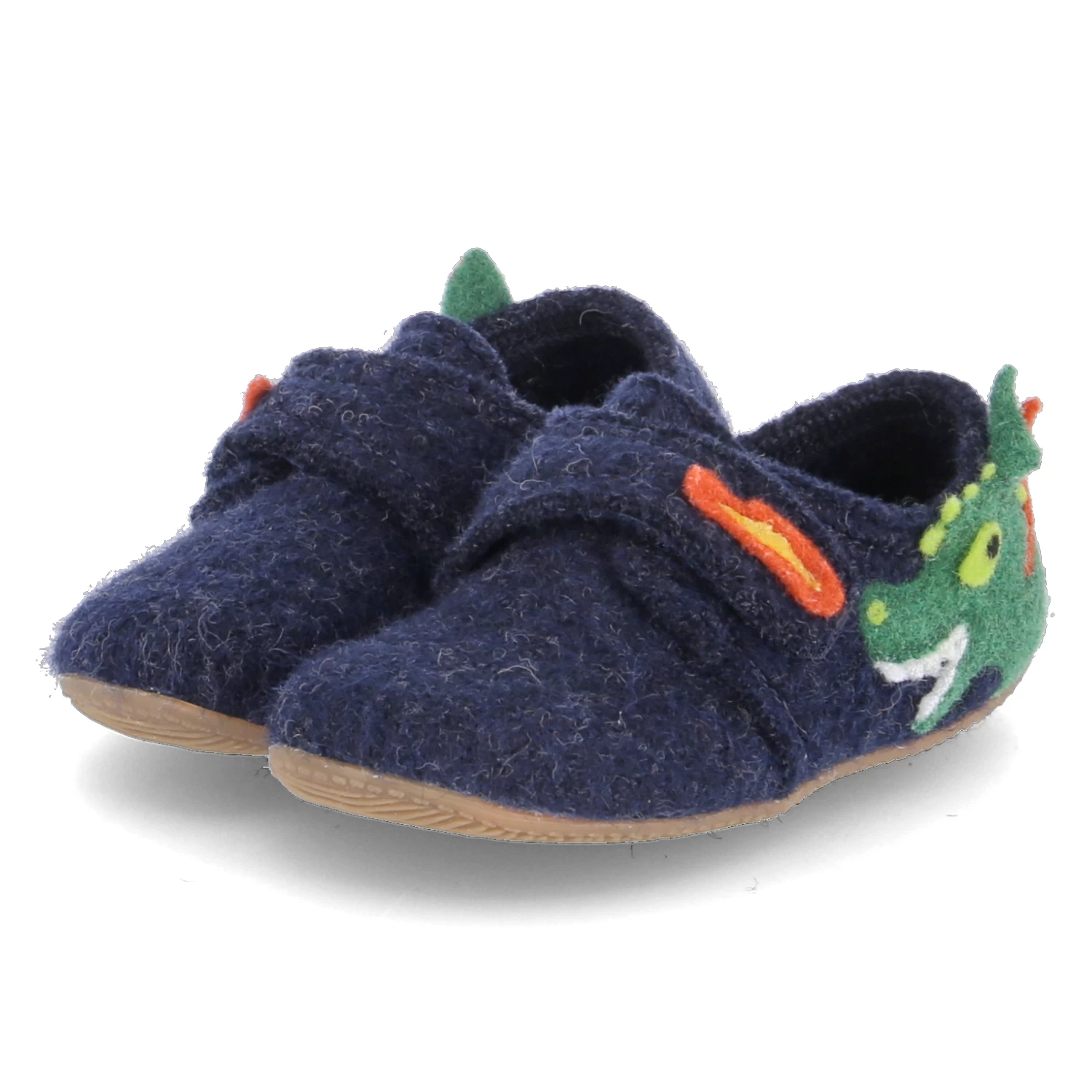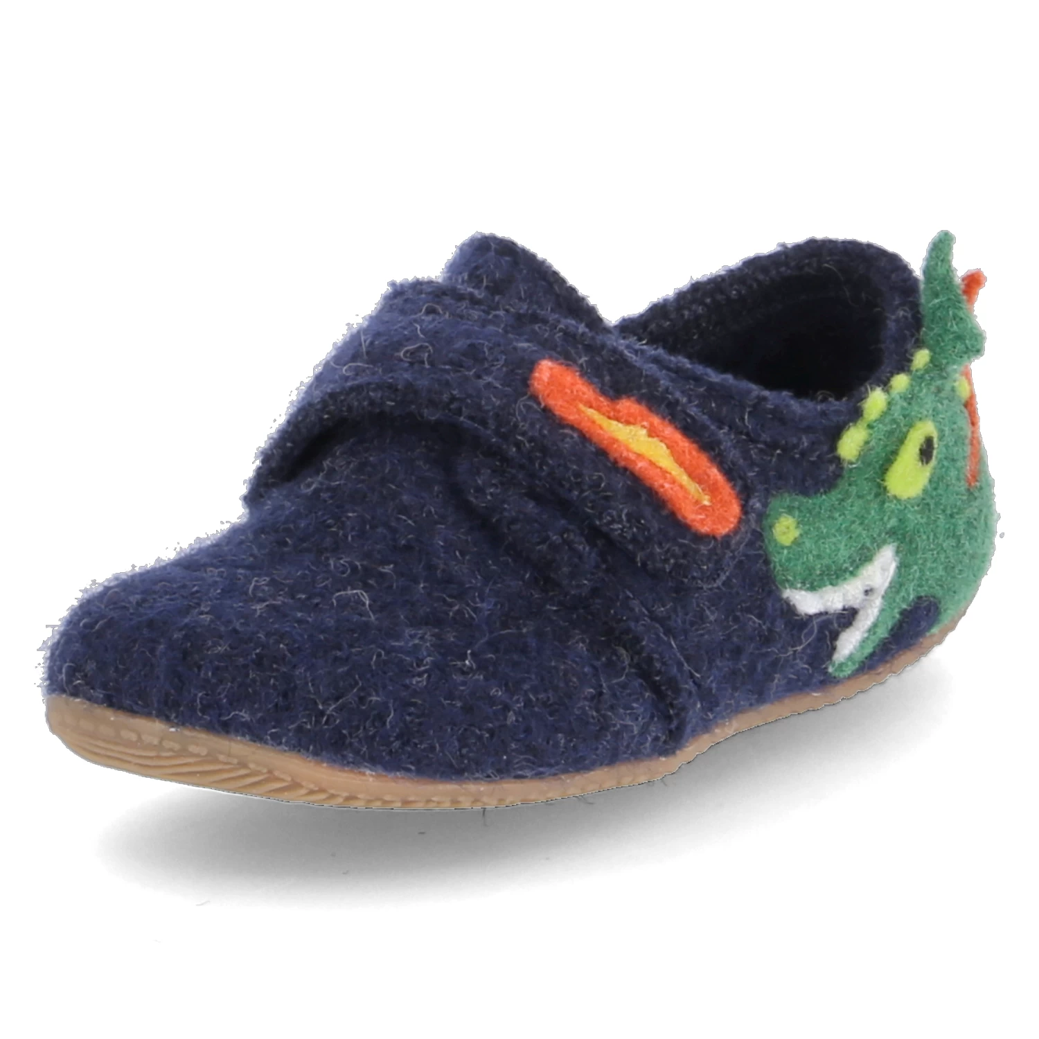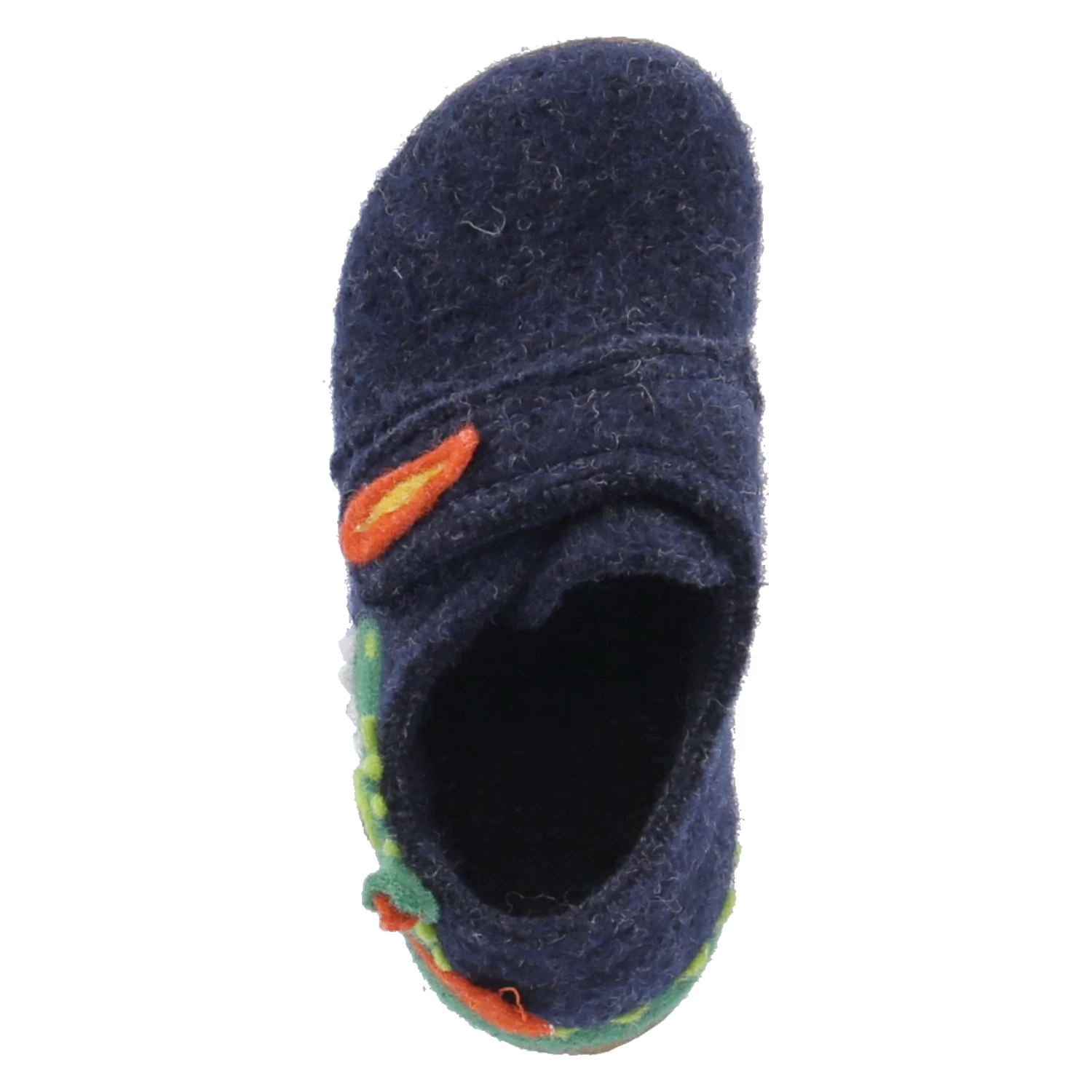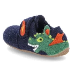 Living Kitzbühel Kinder Hausschuhe Blau Schurwolle – aufgenähtes Drachenmotiv – Klettverschlussriemen – verstärkte Ferse – sehrflexible und rutschhemmende Laufsohle