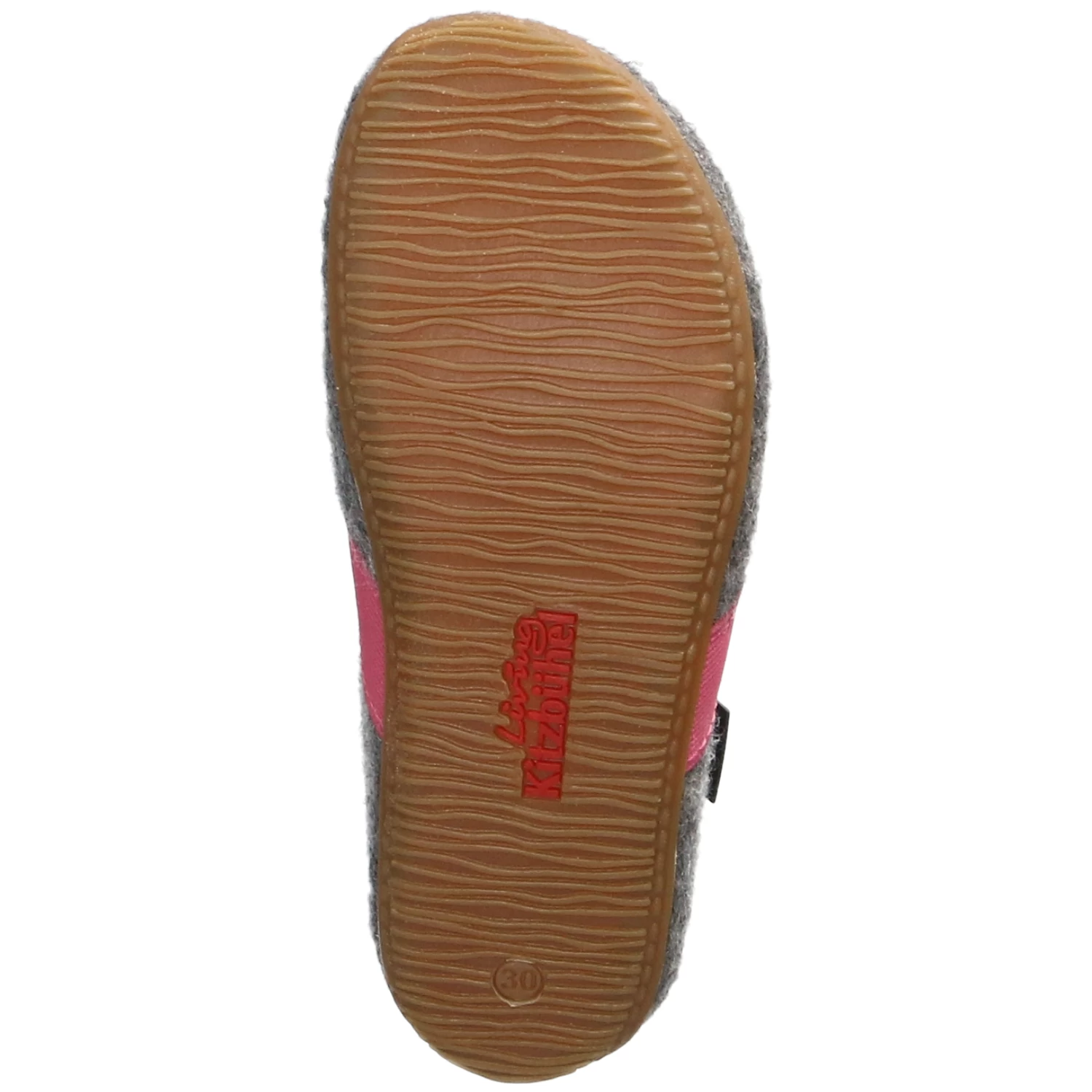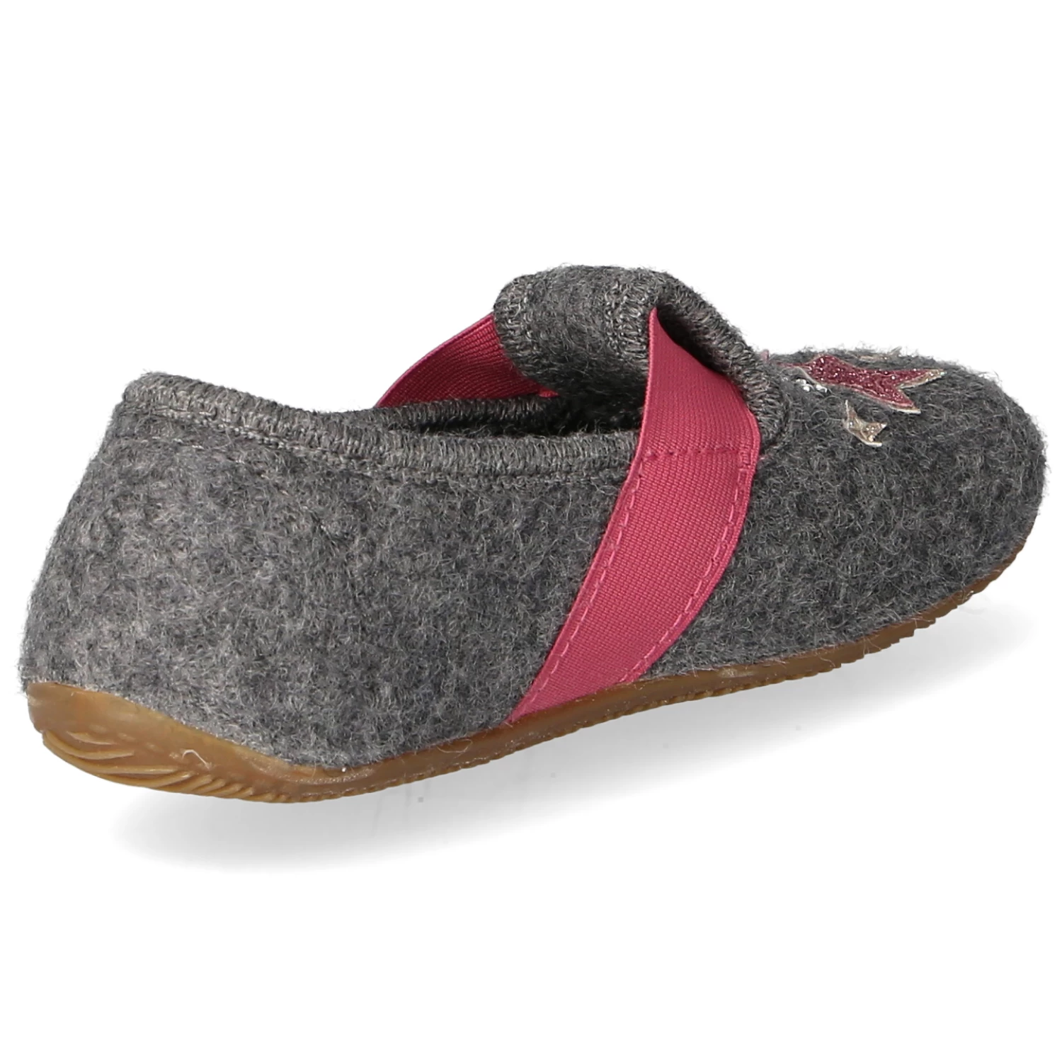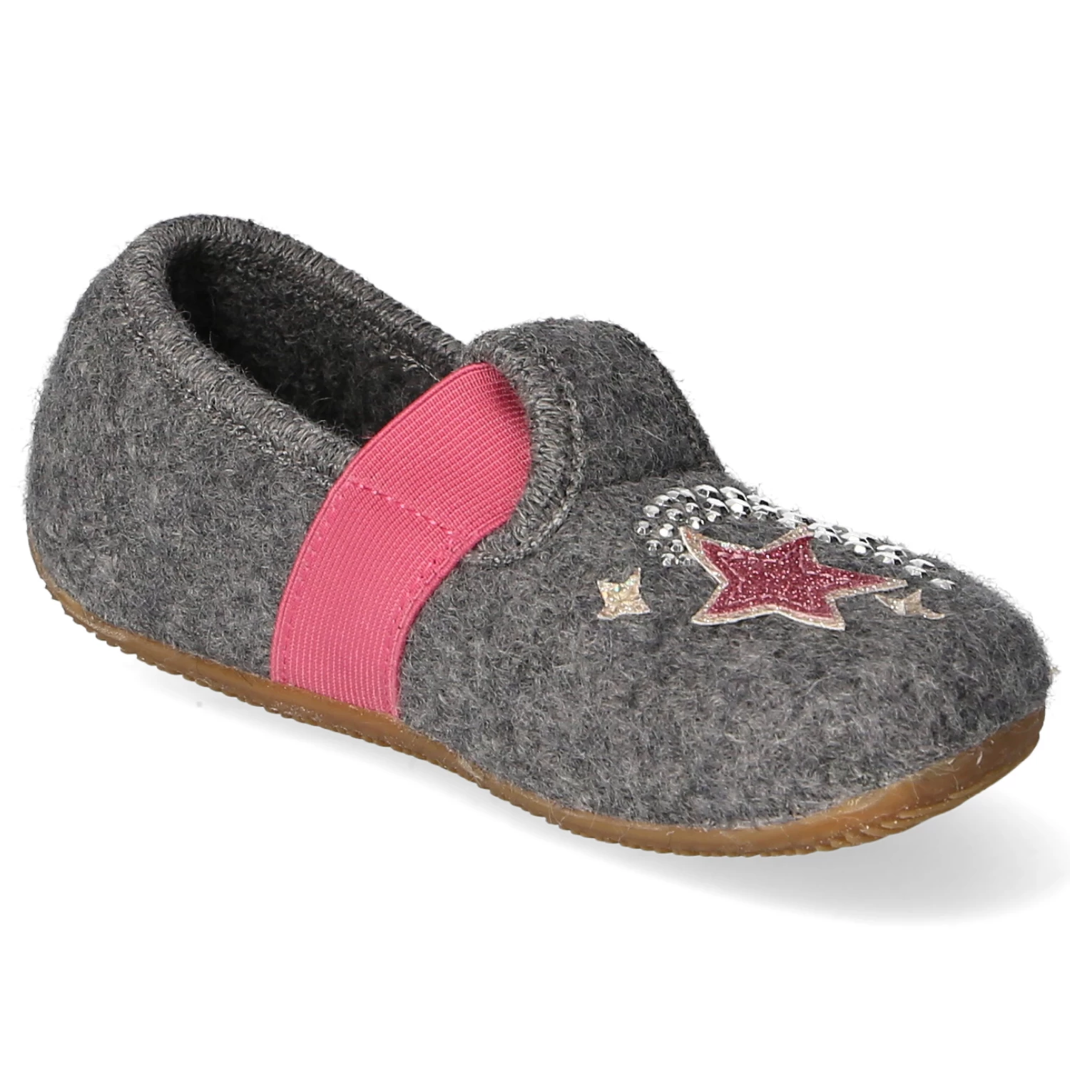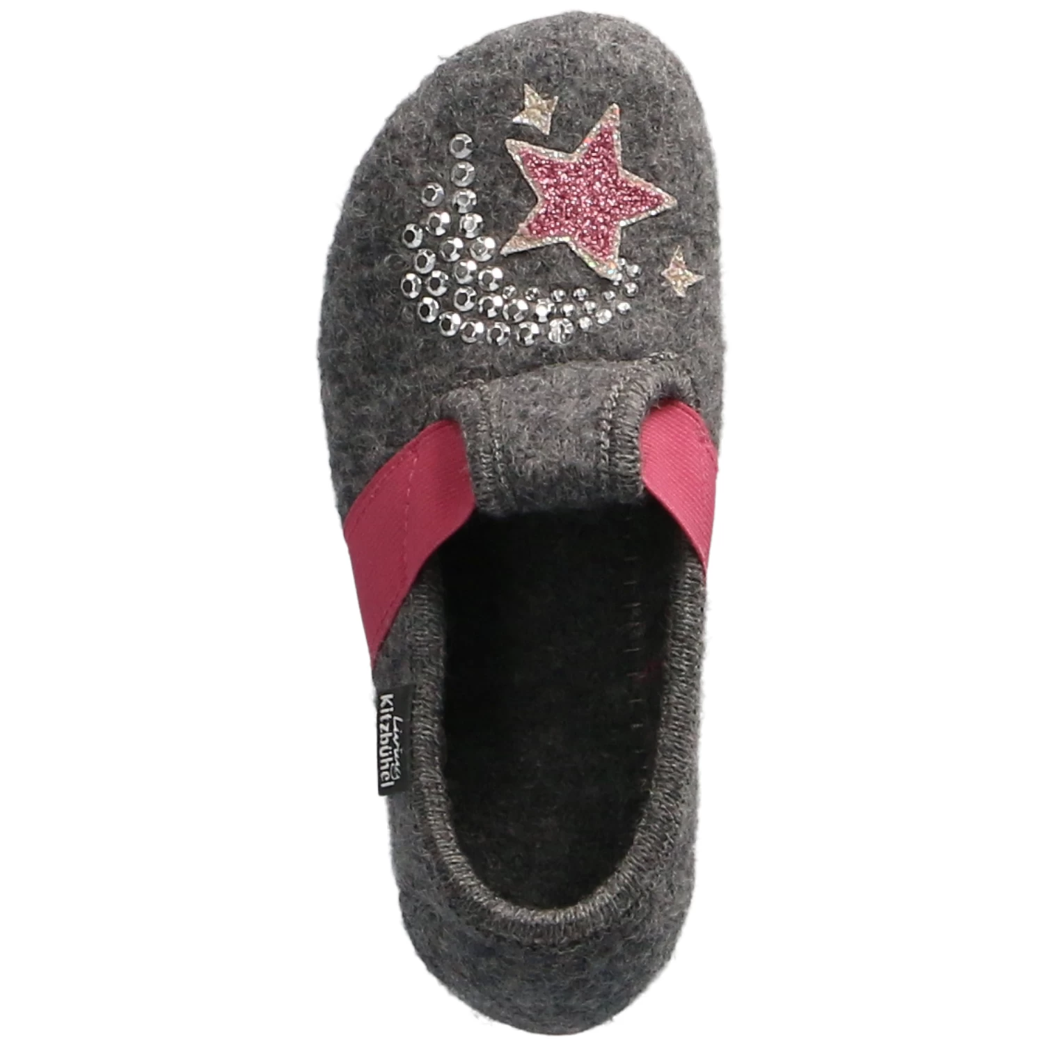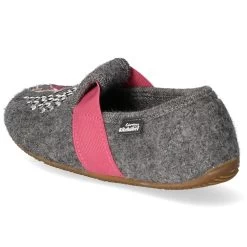 Living Kitzbühel Mädchen Hausschuhe Grau Filz – elastisches Band auf dem Spann – verschiedene Applikationen im Zehenbereich – Logoaufnäher auf der Außenseite – Elastiksaum im Einstiegsbereich – flexible und ultraleichte Laufsohle mit rutschhemmende Eigenschaften