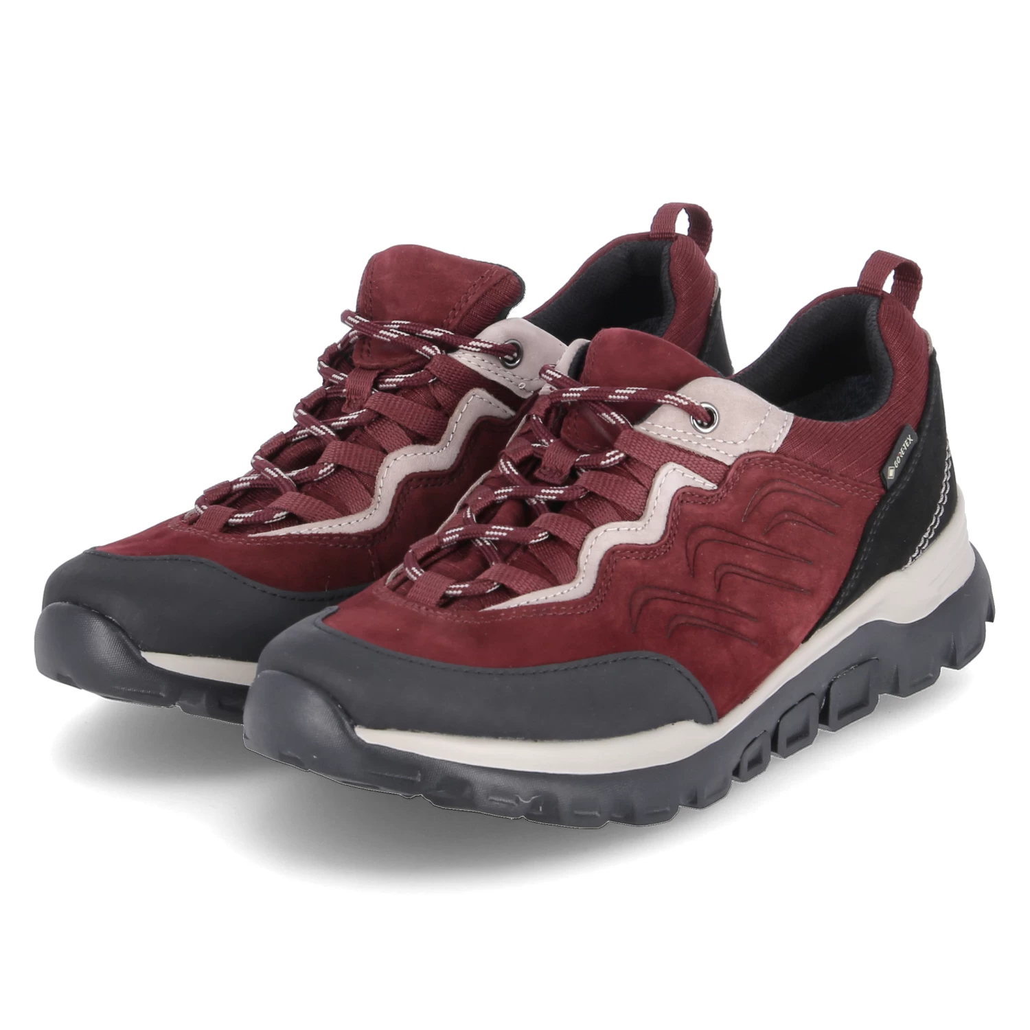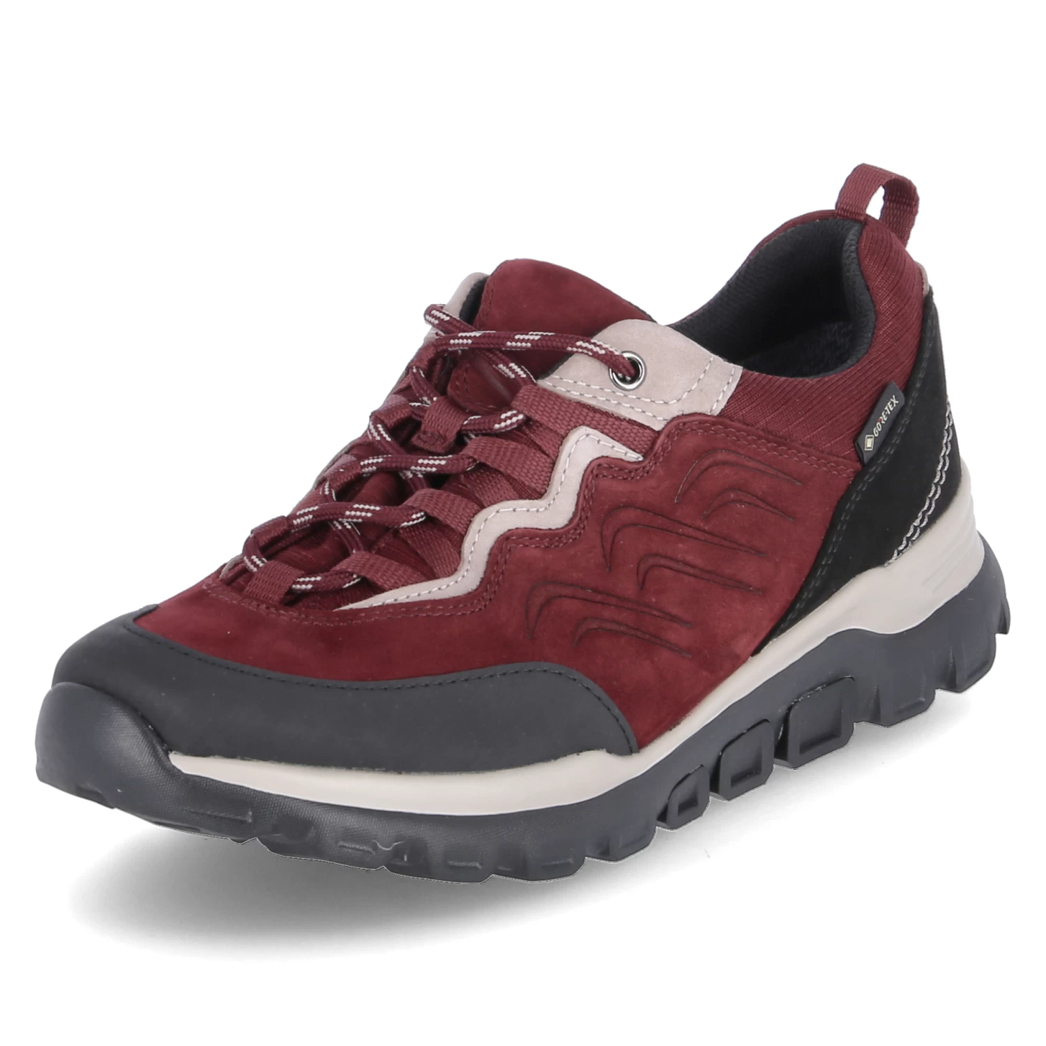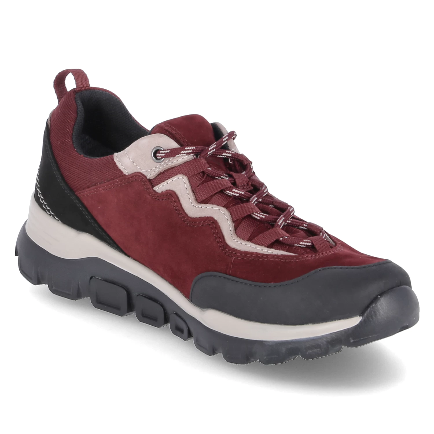 Gabor Rollingsoft Damen Wanderschuhe/ Low Sneaker Rot Rauleder-Textil-Mix – wasserfest, atmungsaktiv (Goretex) – SchnĂĽrung – verstärkter Zehen- und Fersenbereich – gepolsterter Einstieg – Zierstreifen und Prägungen – gepolstertes WechselfuĂźbett – flexible, rutschhemmende Lauftsohle