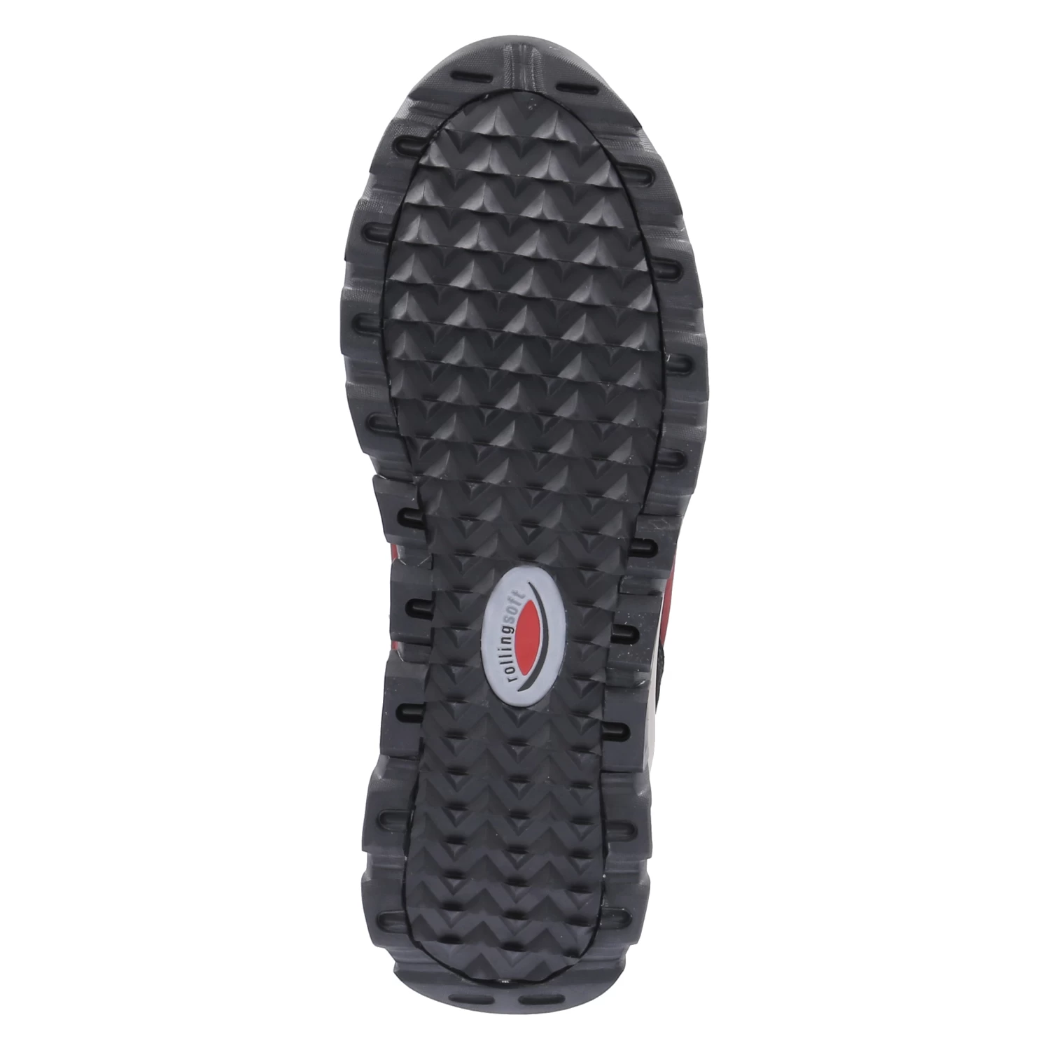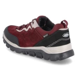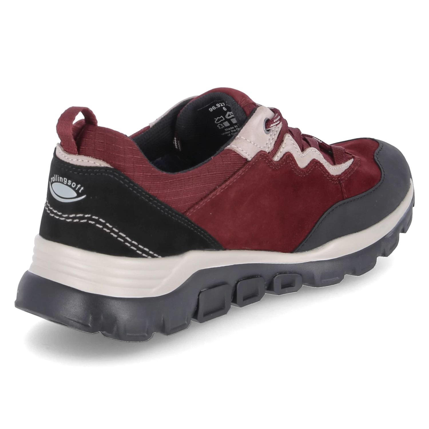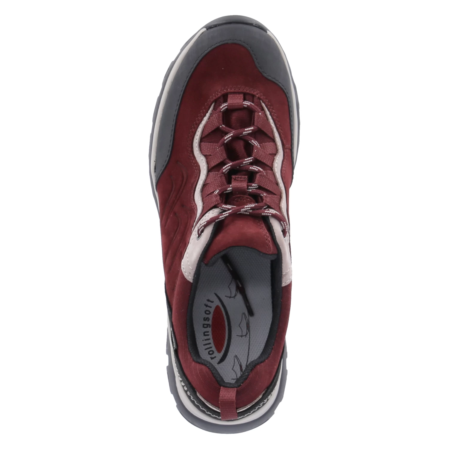 Gabor Rollingsoft Damen Wanderschuhe/ Low Sneaker Rot Rauleder-Textil-Mix – wasserfest, atmungsaktiv (Goretex) – SchnĂĽrung – verstärkter Zehen- und Fersenbereich – gepolsterter Einstieg – Zierstreifen und Prägungen – gepolstertes WechselfuĂźbett – flexible, rutschhemmende Lauftsohle